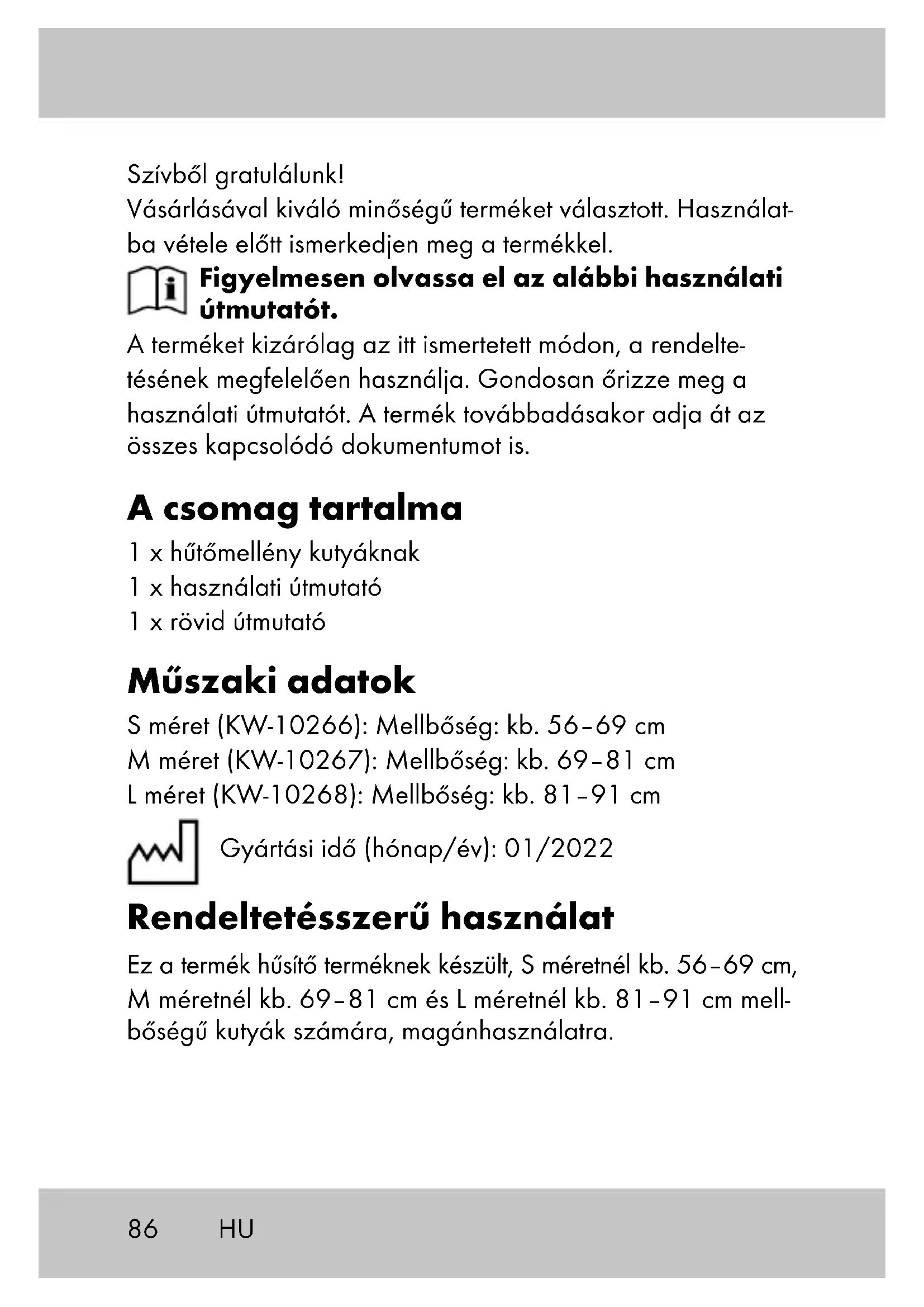 HU91 Tárolás, tisztítás A működőképesség érdekében a terméket rendszeresen me- chanikusan meg kell tisztítani. A terméket mindig száraz, tiszta és szobahőmérsékletű helyen tárolja, ha azt nem használja. Enyhe szennyeződés esetén vízzel tisztítsa meg, majd törölje szárazra egy tisztítókendővel. FONTOS! Ne használjon éles tisztítószereket a tisztításhoz. Ha a háziállat megbetegszik, illetve miután felépült egy betegségből, akkor a terméket fertőtleníteni kell. Konzultál- jon az állatorvosával és kérdezze a megfelelő higiéniás és fertőtlenítőszerekről. Tudnivalók a hulladékkezelésről Az árucikket és a csomagolóanyagot az érvényes helyi előírásoknak megfelelően ártalmatlanítsa. A csomagoló- anyagok, pl. nylonzacskók, nem kerülhetnek gyermekek kezébe. A csomagolóanyagot gyermekek számára hozzá nem férhető helyen tárolja. A terméket és csomagolását környezetbarát módon selejtezze le. Az újrahasznosító kód a különböző anyagokat jelöli, hogy azok nyersanyagként újrahasznosíthatók legyenek. A kód az újrahasznosítás jelből - értsd: az újrahasznosítás körforgás jelölése - és egy számból áll, ami adott anyagot jelöl. HU92 A garanciával és a szerviz lebonyolí- tásával kapcsolatos útmutató A termék nagy gondossággal és állandó ellenőrzés mellett készült. A DELTA-SPORT HANDELSKONTOR GmbH privát végső felhasználóknak a vásárlás dátumától számított három év (garancia időtartama) garanciát ad erre a termékre a kö- vetkező rendelkezések szerint. A garancia csak anyaghibára és feldolgozási hibára érvényes. A garancia nem terjed ki a szokásos elhasználódásnak kitett, ezért kopó alkatrésznek tekintendő alkatrészekre (pl. elemek), valamint a törékeny alkatrészekre sem, például a kapcsolókra, az akkumulátorok- ra vagy az üvegből készült alkatrészekre. Kizárásra kerül a garanciaigény, ha a terméket szakszerűt- lenül vagy helytelenül, nem rendeltetésszerűen vagy nem az előirányzott felhasználási körben használták, vagy figyelmen kívül hagyták a kezelési útmutató előírásait, kivéve, ha a végső felhasználó bizonyítja, hogy olyan anyag- vagy feldol- gozási hiba áll fenn, amely nem a fent említett körülmények valamelyikéből ered. A garanciaigény csak a garancia időtartamán belül, az eredeti pénztári bizonylat bemutatásával érvényesíthető. Ezért kérjük, őrizze meg az eredeti pénztári bizonylatot. A garancia, a törvényes garancia vagy a méltányosság alapján végzett esetleges javítások a garancia időtartamát nem hosszabbítják meg. Ez vonatkozik a kicserélt és javított alkatrészekre is. HU93 Kérjük, hogy reklamáció esetén először az alábbi szerviz- vonalat hívja, vagy e-mailen keressen minket. Garanciális esetekben a terméket saját döntésünk alapján ingyenesen megjavítjuk, kicseréljük vagy megtérítjük a vételárat. A garan- ciából további jogok nem következnek. A jelen garancia nem korlátozza az Ön törvényes jogait, különösen a mindenkori értékesítővel szembeni garanciaigé- nyét. IAN: 389124_2107 Szerviz Magyarország Tel.: 06800 21225 E-Mail: deltasport@lidl.hu HU94 Čestitamo! Z nakupom ste se odločili za visokokakovosten izdelek. Pred prvo uporabo se seznanite z izdelkom. V ta namen natančno preberite naslednje navodilo za uporabo. Izdelek uporabljajte, kot je opisano, in za navedena pod- ročja uporabe. To navodilo za uporabo skrbno hranite. Če boste izdelek predali tretjim osebam, zraven priložite vso dokumentacijo. Obseg dobave 1 x hladilni telovnik za pse 1 x navodilo za uporabo 1 x kratka navodila Tehnični podatki Velikost S (KW-10266): Obseg prsnega koša: pribl. 56–69 cm Velikost M (KW-10267): Obseg prsnega koša: pribl. 69–81 cm Velikost L (KW-10268): Obseg prsnega koša: pribl. 81–91 cm Datum izdelave (mesec/leto): 01/2022 SI95 Namenska uporaba Ta izdelek je zasnovan kot hladilni izdelek za pse z obsegom prsnega koša približno 56–69 cm pri velikosti S, približno 69–81 cm pri velikosti M in približno 81–91 cm pri velikosti L. Izdelek je predviden za zasebno uporabo. Varnostni napotki Nevarnost telesnih poškodb!
