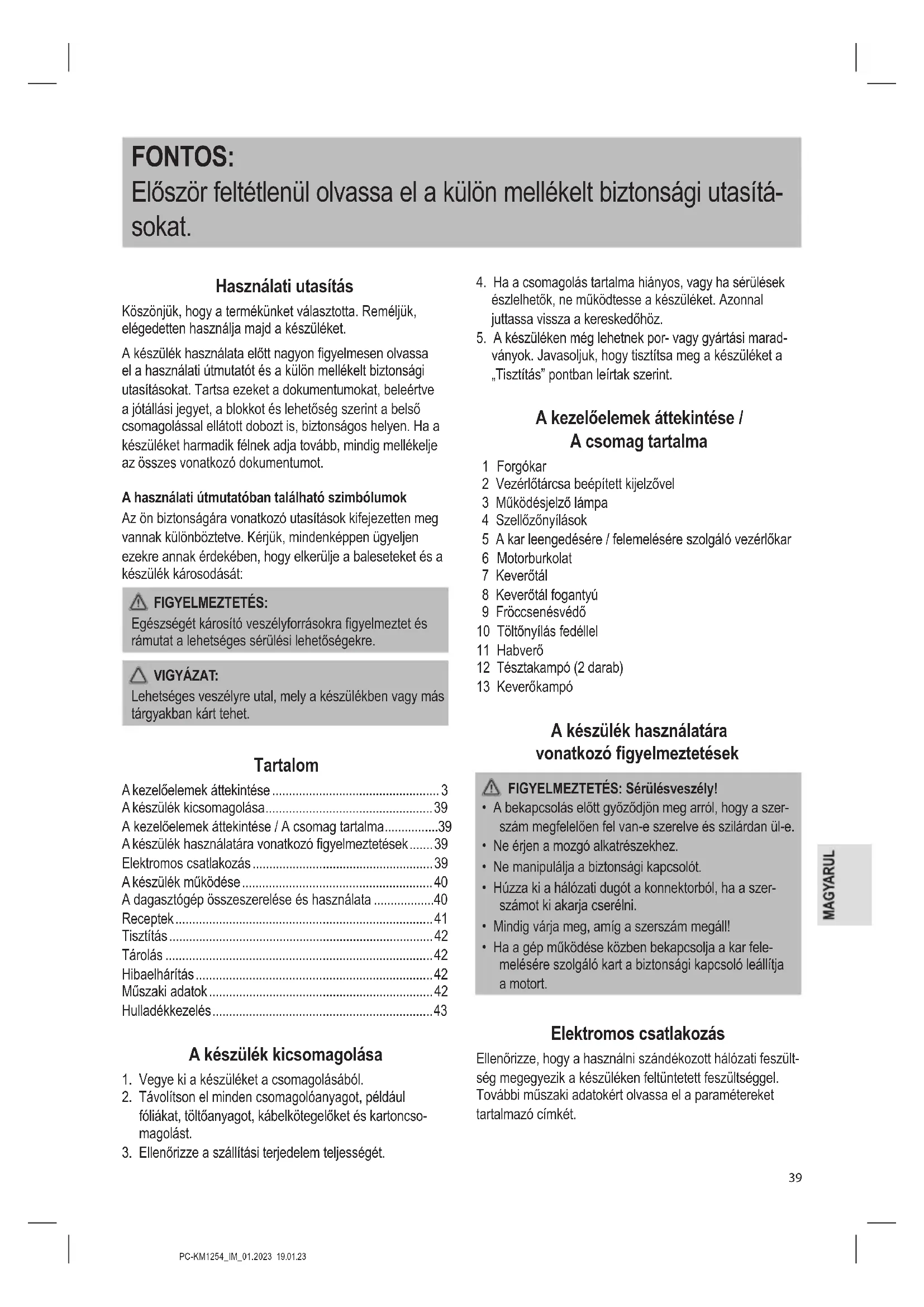 - A kezelőelemek áttekintése / A csomag tartalma p. 39