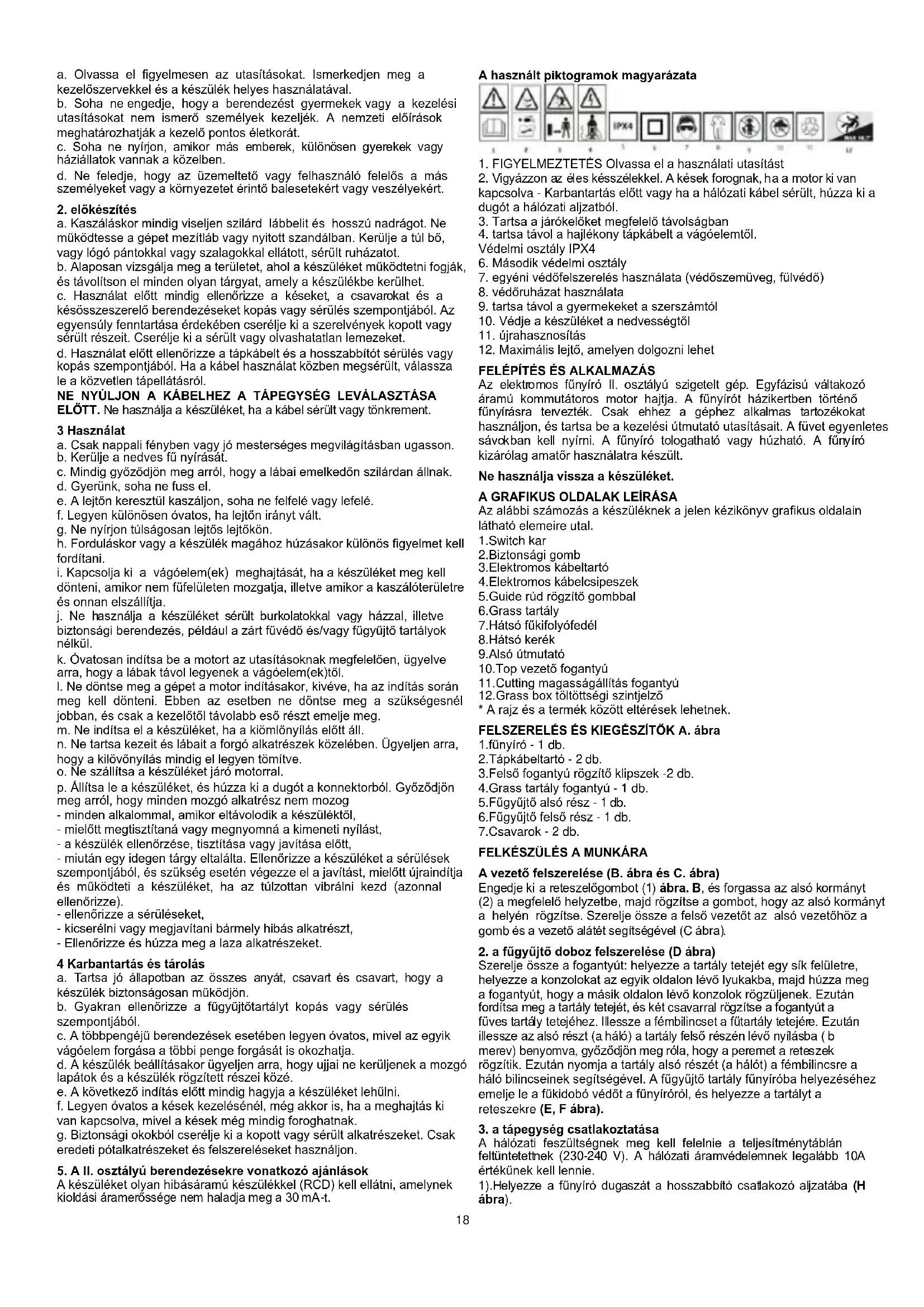 a. Olvassa el figyelmesen az utasításokat. Ismerkedjen meg a kezelőszervekkel és a készülék helyes használatával. b. Soha ne engedje, hogy a berendezést gyermekek vagy a kezelési utasításokat nem ismerő személyek kezeljék. A nemzeti előírások meghatározhatják a kezelő pontos életkorát. c. Soha ne nyírjon, amikor más emberek, különösen gyerekek vagy háziállatok vannak a közelben. d. Ne feledje, hogy az üzemeltető vagy felhasználó felelős a más személyeket vagy a környezetet érintő balesetekért vagy veszélyekért.