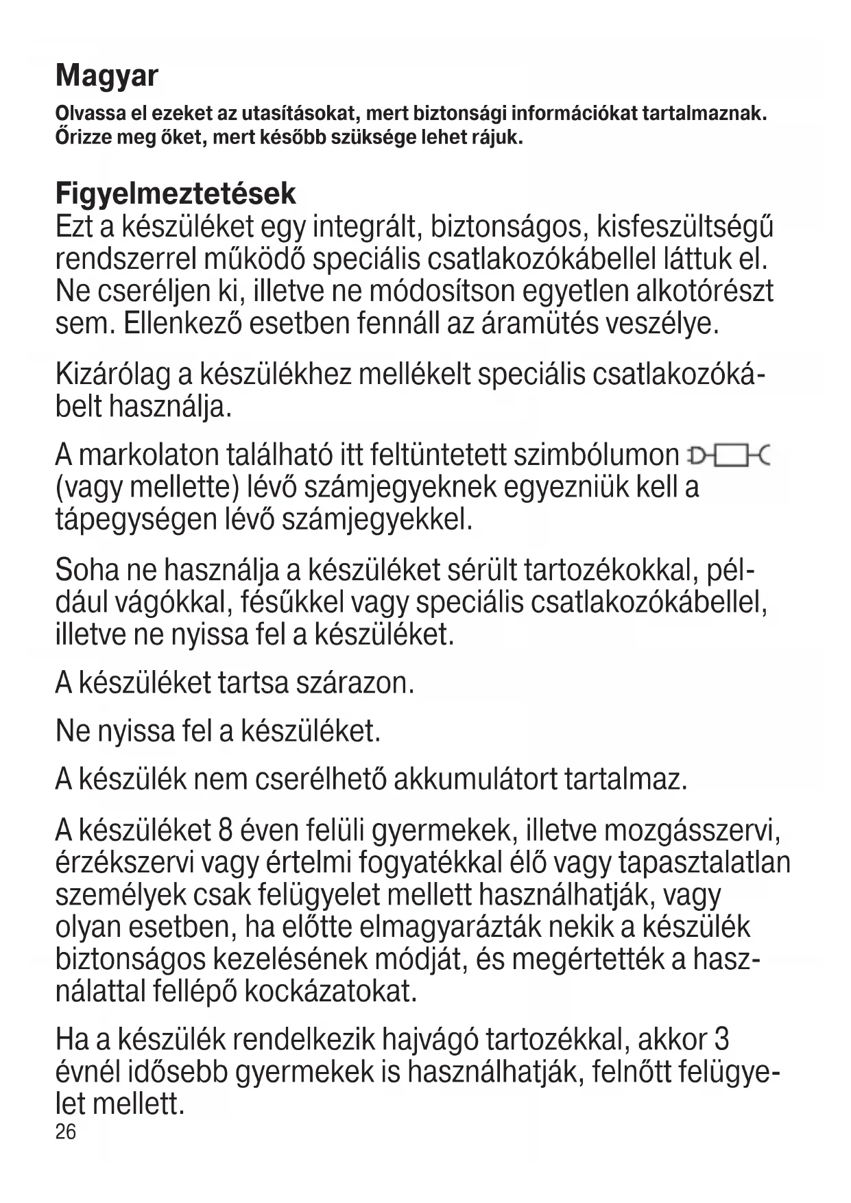 - nie pri všetkých modeloch ** vzhľad sa môže líšiť Elektrické špecifikácie nájdete na štítku špeciálneho napájacieho kábla. Upozornenie týkajúce sa životného prostredia Tento prístroj obsahuje batérie a/alebo recyklovateľný elektronický odpad. V záujme ochrany životného prostredia prístroj nelikvidujte s domovým odpadom, ale ho odovzdajte na zbernom mieste pre elektronický odpad. Informácie sa môžu zmeniť bez upozornenia. Deklarovaná hodnota emisie hluku tohto spotrebiča je 63 dB(A), čo predstavuje hladinu A akustického výkonu vzhľadom na referenčný akustický výkon 1 pW. 90340910_Type5516_BT3421_3420_3411_3410_3400x_CEEMEA.indd 2490340910_Type5516_BT3421_3420_3411_3410_3400x_CEEMEA.indd 24 20.07.22 10:0320.07.22 10:0325 Záruka Poskytujeme dvojročnú záruku na výrobok s platnosťou od dátumu jeho zakúpenia. V záručnej lehote bezplatne odstránime všetky poruchy prístroja zapríčinené chybou materiálu alebo výroby, a to buď formou opravy, alebo výmenou celého prístroja (podľa nášho vlastného uváženia). V závislosti od dostupnosti náhradnej jednotky môže ísť o odlišnú farbu alebo ekvivalentný model. Uvedená záruka je platná v každom štáte, v kto- rom tento prístroj dodáva spoločnosť Braun alebo jej poverený distribútor. Záruka sa netýka nasledujúcich prípadov: poškodenie zapríčinené nesprávnym použitím, normálne opotrebovanie (napríklad plátkov holiaceho strojčeka alebo puzdra zastrihá- vača), ako aj poruchy, ktoré majú zanedbateľný účinok na hodnotu alebo funkciu prí- stroja. Ak opravu uskutoční neautorizovaná osoba a ak sa nepoužijú pôvodné náhradné súčiastky spoločnosti Braun, platnosť záruky bude ukončená. Ak v záručnej lehote požadujete vykonanie servisnej opravy, odovzdajte celý prístroj s potvrdením o nákupe v autorizovanom servisnom stredisku spoločnosti Braun alebo ho do strediska zašlite. 90340910_Type5516_BT3421_3420_3411_3410_3400x_CEEMEA.indd 2590340910_Type5516_BT3421_3420_3411_3410_3400x_CEEMEA.indd 25 20.07.22 10:0320.07.22 10:0326 Magyar Olvassa el ezeket az utasításokat, mert biztonsági információkat tartalmaznak. Őrizze meg őket, mert később szüksége lehet rájuk. Figyelmeztetések Ezt a készüléket egy integrált, biztonságos, kisfeszültségű rendszerrel működő speciális csatlakozókábellel láttuk el. Ne cseréljen ki, illetve ne módosítson egyetlen alkotórészt sem. Ellenkező esetben fennáll az áramütés veszélye. Kizárólag a készülékhez mellékelt speciális csatlakozóká- belt használja. A markolaton található itt feltüntetett szimbólumon (vagy mellette) lévő számjegyeknek egyezniük kell a tápegységen lévő számjegyekkel. Soha ne használja a készüléket sérült tartozékokkal, pél- dául vágókkal, fésűkkel vagy speciális csatlakozókábellel, illetve ne nyissa fel a készüléket. A készüléket tartsa szárazon. Ne nyissa fel a készüléket. A készülék nem cserélhető akkumulátort tartalmaz. A készüléket 8 éven felüli gyermekek, illetve mozgásszervi, érzékszervi vagy értelmi fogyatékkal élő vagy tapasztalatlan személyek csak felügyelet mellett használhatják, vagy olyan esetben, ha előtte elmagyarázták nekik a készülék biztonságos kezelésének módját, és megértették a hasz- nálattal fellépő kockázatokat. Ha a készülék rendelkezik hajvágó tartozékkal, akkor 3 évnél idősebb gyermekek is használhatják, felnőtt felügye- let mellett. 90340910_Type5516_BT3421_3420_3411_3410_3400x_CEEMEA.indd 2690340910_Type5516_BT3421_3420_3411_3410_3400x_CEEMEA.indd 26 20.07.22 10:0320.07.22 10:0327 A készülékkel gyermekek nem játszhatnak! A tisztítást és karbantartást gyermekek nem végezhetik! Csak háztartási használatra! Vigyázat! Töltéskor győződjön meg arról, hogy a készülék kikapcsolt állapotban van! Fontos! A töltés 5 és 35 °C közötti hőmérsékleten javasolt. Előfordulhat, hogy szélsőségesen ala- csony vagy magas hőmérsékleten az akkumulátor nem megfelelően vagy egyáltalán nem tölt fel. A nyírás 15 és 35 °C közötti hőmérsékleten javasolt. A készüléket ne tegye ki hosszabb ideig 50 °C-nál magasabb hőmérsékletnek. A tartozékok megfelelő működéséhez rendszeresen olajozza meg a nyírót és a szitát egy csepp (nem tartozék) híg gépolajjal. A készülék leírása 1a Nyírófej*/** 1b Precíziós nyírófej*/** 1c Mini szitás borotvafej* 2 Hosszválasztó 3 Be-/kikapcsológomb 4 Tápcsatlakozó 5 Tápegység** 6 Töltés jelzőfénye 7 Precíziós szakállfésű (0,5–10 mm)*/** 8 Precíziós hajfésű (10,5–20 mm)*/**