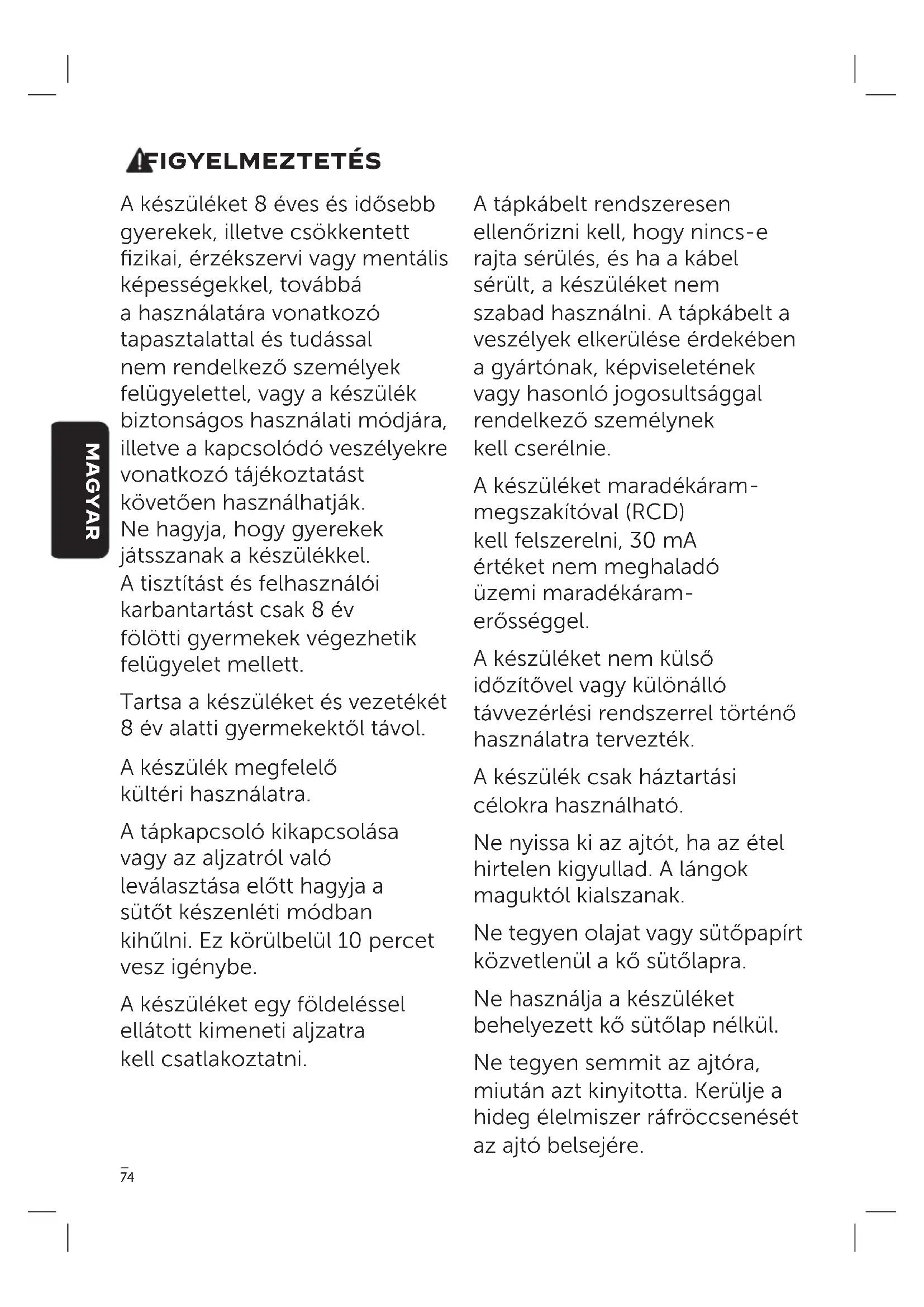 HRVATSKI74 FIGYELMEZTETÉS A készüléket 8 éves és idősebb gyerekek, illetve csökkentett fizikai, érzékszervi vagy mentális képességekkel, továbbá a használatára vonatkozó tapasztalattal és tudással nem rendelkező személyek felügyelettel, vagy a készülék biztonságos használati módjára, illetve a kapcsolódó veszélyekre vonatkozó tájékoztatást követően használhatják. Ne hagyja, hogy gyerekek játsszanak a készülékkel. A tisztítást és felhasználói karbantartást csak 8 év fölötti gyermekek végezhetik felügyelet mellett. Tartsa a készüléket és vezetékét 8 év alatti gyermekektől távol. A készülék megfelelő kültéri használatra. A tápkapcsoló kikapcsolása vagy az aljzatról való leválasztása előtt hagyja a sütőt készenléti módban kihűlni. Ez körülbelül 10 percet vesz igénybe. A készüléket egy földeléssel ellátott kimeneti aljzatra kell csatlakoztatni. A tápkábelt rendszeresen ellenőrizni kell, hogy nincs-e rajta sérülés, és ha a kábel sérült, a készüléket nem szabad használni. A tápkábelt a veszélyek elkerülése érdekében a gyártónak, képviseletének vagy hasonló jogosultsággal rendelkező személynek kell cserélnie. A készüléket maradékáram- megszakítóval (RCD) kell felszerelni, 30 mA értéket nem meghaladó üzemi maradékáram- erősséggel. A készüléket nem külső időzítővel vagy különálló távvezérlési rendszerrel történő használatra tervezték. A készülék csak háztartási célokra használható. Ne nyissa ki az ajtót, ha az étel hirtelen kigyullad. A lángok maguktól kialszanak. Ne tegyen olajat vagy sütőpapírt közvetlenül a kő sütőlapra. Ne használja a készüléket behelyezett kő sütőlap nélkül. Ne tegyen semmit az ajtóra, miután azt kinyitotta. Kerülje a hideg élelmiszer ráfröccsenését az ajtó belsejére. MAGYAR75