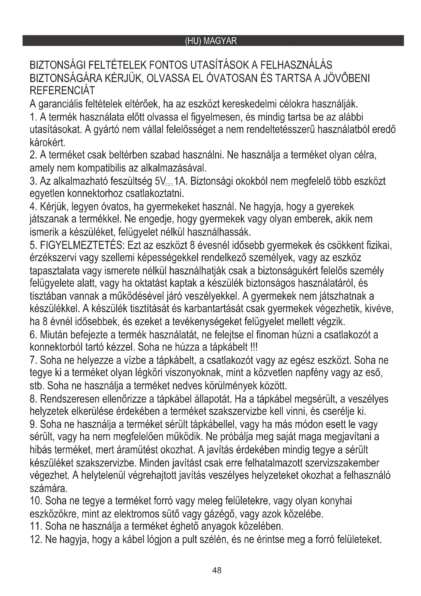 érzékszervi vagy szellemi képességekkel rendelkező személyek, vagy az eszköz tapasztalata vagy ismerete nélkül használhatják csak a biztonságukért felelős személy felügyelete alatt, vagy ha oktatást kaptak a készülék biztonságos használatáról, és tisztában vannak a működésével járó veszélyekkel. A gyermekek nem játszhatnak a készülékkel. A készülék tisztítását és karbantartását csak gyermekek végezhetik, kivéve, ha 8 évnél idősebbek, és ezeket a tevékenységeket felügyelet mellett végzik.