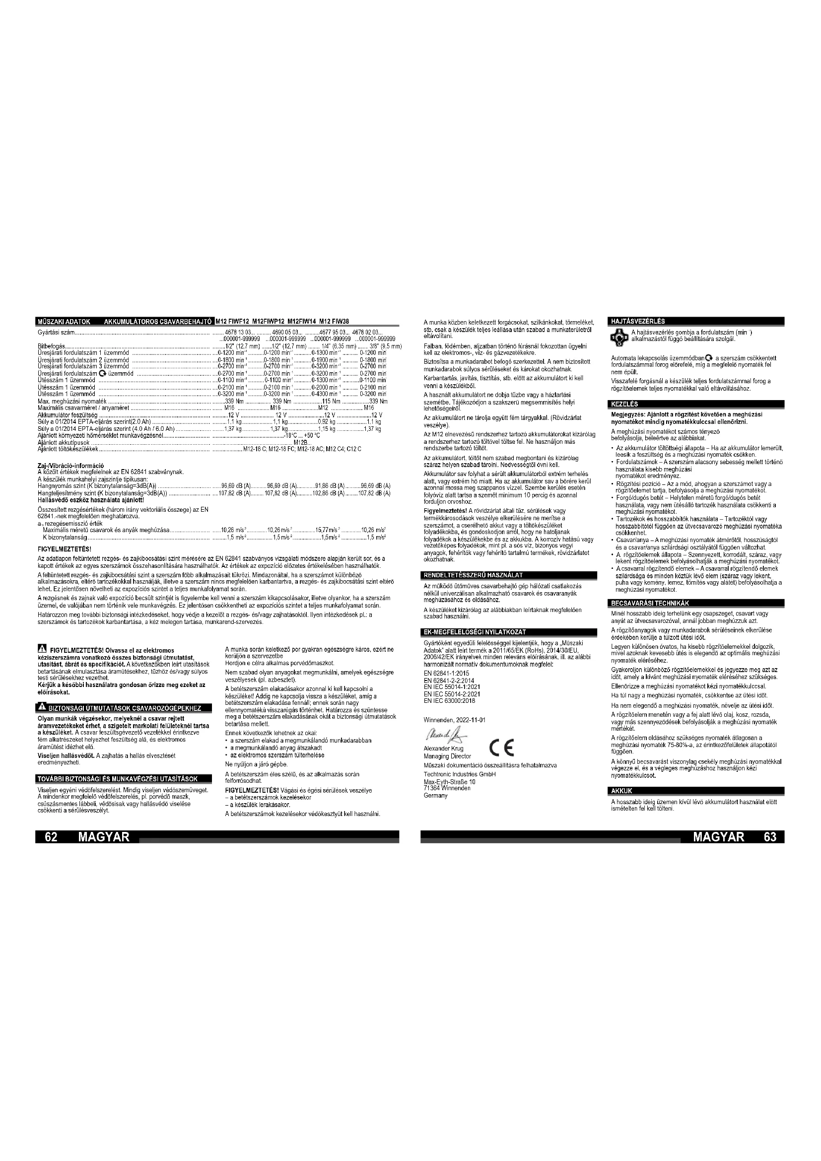 rezegésemisszió érték Maximális méretű csavarok és anyák meghúzása ......................... K bizonytalanság ............................................................................ FIGYELMEZTETÉS! Olvassa el az elektromos kéziszerszámra vonatkozó összes biztonsági útmutatást, utasítást, ábrát és specifi kációt. A következőkben leírt utasítások betartásának elmulasztása áramütésekhez, tűzhöz és/vagy súlyos testi sérülésekhez vezethet. Kérjük a későbbi használatra gondosan őrizze meg ezeket az előírásokat. BIZTONSÁGI ÚTMUTATÁSOK CSAVAROZÓGÉPEKHEZ Olyan munkák végzésekor, melyeknél a csavar rejtett áramvezetékeket érhet, a szigetelt markolati felületeknél tartsa a készüléket. A csavar feszültsgévezető vezetékkel érintkezve fém alkatrészeket helyezhet feszültség alá, és elektromos áramütést idézhet elő. Viseljen hallásvédőt. A zajhatás a hallás elvesztését eredményezheti. TOVÁBBI BIZTONSÁGI ÉS MUNKAVÉGZÉSI UTASÍTÁSOK Viseljen egyéni védőfelszerelést. Mindig viseljen védőszemüveget. A mindenkor megfelelő védőfelszerelés, pl. porvédő maszk, csúszásmentes lábbeli, védősisak vagy hallásvédő viselése csökkenti a sérülésveszélyt. A munka során keletkező por gyakran egészségre káros, ezért ne kerüljön a szervezetbe Hordjon e célra alkalmas porvédőmaszkot. Nem szabad olyan anyagokat megmunkálni, amelyek egészségre veszélyesek (pl. azbesztet). A betétszerszám elakadásakor azonnal ki kell kapcsolni a készüléket! Addig ne kapcsolja vissza a készüléket, amíg a betétszerszám elakadása fennáll; ennek során nagy ellennyomatékú visszarúgás történhet. Határozza és szüntesse meg a betétszerszám elakadásának okát a biztonsági útmutatások betartása mellett. Ennek következők lehetnek az okai: