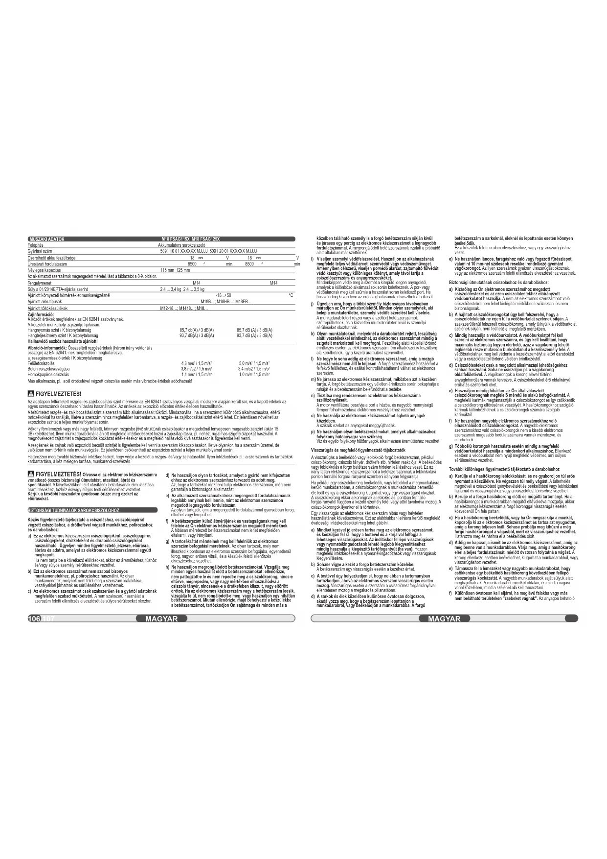 Közös fi gyelmeztető tájékoztató a csiszoláshoz, csiszolópapírral végzett csiszoláshoz, a drótkefével végzett munkákhoz, polírozáshoz és daraboláshoz: a) Ez az elektromos kéziszerszám csiszológépként, csiszolópapíros csiszológépként, drótkefeként és daraboló csiszológépként használható.. Ügyeljen minden fi gyelmeztető jelzésre, előírásra, ábrára és adatra, amelyet az elektromos kéziszerszámmal együtt megkapott. Ha nem tartja be a következő előírásokat, akkor ez áramütéshez, tűzhöz és/vagy súlyos személyi sérülésekhez vezethet. b) Ezt az elektromos szerszámot nem szabad bizonyos munkamenetekhez, pl. polírozáshoz használni. Az olyan munkamenetek, melynek nem felel meg a szerszám kialakítása, veszélyekkel járhatnak és sérülésekhez vezethetnek. c) Az elektromos szerszámot csak szakszerűen és a gyártói adatoknak megfelelően szabad működtetni. A nem szakszerű használat a szerszám feletti ellenőrzés elvesztését és súlyos sérüléseket okozhat. d) Ne használjon olyan tartozékot, amelyet a gyártó nem kifejezetten ehhez az elektromos szerszámhoz tervezett és adott meg. Az, hogy a tartozékot rögzíteni tudja elektromos szerszámán, még nem garantálja a biztonságos alkalmazást. e) Az alkalmazott szerszámalkatrész megengedett fordulatszámának legalább annyinak kell lennie, mint az elektromos szerszámon megadott legnagyobb fordulatszám. Az olyan tartozék, ami a megengedett fordulatszámnál gyorsabban forog, eltörhet vagy lerepülhet. f) A betétszerszám külső átmérőjének és vastagságának meg kell felelnie az Ön elektromos kéziszerszámán megadott méreteknek. A hibásan méretezett betétszerszámokat nem lehet megfelelően eltakarni, vagy irányítani. g) A tartozékrátét méreteinek meg kell felelniük az elektromos szerszám befogatási méreteinek. Az olyan tartozék, mely nem illeszkedik pontosan az elektromos szerszám befogójába, egyenetlenül forog, nagyon erősen vibrál, és a készülék feletti ellenőrzés elvesztéséhez vezethet. h) Ne használjon megrongálódott betétszerszámokat. Vizsgálja meg minden egyes használat előtt a betétszerszámokat: ellenőrizze, nem pattogzott-e le és nem repedt-e meg a csiszolókorong, nincs-e eltörve, megrepedve, vagy nagy mértékben elhasználódva a csiszoló tányér, nincsenek-e a drótkefében kilazult, vagy eltörött drótok. Ha az elektromos kéziszerszám vagy a betétszerszám leesik, vizsgálja felül, nem rongálódott-e meg, vagy használjon egy hibátlan betétszerszámot. Miután ellenőrizte, majd behelyezte a készülékbe a betétszerszámot, tartózkodjon Ön sajátmaga és minden más a Más alkalmazás, pl. acél drótkefével végzett csiszolás esetén más vibrációs értékek adódhatnak! FIGYELMEZTETÉS! Az adatlapon feltüntetett rezgés- és zajkibocsátási szint mérésére az EN 62841 szabványos vizsgálati módszere alapján került sor, és a kapott értékek az egyes szerszámok összehasonlítására használhatók. Az értékek az expozíció előzetes értékelésében használhatók. A feltüntetett rezgés- és zajkibocsátási szint a szerszám főbb alkalmazásait tükrözi. Mindazonáltal, ha a szerszámot különböző alkalmazásokra, eltérő tartozékokkal használják, illetve a szerszám nincs megfelelően karbantartva, a rezgés- és zajkibocsátási szint eltérő lehet. Ez jelentősen növelheti az expozíciós szintet a teljes munkafolyamat során. Vékony fémlemezek vagy más nagy felületű, könnyen rezgésbe jövő struktúrák csiszolásakor a megadottnál lényegesen magasabb zajszint (akár 15 dB) keletkezhet. Ilyen munkadaraboknál ajánlott megfelelő intézkedéseket hozni a zajcsillapításra, pl. nehéz, rugalmas szigetelőlapokat használni. A megnövekedett zajszintet a zajexpozíciós kockázat értékelésekor és a megfelelő hallásvédő kiválasztásakor is fi gyelembe kell venni. A rezgésnek és zajnak való expozíció becsült szintjét is fi gyelembe kell venni a szerszám kikapcsolásakor, illetve olyankor, ha a szerszám üzemel, de valójában nem történik vele munkavégzés. Ez jelentősen csökkentheti az expozíciós szintet a teljes munkafolyamat során. Határozzon meg további biztonsági intézkedéseket, hogy védje a kezelőt a rezgés- és/vagy zajhatásoktól. Ilyen intézkedések pl.: a szerszámok és tartozékok karbantartása, a kéz melegen tartása, munkarend-szervezés. Akkumulátors sarokcsiszoló MAGYAR108 109MAGYAR