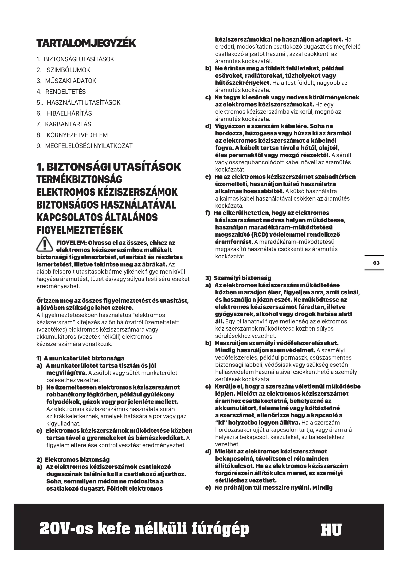 20V-os kefe nélküli fúrógép vigyázzon, hogy stabilan álljon, és őrizze meg egyensúlyát. Ez segít, hogy váratlan helyzetekben uralja az elektromos kéziszerszámot. f) Viseljen megfelelő öltözéket. Ne viseljen bő ruházatot vagy hosszú ékszert. Tartsa távol a haját és ruházatát a mozgó alkatrészektől. A bő ruházatot, hosszú ékszert vagy hosszú hajat bekaphatják a mozgó elemek. g) Ha a szerszámhoz porszívó vagy -gyűjtő is csatlakoztatható, gondoskodjon ezek megfelelő csatlakoztatásáról és használatáról. A porgyűjtő használatával csökkenthetőek a porral kapcsolatos kockázatok. h) Ne hagyja, hogy a szerszám gyakori használata túl elbizakodottá tegye, és hogy ezáltal figyelmen kívül hagyja a szerszám biztonsági követelményeit. A másodperc töredéke is elég ahhoz, hogy egy figyelmetlen mozdulat súlyos sérüléshez vezessen.