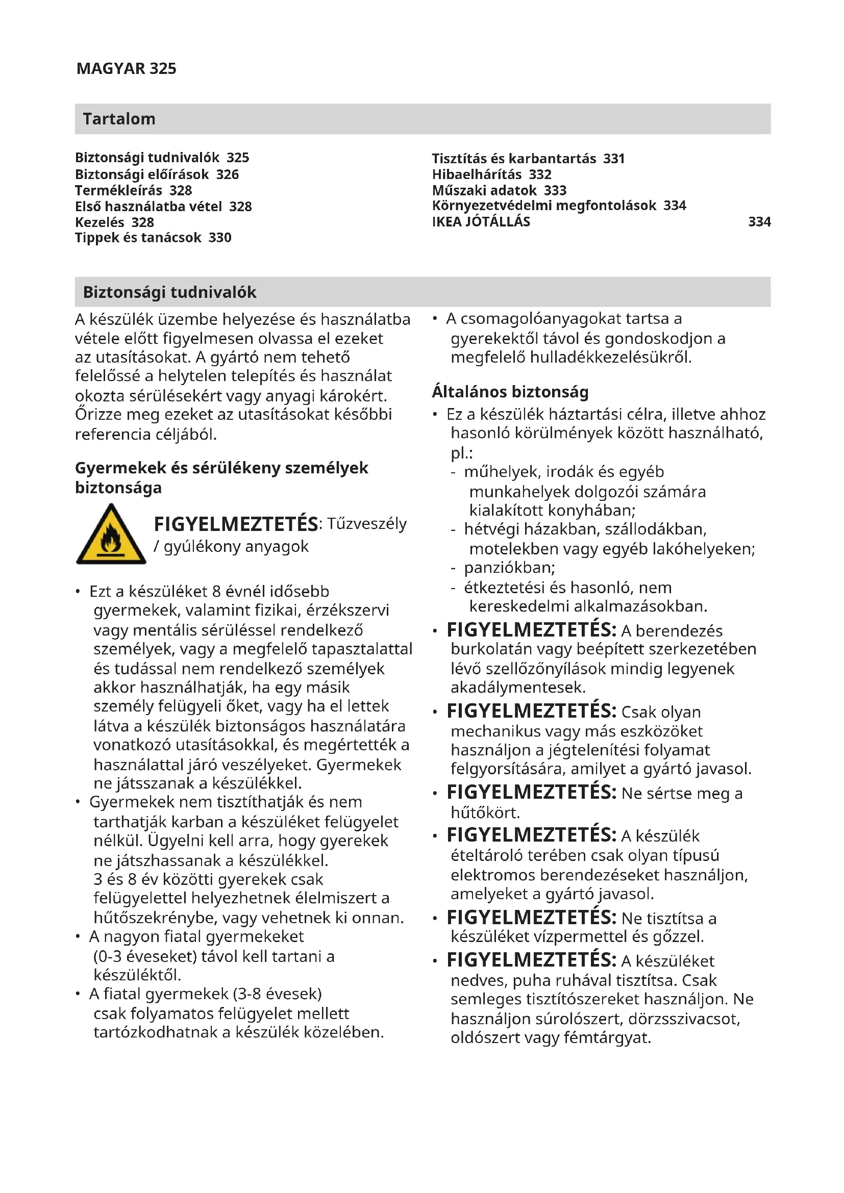 - az IKEA készülékek funkcióinak tisztázására irányuló kérdése van. Annak érdekében, hogy a leghatékonyabban tudjunk Önnek segíteni, kérjük, tanulmányozza át a az Összeszerelési utasítást és/vagy a Felhasználói kézikönyvet, mielőtt minket hív. Elérhetőségeink, ha szervizre van szüksége Az IKEA által kijelölt szervizek telefonszámait ennek a kézikönyvnek a végén találja. A gyorsabb szolgáltatás érdekében javasoljuk, hogy a kézikönyv végén felsorolt telefonszámokat használja. Mindig annak a készüléknek a kézikönyvében szereplő telefonszámokat használja, amellyel kapcsolatban segítségre van szüksége. Ne feledje megadni a készülék típustábláján található 8 jegyű cikkszámot és a 22 jegyű sorozatszámot.MAGYAR 336 ŐRIZZE MEG A VÁSÁRLÁSI BIZONYLATOT! Ez bizonyítja a vásárlást, és ez kell a jótállás érvényesítéséhez is. Minden egyes megvásárolt készülék vásárlási bizonylata tartalmazza a készülék IKEA nevét és cikkszámát (8 jegyű kód). Ezen túlmenő segítségre van szüksége? Ha bármilyen további, a készülék értékesítés utáni szervizelésével nem kapcsolatos kérdése van, kérjük, vegye fel a kapcsolatot a legközelebbi IKEA áruház telefonos ügyfélszolgálatával. Javasoljuk, hogy a hívás előtt alaposan olvassa el a készülék dokumentációját. Pótalkatrészek - A termosztát, a hőmérséklet-érzékelők, a nyomtatott áramkörök és a fényforrások az utolsó termék forgalomba kerülésétől számított legalább hét évig állnak a javítással foglalkozó szakemberek rendelkezésére. - Az ajtófogantyúk, ajtózsanérok, tálcák és kosarak az utolsó termék forgalomba kerülésétől számított legalább hét évig állnak a javítással foglalkozó szakemberek és a végfelhasználók rendelkezésére, az ajtótömítések pedig legalább 10 évig. Az alkatrészek itt találhatók: www.ikea.comÍSLENSKA 337 Efnisyrlit Öryggisupplýsingar Áður en heimilistækið er sett upp skal lesa leiðbeiningarnar vandlega. Framleiðandi er ekki ábyrgur fyrir rangri uppsetningu eða ef notkun veldur áverkum eða skemmdum. Alltaf skal geyma leiðbeiningarnar með heimilistækinu ef leita þarf í þær síðar. Öryggi barna og veikburða fólks VIÐVÖRUN: Eldhætta/Eldm efni