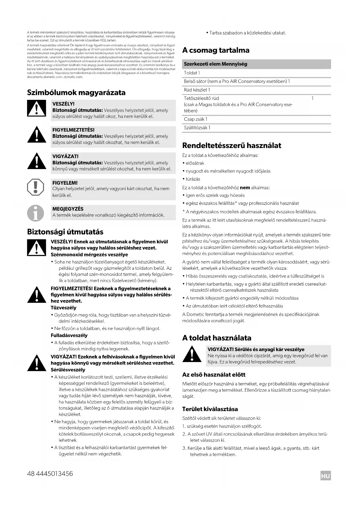 tehetnek a termékben. VESZÉLY! Biztonsági útmutatás: Veszélyes helyzetet jelöl, amely súlyos sérülést vagy halált okoz, ha nem kerülik el. FIGYELMEZTETÉS! Biztonsági útmutatás: Veszélyes helyzetet jelöl, amely súlyos sérülést vagy halált okozhat, ha nem kerülik el. VIGYÁZAT! Biztonsági útmutatás: Veszélyes helyzetet jelöl, amely könnyű vagy mérsékelt sérülést okozhat, ha nem kerülik el. FIGYELEM! Olyan helyzetet jelöl, amely vagyoni kárt okozhat, ha nem kerülik el. MEGJEGYZÉS A termék kezelésére vonatkozó kiegészítő információk. Szerkezeti elem Mennyiség Toldat 1 Belső sátor (nem a Pro AIR Conservatory esetében) 1 Rúd készlet 1 Tetőszélesítő rúd (csak a Magas toldatok és a Pro AIR Conservatory ese- tében)