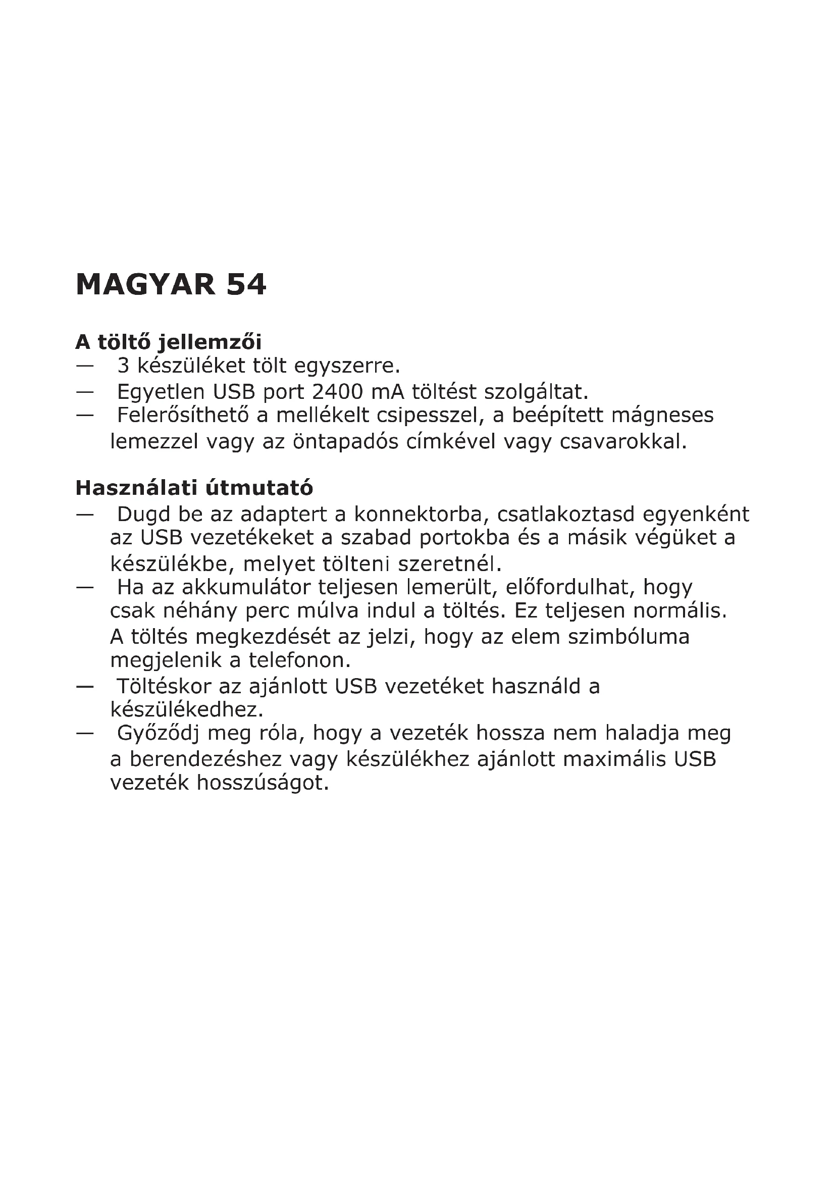 Tipo: E1605 LÖRBY Entrada: 24V DC Salida: 5V DC Para uso exclusivo en interiores Carga máxima total: 3400 mAh Carga máxima por toma USB: 2400 mAh Longitud máxima del cable USB: 1,5 m/4’11” Fabricante: IKEA of Sweden AB Dirección: Box 702, SE-343 81 Älmhult, SUECIA La imagen del cubo de basura tachado indica que el producto no debe formar parte de los residuos habituales del hogar. Se debe reciclar según la normativa local medioambiental de eliminación de residuos. Cuando separas los productos que llevan esta imagen, contribuyes a reducir el volumen de residuos que se incineran o se envían a vertederos y minimizas el impacto negativo sobre la salud y el medio ambiente. Para más información, ponte en contacto con tu tienda IKEA.ITALIANO 50 Caratteristiche del caricabatteria — Permette di ricaricare 3 dispositivi contemporaneamente. — Una singola porta USB fornisce no a 2400 mA. — Si può ssare con la clip fornita, con la piastra magnetica integrata, con l'etichetta adesiva o con le viti. Istruzioni per l'uso — Collega l'adattatore alla presa di corrente e inserisci i cavi USB, uno alla volta: un'estremità in una delle porte libere e l'altra estremità nel dispositivo che vuoi ricaricare. — Se la tua batteria è completamente scarica, può volerci qualche minuto prima che inizi a ricaricarsi: è normale. Inizia a ricaricarsi quando appare il simbolo della batteria sul tuo telefono. — Per la ricarica usa solo un cavo USB raccomandato per il tuo dispositivo. — Assicurati di non superare la lunghezza massima del cavo USB raccomandata per il dispositivo o il caricabatteria.51 Utile da sapere — La lunghezza e la qualità del cavo USB incidono sulla velocità e sulle prestazioni di ricarica. — Durante la ricarica i dispositivi possono scaldarsi: è normale. La temperatura si abbassa gradualmente una volta terminata la ricarica. — Il tempo di ricarica può variare in base alla capacità della batteria del dispositivo, al livello di carica, all'età della batteria e alla temperatura dell'ambiente circostante. — Temperatura nell'ambiente d'immagazzinamento: da -20°C a 25°C. — Temperatura di funzionamento del caricabatteria: da 0°C a 40°C. Scollega il caricabatteria dalla presa elettrica prima di pulirlo e quando non viene utilizzato. Usa un panno umido per pulire il caricabatteria. Non immergere mai il caricabatteria nell'acqua. Misure precauzionali raccomandate e dati tecnici: vedi il retro del caricabatteria. Conserva queste istruzioni per ulteriori consultazioni.52 AVVERTENZE: — La presa di corrente deve essere situata in prossimità del prodotto e deve essere facilmente accessibile. — Usa il prodotto in luoghi asciutti. — È necessaria la supervisione di un adulto per assicurarsi che i bambini non giochino con il prodotto. — Se il cavo si danneggia, il prodotto deve essere buttato via. — Non usare mai un cavo USB guasto o difettoso per ricaricare i tuoi dispositivi, poiché potresti danneggiare il caricabatteria e i tuoi dispositivi. Manutenzione del prodotto Non provare a riparare da solo questo prodotto, poiché l’apertura o la rimozione delle coperture può esporti al rischio di scossa elettrica o ad altri rischi.53 SPECIFICHE TECNICHE Tipo: E1605 LÖRBY Ingresso: 24V DC Uscita: 5V DC Solo per interni Carico max. totale: 3400 mA Carico max. per porta USB: 2400 mA Lunghezza max. cavo USB: 1,5 m/4’11” Produttore: IKEA of Sweden AB Indirizzo: Box 702, SE-343 81 Älmhult, SVEZIA Il simbolo del cassonetto barrato indica che il prodotto non può essere eliminato con i comuni riuti domestici. Il prodotto dev’essere riciclato nel rispetto delle norme ambientali locali per lo smaltimento dei riuti. Separando un prodotto contrassegnato da questo simbolo dai riuti domestici, aiuterai a ridurre il volume dei riuti destinati agli inceneritori o alle discariche, minimizzando così qualsiasi possibile impatto negativo sulla salute umana e sull’ambiente. Per saperne di più, contatta il negozio IKEA più vicino a te.MAGYAR 54 A töltő jellemzői — 3 készüléket tölt egyszerre. — Egyetlen USB port 2400 mA töltést szolgáltat. — Felerősíthető a mellékelt csipesszel, a beépített mágneses lemezzel vagy az öntapadós címkével vagy csavarokkal. Használati útmutató — Dugd be az adaptert a konnektorba, csatlakoztasd egyenként az USB vezetékeket a szabad portokba és a másik végüket a készülékbe, melyet tölteni szeretnél. — Ha az akkumulátor teljesen lemerült, előfordulhat, hogy csak néhány perc múlva indul a töltés. Ez teljesen normális. A töltés megkezdését az jelzi, hogy az elem szimbóluma megjelenik a telefonon. — Töltéskor az ajánlott USB vezetéket használd a készülékedhez. — Győződj meg róla, hogy a vezeték hossza nem haladja meg a berendezéshez vagy készülékhez ajánlott maximális USB vezeték hosszúságot.55 Jó tudni — Az USB vezeték hossza és minősége befolyásolja a töltési sebességet és teljesítményt. — A készülékek felmelegedhetnek a töltés során; ez teljesen normális és fokozatosan újra lehűlnek miután teljesen feltöltődtek. — A töltési idő eltérő lehet az készülék akkumulátor kapacitásától, töltési szintjétől, életkorától és a környezet hőmérsékletétől függően. — A töltő tárolási hőmérséklete: -20°C to 25°C. — A töltő működési hőmérséklete: 0°C to 40°C. Húzd ki a töltőt az áramellátóból tisztítás előtt és amikor nem használod. A töltő tisztításához töröld le egy nedves ruhával. Soha ne merítsd vízbe a töltőt. Ajánlott óvintézkedésekért és technikai adatokért lásd a töltő hátulját. Tartsd meg ezt az útmutatót a jövőre nézve.56 FIGYELMEZTETÉS! — A fali aljzatnak a berendezés mellett és könnyen hozzáférhetőnek kell lennie. — Csak száraz helyszínen használd. — A gyermekeket felügyelni kell annak biztosítása érdekében, hogy ne ját