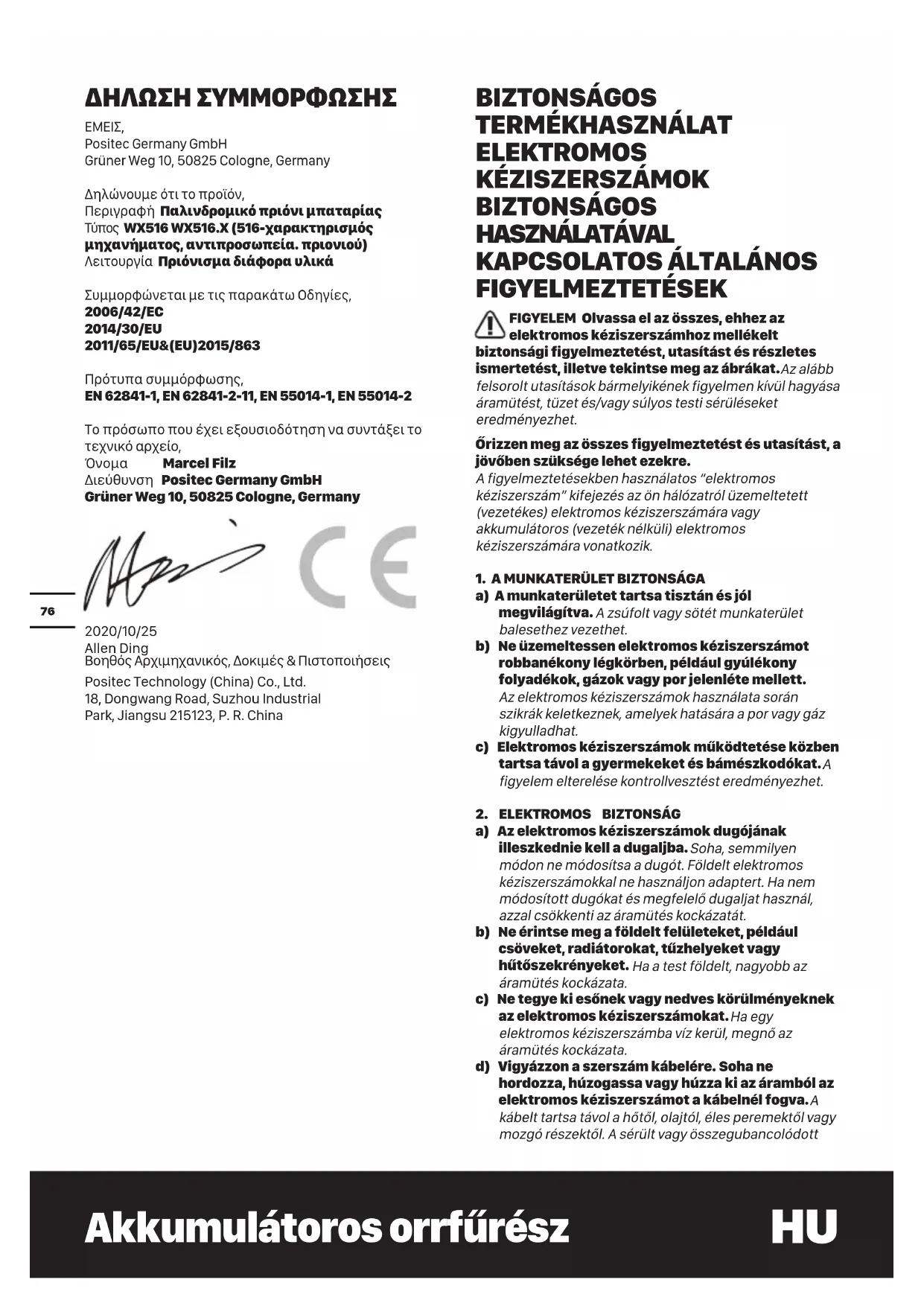 NYILATKOZAT A GYÁRTÓ, Positec Germany GmbH Grüner Weg 10, 50825 Cologne, Germany Kijelenti, hogy a termék: Leírás Akkumulátoros orrfűrész Típus WX516 WX516.X (516-a szerszám megjelölése, orrfűrészt jelöl) Rendeltetés Különböző anyagok vágása, fűrészelése Megfelel a következő irányelveknek: 2006/42/EC 2014/30/EU 2011/65/EU&(EU)2015/863 Az alábbi normáknak: EN 62841-1, EN 62841-2-11, EN 55014-1, EN 55014-2 A műszaki dokumentáció összeállítására jogosult személy, Név: Marcel Filz Cím: Positec Germany GmbH, Grüner Weg 10, 50825 Cologne, Germany 2020/10/25 Allen Ding Helyettes főmérnöke, Tesztelés és minősítés Positec Technology (China) Co., Ltd. 18, Dongwang Road, Suzhou Industrial Park, Jiangsu 215123, P. R. China SECURITATEA PRODUSULUI