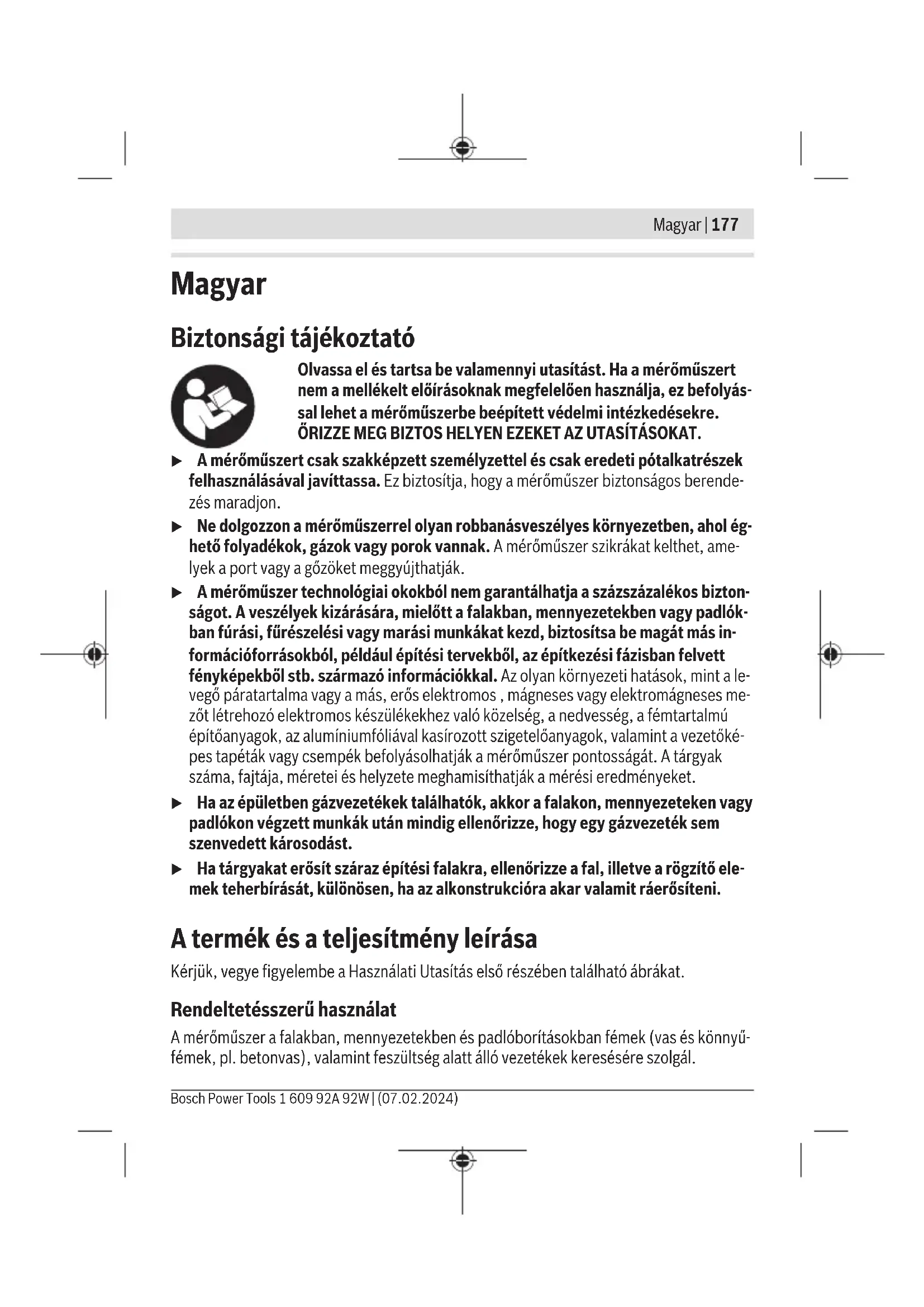 Energiaellátás – Elemek (alkáli-mangán) 2×1,5V LR6(AA) – Akkumulátorok (NiMH) 2×1,2V HR6(AA) – Lítium-ion akkumulátor (tartozék) 3,7V Üzemidő kb. – elemekkel (alkáli-mangán) 9h – akkumulátorokkal (NiMH) 9h – lítium-ion akkumulátorral (tartozék) 7h Súly – elemekkel (alkáli-mangán)/akkumulátorokkal (NiMH) 0,28kg – lítium-ion akkumulátorral (tartozék) 0,26kg Méretek (hosszúság× szélesség× magasság) 186× 86× 33mm Védelmi osztály IP54 Lítium-ion akkumulátor (tartozék) BA3.7V 1.0AhA Cikkszám 1607A350N8 1607A3517H A) a tárgyak anyagától és méretétől, valamint az alap anyagától és állapotától függ B) 15mm átmérőjű rézcső esetén C) 12mm átmérőjű betonvas esetén D) alacsonyabb érzékelési mélység feszültség alatt nem álló vezetékek esetén E) Csak egy nem vezetőképes szennyezés lép fel, ámbár időnként a harmatképződés következté- ben ideiglenesen egy nullától eltérő vezetőképességre is lehet számítani. A mérőműszerét a típustáblán található (14) gyári számmal lehet egyértelműen azonosítani. u A mérési eredmény pontossága és az észlelési mélység rossz felületű alap esetén rosszabb lehet. Bosch Power Tools 1 609 92A 92W | (07.02.2024)180 | Magyar A mérőműszer energiaellátása A mérőműszer vagy a kereskedelemben szokványosan kapható elemekkel vagy NiMH ak- kumulátorral, vagy tartozékként kaphatóBosch Li-ion akkumulátorokkal üzemeltethető. Li-ion akkumulátorral való üzemeltetés esetén tartsa be a Li-ion akkumulátorhoz tartozó használati utasítást. Megjegyzés: Soha ne tárolja a mérőműszert behelyezett akkumulátorrekesz-fedél nélkül(12), ill. lítium-ion akkumulátor nélkül, különösen poros vagy nedves környezet- ben. Az elemek behelyezése/kicserélése A mérőműszer üzemeltetéséhez alkáli-mangán elemek vagy NiMH-akkumulátorok alkal- mazását javasoljuk. Az elemrekeszfedél kinyitásához(12) nyomja meg a reteszelést(13). Vegye le az elem- rekeszfedelet. Tegye be az elemeket, illetve az akkumulátorokat. Ekkor ügyeljen az elemfiók fedél belső oldalán található ábrázolásnak megfelelő helyes polaritás betartására. Helyezze be az elemtartó rekesz fedelét(12), majd reteszelje be. Mindig valamennyi elemet, illetve akkumulátort egyszerre cserélje ki. Csak egy azonos gyártó cég azonos kapacitású elemeit vagy akkumulátorait használja. u Vegye ki az elemeket, illetve az akkumulátorokat a mérőműszerből, ha azt hosz- szabb ideig nem használja. Az elemek és akkumulátorok a mérőműszeren belüli hosszabb tárolás során korrodálhatnak, vagy maguktól kimerülhetnek. Üzemeltetés u Óvja meg a mérőműszert a nedvességtől és a közvetlen napsugárzás behatásá- tól. u Ne tegye ki a mérőműszert szélsőséges hőmérsékleteknek vagy hőmérsékletin- gadozásoknak. Nagyobb hőmérsékletingadozások esetén várja meg, amíg a hő- mérséklete kiegyenlítődik, mielőtt bekapcsolná. Szélsőséges hőmérsékletek vagy hőmérséklet-ingadozások esetén a mérőműszer pontossága csökkenhet. u Ügyeljen arra, hogy a mérőműszer ne eshessen le és ne legyen kitéve erősebb lö- késeknek vagy ütéseknek. Erős külső behatások után és a működés során fellépő feltűnő jelenségek esetén ellenőriztesse a mérőműszert egy feljogosított Bosch-vevő- szolgálattal. 1 609 92A 92W | (07.02.2024) Bosch Power ToolsMagyar | 181 u A mérőműszert csak az erre a célra előirányzott (8)fogantyúfelületeknél fogva tartsa, hogy ne befolyásolja a mérési eljárást. u A mérőműszer hátoldalán a(11) érzékelő tartományban ne tegyen fel öntapadó címkéket vagy táblákat. A fémtáblák különösen erősen befolyásolják a mérési ered- ményeket. Mérés közben ne viseljen kesztyűt és ügyeljen a kielégítő földelésre. Ha nem áll fenn kielégítő földelés, a feszültség alatt álló vezetékek felismerése esetleg nem megfelelően működik. Mérés közben kerülje az olyan készülékek közelségét, amelyek erős elekt- romos, mágneses vagy elektromágneses mezőket bocsátanak ki, pl. mo- biltelefonok, laptopok vagy tabletek. Az olyan készülékeknél, amelyek su- gárzása befolyással lehet a mérésre, lehetőség szerint deaktiválja a megfelelő funkciókat, vagy kapcsolja ki a készülékeket. Üzembe helyezés Be- és kikapcsolás u A mérőműszer bekapcsolása előtt gondoskodjon arról, hogy a(11) érzékelő tar- tomány ne legyen nedves. Szükség esetén dörzsölje szárazra egy kendővel a mérő- műszert. u Ha a mérőműszer előzőleg egy erős hőmérsékletváltozásnak volt kitéve, akkor a bekapcsolás előtt várja meg, amíg a hőmérséklete egy stabil értékre áll be. A mérőműszer bekapcsolásához nyomja meg a(7)Be-/Ki-gombot. A mérőműszer kikapcsolásához nyomja meg ismét a (7)Be-/Ki-gombot. Ha a mérőműszeren kb. 5percig egyik gombot sem nyomják meg, és a mérőműszer nem ismer fel tárgyat, akkor a mérőműszer automatikusan kikapcsol. A hangjelzés be-/kikapcsolása A hangjelzés gomb(6) a hangjelzés be- és kikapcsolására szolgál. Működési mód (lásd aAábrát) A mérőműszerrel a(11)érzékelő tartomány alatti területet az Amérési irányban a maxi- mális érzékelési mélységig lehet megvizsgálni. Minden mérésnél automatikusan fémtárgyakat (pl. rézcsöveket vagy betonvasat) és fe- szültség alatt álló vezetékeket (50–60Hz) keres a műszer. Mérési eljárás (lásdBábra) Helyezze fel a mérőműszert az ellenőrizni kívánt felületre. A fénygyűrű(2) világít, amivel jelzi, hogy készen áll a mérésre. Bosch Power Tools 1 609 92A 92W | (07.02.2024)182 | Magyar Tartsa a mérőműszert egyenletesen a markolatnál(8). A fogásán ne változtasson a mérés során, és különösen az érzékelő területére(11) ne nyúljon be. A mérőműszert mindig 