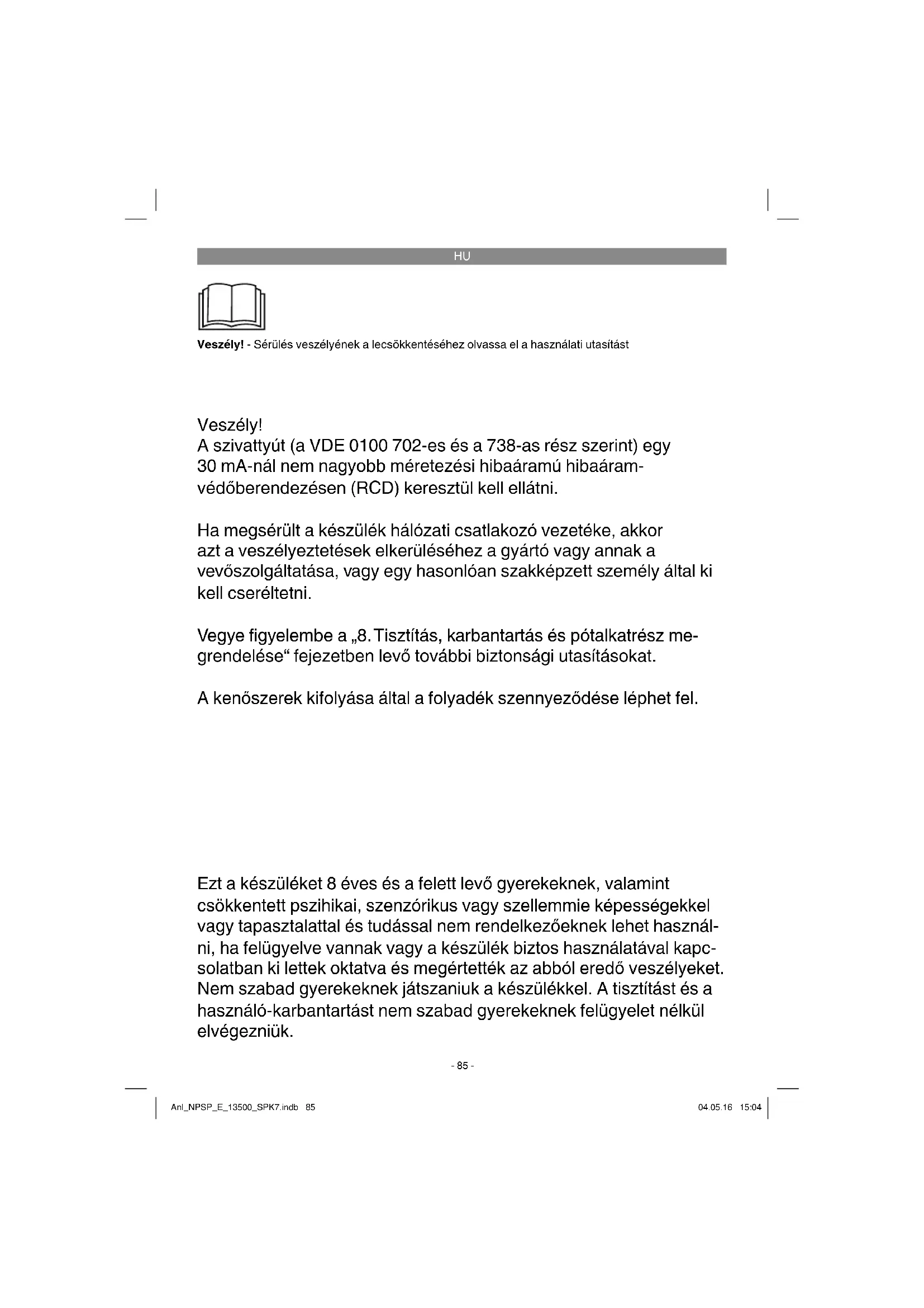 Veszély! - Sérülés veszélyének a lecsökkentéséhez olvassa el a használati utasítást Ezt a készüléket 8 éves és a felett levő gyerekeknek, valamint csökkentett pszihikai, szenzórikus vagy szellemmie képességekkel vagy tapasztalattal és tudással nem rendelkezőeknek lehet használ- ni, ha felügyelve vannak vagy a készülék biztos használatával kapc- solatban ki lettek oktatva és megértették az abból eredő veszélyeket. Nem szabad gyerekeknek játszaniuk a készülékkel. A tisztítást és a használó-karbantartást nem szabad gyerekeknek felügyelet nélkül elvégezniük. Veszély! A szivattyút (a VDE 0100 702-es és a 738-as rész szerint) egy 30 mA-nál nem nagyobb méretezési hibaáramú hibaáram- védőberendezésen (RCD) keresztül kell ellátni. Ha megsérült a készülék hálózati csatlakozó vezetéke, akkor azt a veszélyeztetések elkerüléséhez a gyártó vagy annak a vevőszolgáltatása, vagy egy hasonlóan szakképzett személy által ki kell cseréltetni. Vegye fi gyelembe a „8. Tisztítás, karbantartás és pótalkatrész me- grendelése“ fejezetben levő további biztonsági utasításokat. A kenőszerek kifolyása által a folyadék szennyeződése léphet fel. Anl_NPSP_E_13500_SPK7.indb 85Anl_NPSP_E_13500_SPK7.indb 85 04.05.16 15:0404.05.16 15:04HU