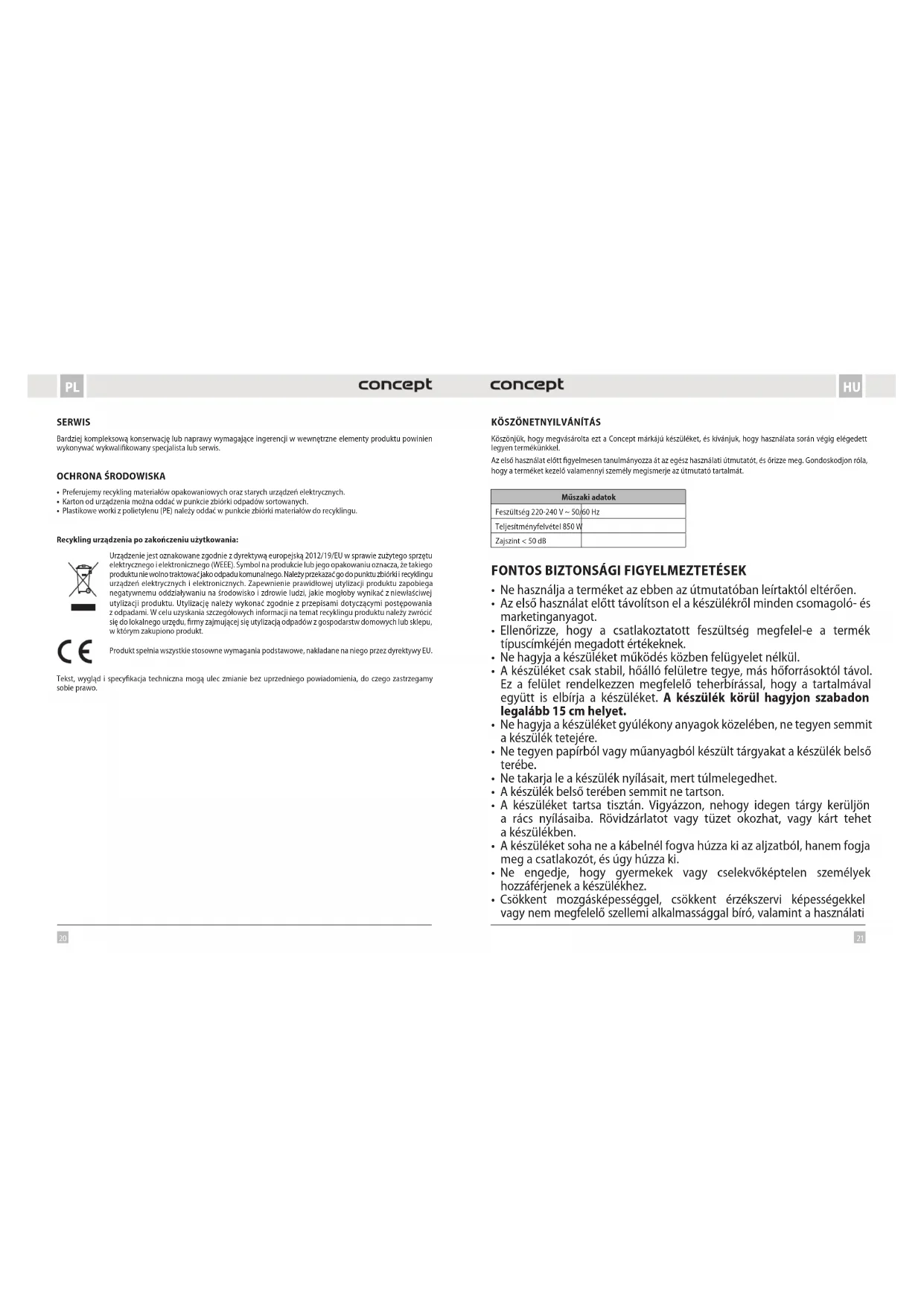 - A polietilén (PE) műanyagzacskókat adja le újrahasznosítható anyagokat gyűjtő helyen. A készülék újrahasznosítása az élettartama végén: Ez a készülék az európai Elektromos hulladékról és elektromos berendezésekről (WEEE) szóló 2012/19/ EU irányelvnek megfelelően van megjelölve. A terméken vagy a csomagolásán található szimbólum jelzi, hogy a termék nem tartozik a vegyes háztartási hulladék közé. El kell vinni olyan helyre, ahol az elektromos és elektronikus hulladékot gyűjtik újrahasznosítás céljából. A termék megfelelő módon történő megsemmisítésének biztosításával megakadályozza a környezetet és az emberi egészséget veszélyeztető negatív hatásokat, amelyeket a nem megfelelő hulladék-megsemmisítés okozhatna. A megsemmisítést ahulladékgazdálkodási előírásoknak megfelelően kell végrehajtani. A termék újrahasznosítására vonatkozó részletesebb információkért forduljon az illetékes helyi hivatalhoz, a háztartási hulladék megsemmisítésével foglalkozó szolgáltatóhoz, vagy az üzlethez, ahol a terméket vásárolta. Ez a termék megfelel az összes vonatkozó EU irányelv követelményeinek. A szövegben, a kivitelben és a műszaki jellemzőkben előzetes figyelmeztetés nélkül sor kerülhet változtatásokra, minden módosításra vonatkozó jog fenntartva. PATEICĪBA Pateicamies par šīs “Concept” ierīces iegādi. Ceram, ka būsiet apmierināti ar šo izstrādājumu visu tā izmantošanas laiku. Pirms lietošanas rūpīgi izlasiet šo lietošanas instrukciju un uzglabājiet to drošā vietā, lai nepieciešamības gadījumā varētu pārlasīt. Nodrošiniet, lai arī citi cilvēki, kuri izmantos šo ierīci, pirms tās lietošanas būtu iepazinušies ar norādījumiem. Tehniskie dati Spriegums 220–240 V ~ 50/60Hz Jauda 850 W Trokšņa līmenis < 50 dB SVARĪGI DROŠĪBAS NORĀDĪJUMI