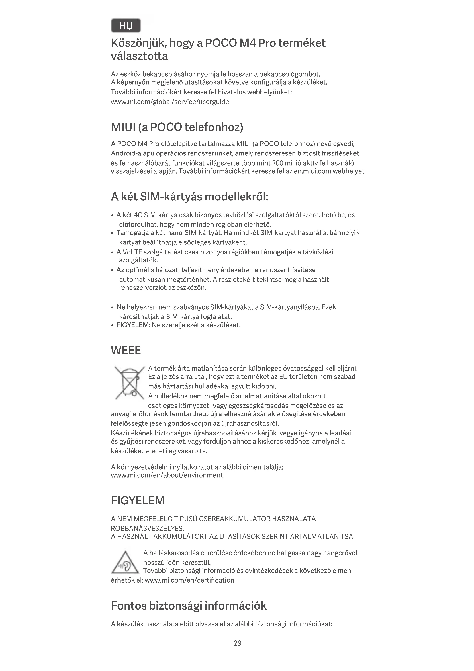 - FIGYELEM: Ne szerelje szét a készüléket. WEEE A termék ártalmatlanítása során különleges óvatossággal kell eljárni. Ez a jelzés arra utal, hogy ezt a terméket az EU területén nem szabad más háztartási hulladékkal együ kidobni. A hulladékok nem megfelelő ártalmatlanítása által okozo esetleges környezet- vagy egészségkárosodás megelőzése és az anyagi erőforrások fenntartható újrafelhasználásának elősegítése érdekében felelősségteljesen gondoskodjon az újrahasznosításról. Készülékének biztonságos újrahasznosításához kérjük, vegye igénybe a leadási és gyűjtési rendszereket, vagy forduljon ahhoz a kiskereskedőhöz, amelynél a készüléket eredetileg vásárolta. A környezetvédelmi nyilatkozatot az alábbi címen találja: www.mi.com/en/about/environment FIGYELEM A NEM MEGFELELŐ TÍPUSÚ CSEREAKKUMULÁTOR HASZNÁLATA ROBBANÁSVESZÉLYES. A HASZNÁLT AKKUMULÁTORT AZ UTASÍTÁSOK SZERINT ÁRTALMATLANÍTSA. A halláskárosodás elkerülése érdekében ne hallgassa nagy hangerővel hosszú időn keresztül. További biztonsági információ és óvintézkedések a következő címen érhetők el: www.mi.com/en/certification Fontos biztonsági információk A készülék használata elő olvassa el az alábbi biztonsági információkat: 29• Jóváhagyás nélküli kábelek, tápegységek vagy akkumulátorok használata tüzet vagy robbanást okozhat, illetve egyéb kockázatokkal járhat.