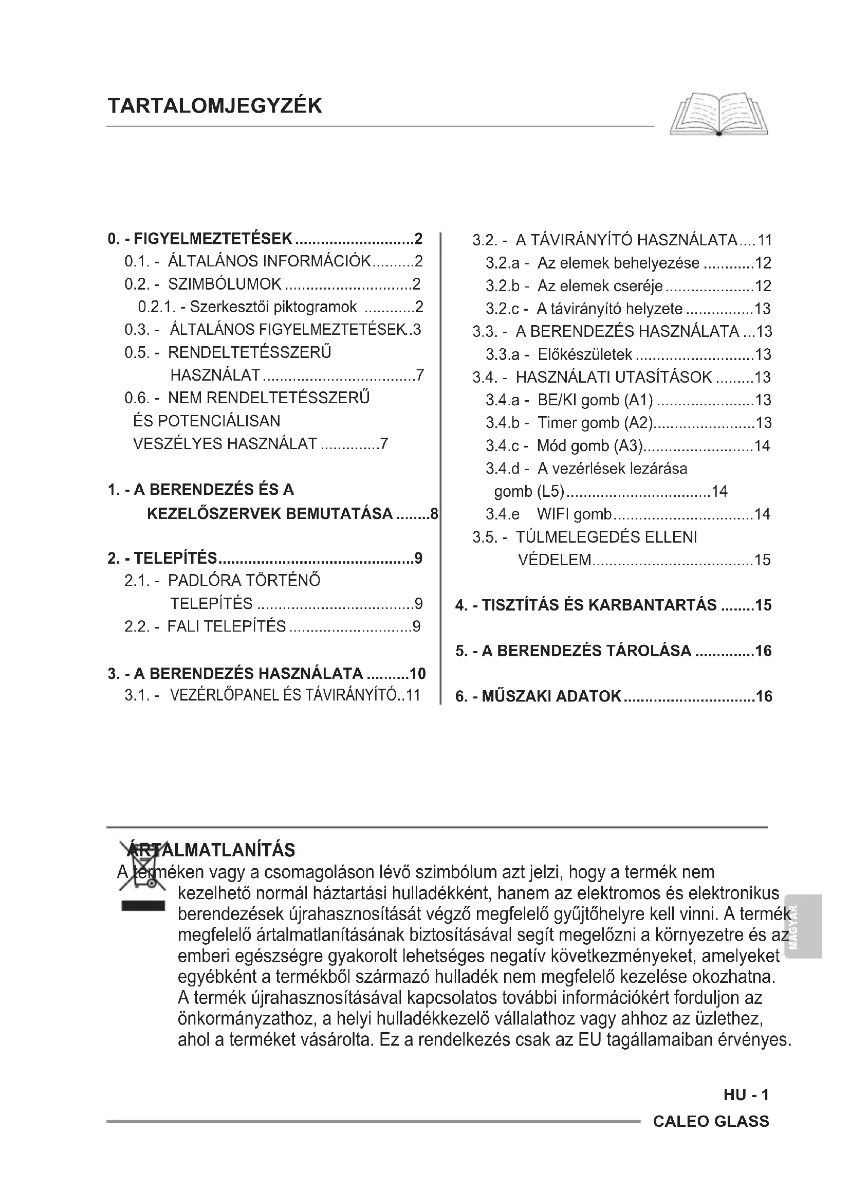 Eztaterméketcsakazebbenakézikönyvbenmegadottelő- írásoknakmegfelelőenszabadhasználni.Ameghatározottak- tóleltérőhasználatsúlyossérüléstokozhat. AGYÁRTÓNEMVÁLLALFELELŐSSÉGETAJELENKÉZIKÖNYVBEN FOGLALT SZABÁLYOK BE NEM TARTÁSÁBÓL EREDŐ SZEMÉLYI SÉRÜLÉSEKÉRTVAGYANYAGIKÁROKÉRT.CALEO GLASS MAGYAR HU - 9
