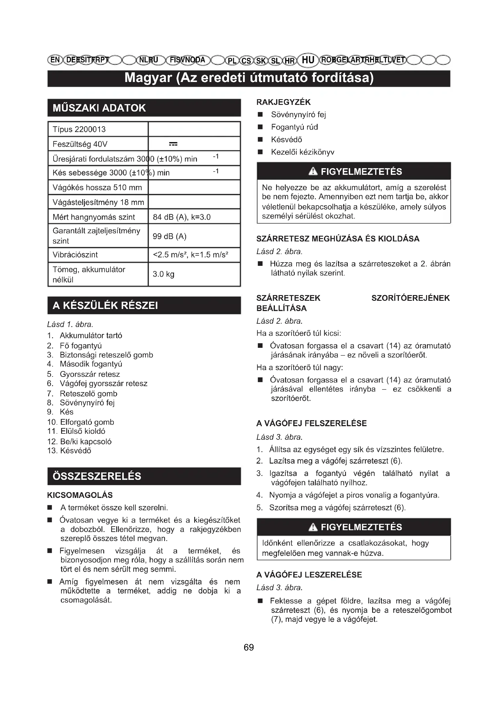 DE ES IT FR PTNL RUFI SV NO DA RO BG EL AR TR HE LT LV ET FIGYELMEZTETÉS Tartsa távol a kezét a pengétől. Amennyiben a pengéhez ér, az súlyos személyi sérülést okozhat. KARBANTARTÁS