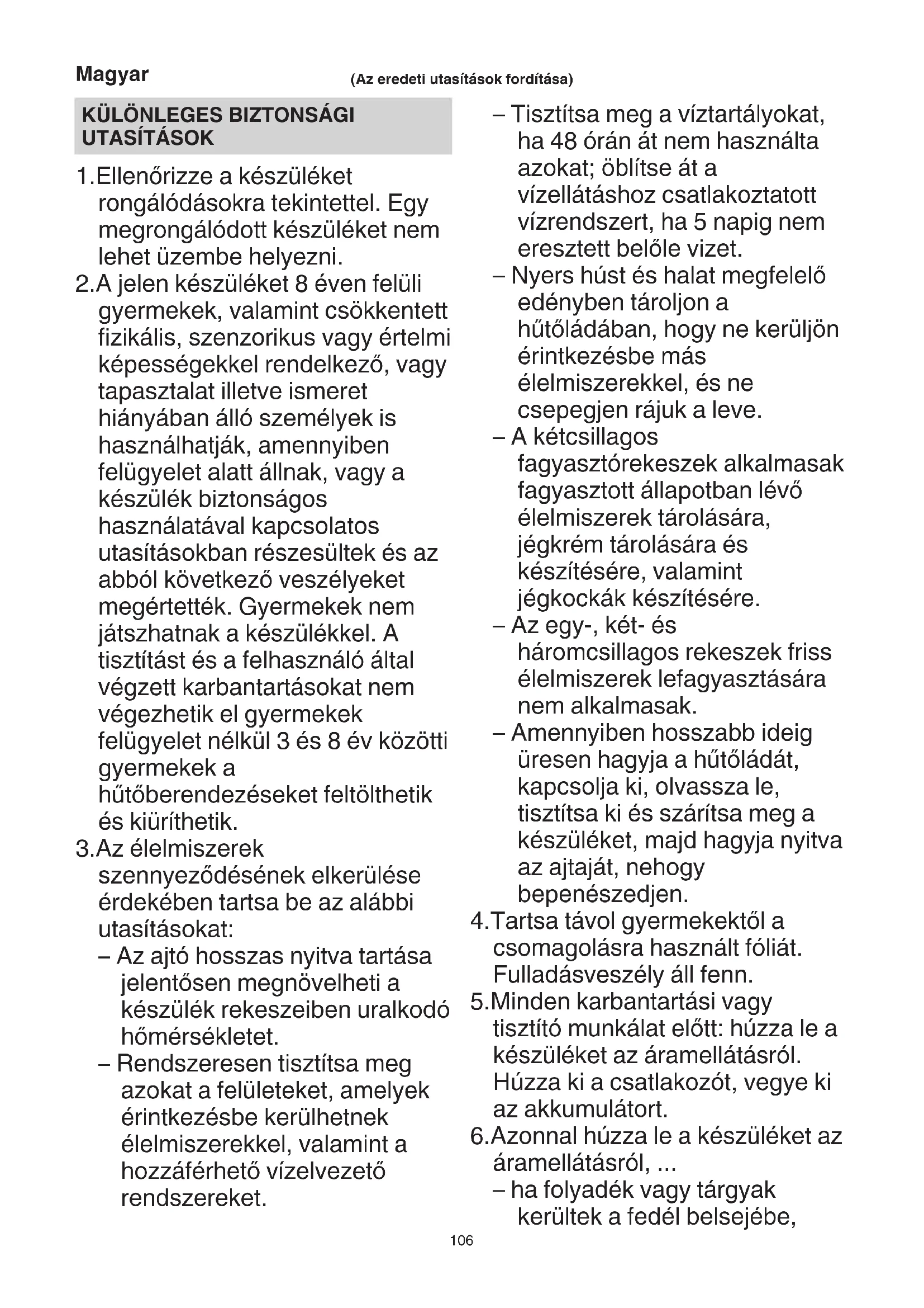 figyelembe kell venni a következő utasításokat: – Amennyiben a fedelet hosszabb ideig nyitva hagyják, s hőmérséklet-emelkedéssel kell számolnia készülék rekeszeiben. – A nyers húst és halat megfelelő edényekben úgy kell tárolni,hogy ne érintkezzen más élelmiszerekkel, illetve ne csöpögjön azokra. – Azokat felületeket, amelyek élelmiszerekkel érintkezhetnek, rendszeresen meg kell tisztítani. – Amennyiben a készülék hosszabb ideig üresen áll, azt ki kell kapcsolni, le kell engedni, meg kell tisztítani és a fedelét nyitva kell hagyni, hogy el lehessen kerülni a penészedést.