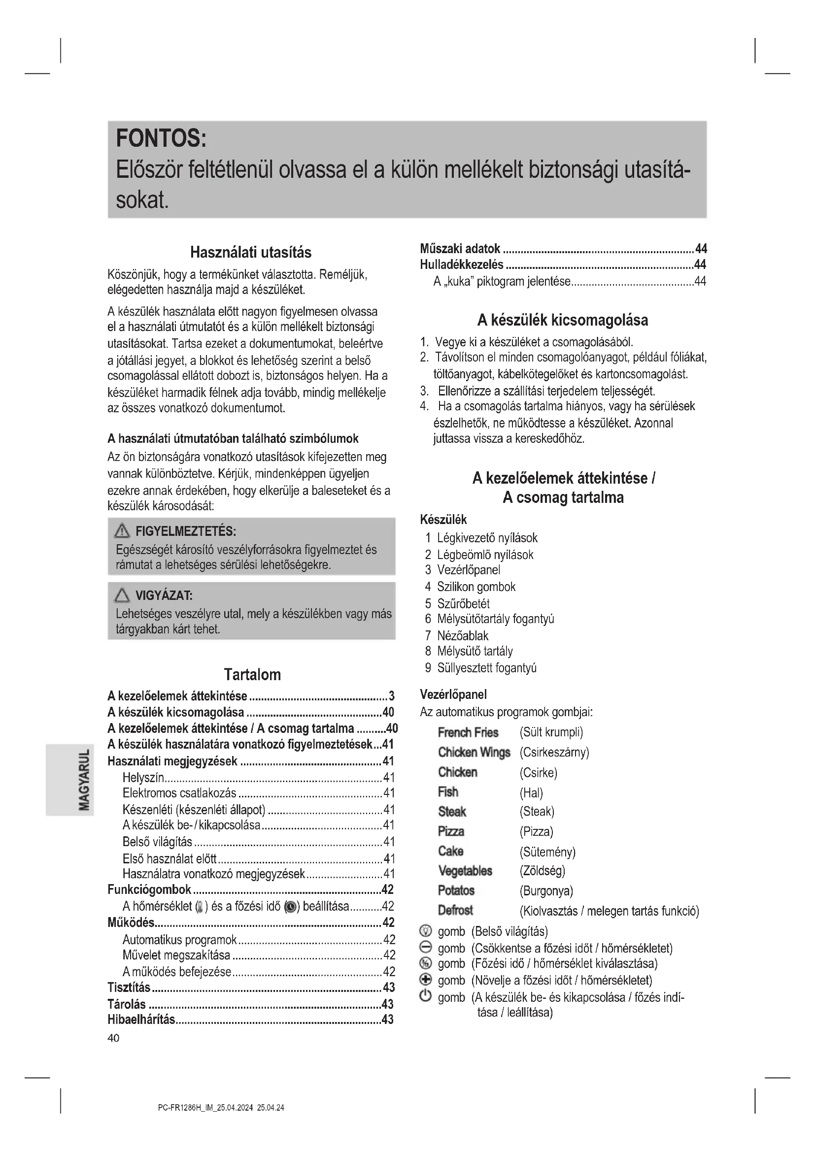 észlelhetők, ne működtesse a készüléket. Azonnal juttassa vissza a kereskedőhöz. A kezelőelemek áttekintése / A csomag tartalma Készülék 1 Légkivezető nyílások 2 Légbeömlő nyílások 3 Vezérlőpanel 4 Szilikon gombok 5 Szűrőbetét 6 Mélysütőtartály fogantyú 7 Nézőablak 8 Mélysütő tartály 9 Süllyesztett fogantyú Vezérlőpanel Az automatikus programok gombjai: (Sült krumpli) (Csirkeszárny) (Csirke) (Hal) (Steak) (Pizza) (Sütemény) (Zöldség) (Burgonya) (Kiolvasztás / melegen tartás funkció) gomb (Belső világítás) gomb (Csökkentse a főzési időt / hőmérsékletet) gomb (Főzési idő / hőmérséklet kiválasztása) gomb (Növelje a főzési időt / hőmérsékletet) gomb (A készülék be- és kikapcsolása / főzés indí- tása / leállítása)PC-FR1286H_IM_25.04.2024 25.04.24