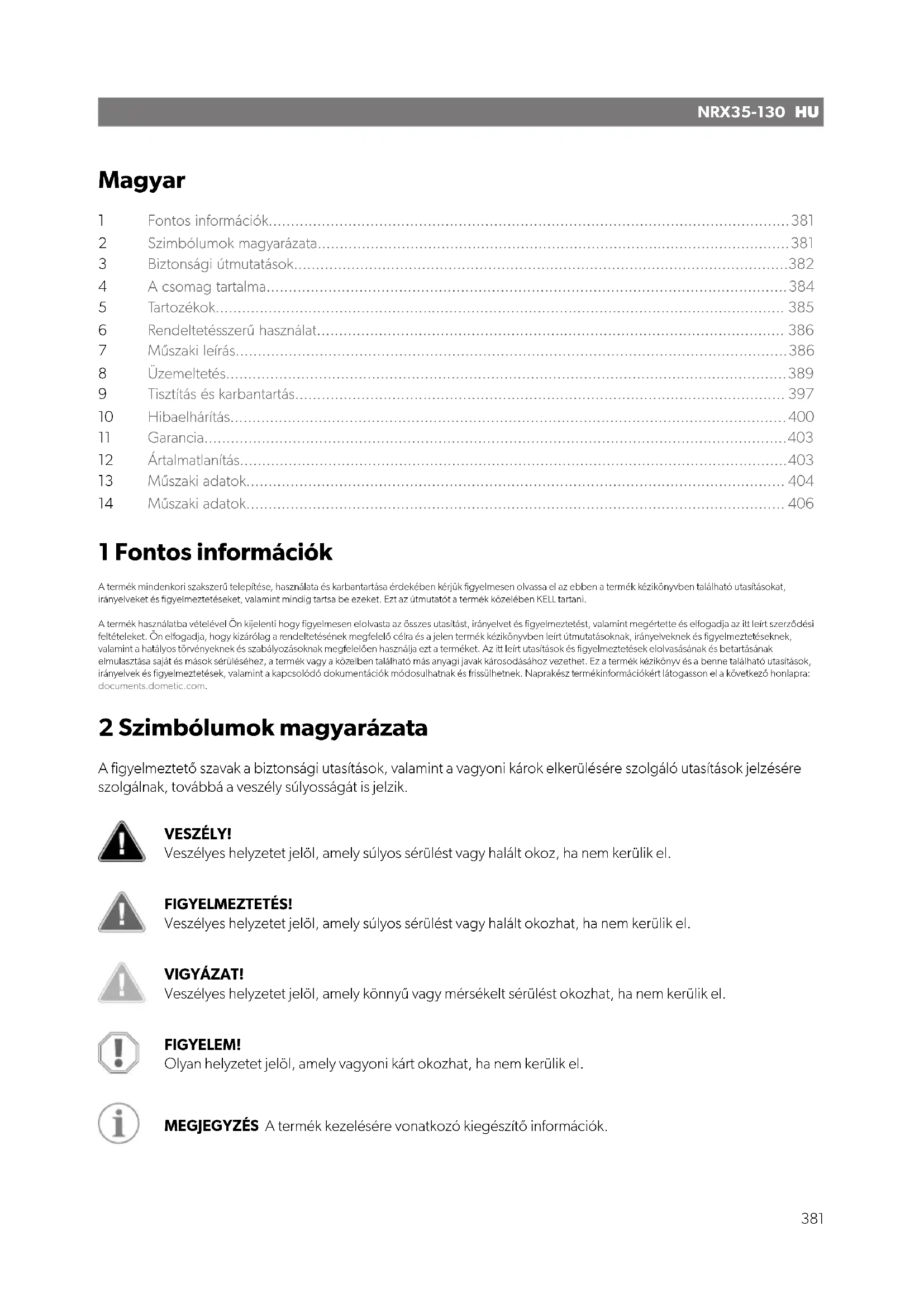 - 14 Műszaki adatok 1 Fontos információk A termék mindenkori szakszerű telepítése, használata és karbantartása érdekében kérjük figyelmesen olvassa el az ebben a termék kézikönyvben található utasításokat, irányelveket és figyelmeztetéseket, valamint mindig tartsa be ezeket. Ezt az útmutatót a termék közelében KELL tartani. A termék használatba vételével Ön kijelenti hogy figyelmesen elolvasta az összes utasítást, irányelvet és figyelmeztetést, valamint megértette és elfogadja az itt leírt szerződési feltételeket. Ön elfogadja, hogy kizárólag a rendeltetésének megfelelő célra és a jelen termék kézikönyvben leírt útmutatásoknak, irányelveknek és figyelmeztetéseknek, valamint a hatályos törvényeknek és szabályozásoknak megfelelően használja ezt a terméket. Az itt leírt utasítások és figyelmeztetések elolvasásának és betartásának elmulasztása saját és mások sérüléséhez, a termék vagy a közelben található más anyagi javak károsodásához vezethet. Ez a termék kézikönyv és a benne található utasítások, irányelvek és figyelmeztetések, valamint a kapcsolódó dokumentációk módosulhatnak és frissülhetnek. Naprakész termékinformációkért látogasson el a következő honlapra: documents.dometic.com. 2 Szimbólumok magyarázata A figyelmeztető szavak a biztonsági utasítások, valamint a vagyoni károk elkerülésére szolgáló utasítások jelzésére szolgálnak, továbbá a veszély súlyosságát is jelzik. VESZÉLY! Veszélyes helyzetet jelöl, amely súlyos sérülést vagy halált okoz, ha nem kerülik el. FIGYELMEZTETÉS! Veszélyes helyzetet jelöl, amely súlyos sérülést vagy halált okozhat, ha nem kerülik el. VIGYÁZAT! Veszélyes helyzetet jelöl, amely könnyű vagy mérsékelt sérülést okozhat, ha nem kerülik el. FIGYELEM! Olyan helyzetet jelöl, amely vagyoni kárt okozhat, ha nem kerülik el. MEGJEGYZÉS A termék kezelésére vonatkozó kiegészítő információk. 381HUNRX35-130 3 Biztonsági útmutatások Alapvető biztonság FIGYELMEZTETÉS! Áramütés miatti veszély A hűtőszekrény beszerelését és eltávolítását csak képzett szakember végezheti. A nedves környezetben és vizes helyiségekben történő telepítéseket csak szakemberrel végeztesse el. A hűtőszekrényt előtető alatt vagy hasonló környezetben működtetve gondoskodni kell arról, hogy az védve legyen az esőtől és a fröccsenő víztől. Ne használja a hűtőszekrényt, ha az szemmel láthatóan megsérült. Ezen a hűtőszekrényen csak képzett szakember végezhet javításokat. A szakszerűtlen javítások jelentős veszélyeket okozhatnak, ill. a hűtőszekrény károsodhat. Ha a hűtőszekrény tápkábele megsérült, akkor azt a biztonsági kockázatok elkerülése érdekében a gyártóval, a vevőszolgálattal vagy egy hasonlóan képzett szakemberrel ki kell cseréltetni. A hűtő elhelyezésekor ügyeljen arra, hogy ne csípje be és ne károsítsa a tápkábelt. Ne helyezzen el több hordozható aljzatot vagy hordozható tápegységet a hűtő hátsó részénél. Soha ne fogjon meg puszta kézzel csupasz vezetékeket. A készüléket olyan aljzatba illessze be, amely biztosítja a megfelelő csatlakozást, különösen akkor, ha a készüléket földelni kell. Ha a készüléket a elektromos hálózatról táplálja, akkor biztosítsa, hogy a hálózat rendelkezzen maradékáram megszakítóval (RCCB) vagy földelési hiba áramkör-megszakítóval (GFCI). A telepítéskor az összes vonatkozó előírást be kell tartani, különösen a potenciálisan nedves területekre vonatkozóan. FIGYELMEZTETÉS! Tűzveszély A hűtőközegkör kis mennyiségű környezetbarát, hűtőközeget tartalmaz. Nem károsítja az ózonréteget és nem növeli az üvegházhatást. A kiszivárgó hűtőközeg meggyulladhat. Ne használja vagy tárolja a hűtőszekrényt olyan zárt helyiségekben, ahol minimális a légáramlás, vagy nincs is ilyen. A hűtőszekrény beépítési nyílásában ne legyenek olyan elektromos alkatrészek és fényforrások, amelyek normál vagy rendellenes működés közben szikrákat vagy elektromos íveket hoznak létre (pl. relék vagy biztosítékdobozok). A hűtőszekrény szigetelése gyúlékony ciklopentánt tartalmaz, amely speciális ártalmatlanítási eljárásokat igényel. Élettartama végén megfelelő hulladékkezelő központban adja le a hűtőszekrényt. FIGYELMEZTETÉS! Robbanásveszély Ne tároljon a hűtőszekrényben robbanásveszélyes anyagokat, például gyúlékony hajtógázt tartalmazó aeroszol-palackokat. FIGYELMEZTETÉS! Egészségkárosodás veszélye A hűtőkészüléket 8év feletti gyermekek, valamint korlátozott fizikai, érzékelési és mentális képességű, illetve megfelelő tapasztalattal és tudással nem rendelkező személyek csak felügyelet mellett, illetve a hűtőkészülék biztonságos használatát és az abból eredő veszélyeket megértve használhatják. A hűtőszekrény ki- és berakodása 3 és 8 év közötti gyermekek számára engedélyezett. A tisztítást és a felhasználói karbantartást felügyelet nélküli gyermekek nem végezhetik. A gyermekeket felügyelni kell annak érdekében, hogy ne játsszanak a hűtőszekrénnyel. FIGYELMEZTETÉS! Gyermekek beszorulásának kockázata Gondoskodjon arról, hogy a polcok beszerelése és rögzítése révén a gyermekek ne tudják bezárni magukat a hűtőszekrénybe. p. 406
