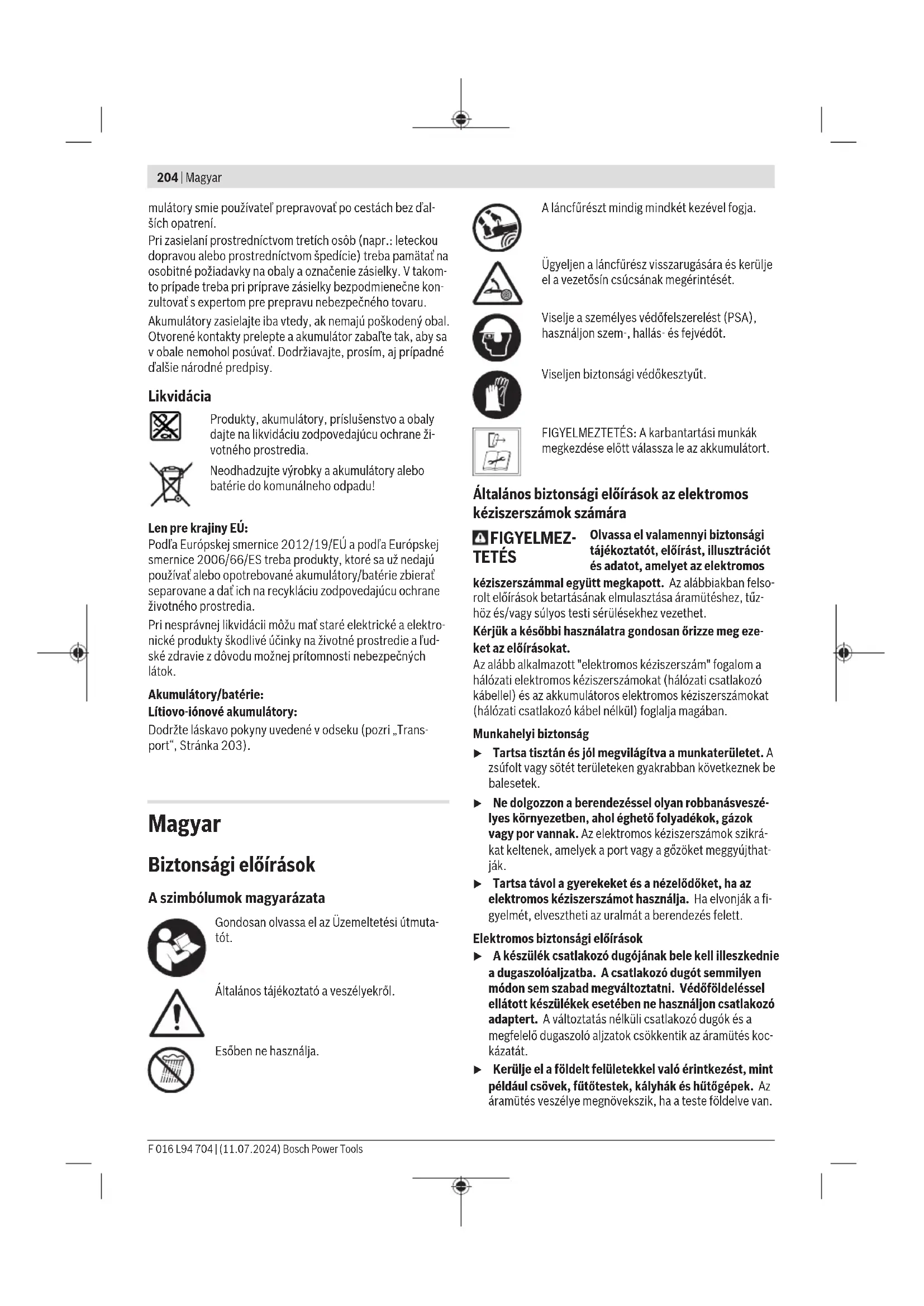 – Nyomja be a be-/kikapcsoló (19) reteszelőjét, majd a (2) be-/kikapcsolót, és tartsa azt benyomva. – Engedje el a be-/kikapcsoló reteszelőjét, mihelyt a láncfű- rész mozog. – A fűrészláncnak el kell érnie a teljes sebességét, mielőtt el lehetne kezdeni a fával dolgozni. Megjegyzés: A láncfűrészt nem lehet elindítani, ha a vissza- csapó fék aktiválására szolgáló (5) kart a használat előtt nem deaktiválták. Kikapcsolás: – Engedje el a (2) be-/kikapcsolót. A be-/kikapcsoló rete- szelője visszatér a biztonsági/reteszelési állapotba. – A használat után tolja a visszacsapó fék aktiválására szol- gáló (5) kart az 1. helyzetből a 2. helyzetbe, eltávolítva az (4) elülső fogantyútól. Általános viselkedési szabályok vágás közben (lásd a F ábrát) – Aki a láncfűrészt életében először használja, annak cél- szerű a fatörzsek fűrészelését először egy fűrészbakon gyakorolnia. – Vegye fel kikapcsolt fűrész mellett a fa előtt a helyes test- tartást. – Indítsa el a láncfűrészt és győződjön meg arról, hogy a fű- részlánc teljes sebességgel működik, mielőtt hozzáérne a fához. – Kezdje el a vágást, ehhez nyomja hozzá a fához a (9) kar- mos ütközőt, hogy így stabilizálja vágást. – Ha vastagabb fatörzseket vág, használja emelőként a kar- mos ütközőt, vagyis a vágás során helyezze vissza azt lé- pésről lépésre egy alacsonyabb pontra. Ehhez húzza kissé hátra a láncfűrészt, amíg a karmos ütköző leválik és egy alacsonyabb helyen tegye ismét fel a láncfűrészt, hogy to- vább vágjon. Ne húzza ki teljesen a vágásból a láncfűrészt. – A láncfűrészt az egész vágás során folyamatosan működ- tesse és tartson fenn egy egyenletes sebességet. – A fűrészelés során ne nyomja erősen a fűrészláncot, ha- nem hagyja azt dolgozni. – A láncfűrészt mindig akkor távolítsa el a vágásból, amikor a fűrészlánc még működik. – A vágás végén óvatosan kell dolgozni. Amikor a láncfűrész áthaladt a munkadarabon, a reakcióerő hirtelen megválto- zik. Ekkor a váratlan mozdulat során a kezelő lába megsé- rülhet. – Engedje el a be-/kikapcsolót, mihelyt befejezte a vágást, hogy a lánc leálljon és állítsa be a (5) visszacsapó féket helyesen a "O" helyzetbe (lásd a E1 ábrát). A fűrész visszarúgása (lásd az G ábrát) Ha a kezelő alapvetően érti a visszarúgási folyamatot, akkor az ekkor fellépő, balesetekhez vezető visszarugásokat csök- kenteni lehet. Mindig ügyeljen arra, hogy szilárdan álljon a talajon és meg- tartsa az egyensúlyát. A fűrész visszarúgása alatt a működésben lévő láncfűrész hir- telen magasba és hátrafelé történő ugrását értjük, amely ak- kor következik be, ha a vezetősín csúcsa megérinti a fűrésze- lésre kerülő anyagot, vagy ha beékelődik a fűrészlánc. Ha visszarúgás lép fel, a láncfűrész kiszámíthatatlan módon reagál és a kezelőnél vagy a fűrészelési területen belül tartóz- kodó személyeknél súlyos sérüléseket okozhat. Különösen figyeljen, ha oldalirányban vagy ferde irányban, vagy hosszirányban végez vágásokat. Ezeknél a vágásoknál a (9) karmos ütközőt normális körülmények között nem lehet használni. A visszarúgás kockázatának csökkentésére tartsa be a követ- kező óvatossági intézkedéseket: – Mindig ügyeljen a láncfűrész helyes kezelésére. – Tartsa szorosan fogva a láncfűrészt és tartsa mereven a bal karját, hogy meg tudja tartani az uralmát a láncfűrész felett, ha egy visszarúgás lép fel. – Gondoskodjon arról, hogy azon a területen, amelybe bele- vág, ne legyenek akadályok. Ügyeljen arra, hogy a vezető- sín csúcsa ne érhessen hozzá egy fatörzshöz, egy ághoz, egy kerítéshez vagy bármely más akadályhoz, amelyet a fűrésszel végzett munka során véletlenül el lehet találni. Megjegyzés: Ha a vezetősín csúcsa egy akadályhoz ér, visz- szarúgás léphet fel. – Vágás közben mindig a láncfűrész teljes sebességét hasz- nálja. Nyomja teljesen be a (2) be-/kikapcsolót és egyen- letes vágási sebességgel dolgozzon. – Csak a Bosch által javasolt tartalék vezetősíneket és visz- szarúgásszegény láncokat használja. Visszacsapó fék A visszacsapó fék egy biztonsági mechanizmus, amelyet a csuklóval a visszacsapó fék aktiválására szolgáló (5) kar se- gítségével lehet aktiválni, ha egy visszarúgás lép fel. A fűrész- lánc azonnal leáll. Így csökken a visszarugás által kiváltott sé- rülések kockázata. Rendszeresen tesztelje, hogy a visszacsapó fék működik-e: – Tartsa mindkét kezével szorosan fogva a láncfűrészt. – Kapcsolja be a láncfűrészt. Bosch Power Tools F 016 L94 704 | (11.07.2024)214 | Magyar – Ha a fűrészlánc forog, nyomja előre a csuklójával a vissza- csapó fék aktiválására szolgáló (5) kart. Ne használja a láncfűrészt, ha a fűrészlánc ennél e tesztnél nem áll le azonnal. Megjegyzés: Normális használat során ne állítsa le a láncfű- részt a visszacsapó fék aktiválásra szolgáló (5) kar szándé- kos működtetésével. Fatörzsek fűrészelése (lásd a H ábrát) – A fűrészelés előtt mindig biztosítsa a fatörzseket. – A fatörzseket mindig csak a biztosított pontokon túl vágja, hogy elkerülje a fatörzs és a lánc beékelődését. – Ügyeljen arra, hogy a fűrészlánc sohase érinthesse meg a talajt vagy a vágó felszerelést. – Ügyeljen a már kivágott fák csonkjaira, ágakra, gyökerek- re, nehogy munka közben megbotoljon bennük. Mechanikus feszültség alatt álló fa fűrészelése (lásd a I ábrát) – A mechanikus feszültség alatt álló fadarabok, ágak vagy fák fűrészelését csak megfelelő szakképzettséggel rendel- kező szakemberek hajthatják végre. Ilyen esetekben 