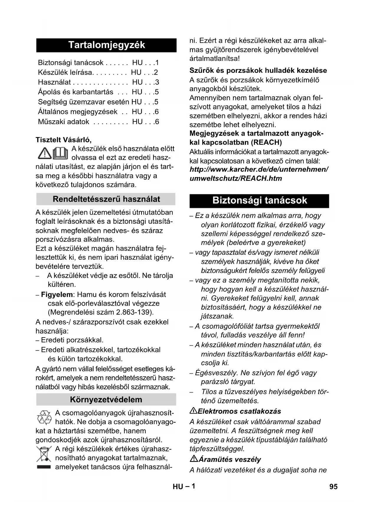 - Сетевой шнур Уровень звукового давления (EN 60704-2-1) Вес без (принадлежностей) 94 RU– 1 Tisztelt Vásárló, A készülék első használata előtt olvassa el ezt az eredeti hasz- nálati utasítást, ez alapján járjon el és tart- sa meg a későbbi használatra vagy a következő tulajdonos számára. A készülék jelen üzemeltetési útmutatóban foglalt leírásoknak és a biztonsági utasítá- soknak megfelelően nedves- és száraz porszívózásra alkalmas. Ezt a készüléket magán használatra fej- lesztettük ki, és nem ipari használat igény- bevételére terveztük. – A készüléket védje az esőtől. Ne tárolja kültéren. – Figyelem: Hamu és korom felszívását csak elő-porleválasztóval végezze (Megrendelési szám 2.863-139). A nedves-/ szárazporszívót csak ezekkel használja: – Eredeti porzsákkal. – Eredeti alkatrészekkel, tartozékokkal és külön tartozékokkal. A gyártó nem vállal felelősséget esetleges ká- rokért, amelyek a nem rendeltetésszerű hasz- nálatból vagy hibás kezelésből származnak. A csomagolóanyagok újrahasznosít- hatók. Ne dobja a csomagolóanyago- kat a háztartási szemétbe, hanem gondoskodjék azok újrahasznosításról. A régi készülékek értékes újrahasz- nosítható anyagokat tartalmaznak, amelyeket tanácsos újra felhasznál- ni. Ezért a régi készülékeket az arra alkal- mas gyűjtőrendszerek igénybevételével ártalmatlanítsa! A szűrők és porzsákok környezetkímélő anyagokból készlütek. Amennyiben nem tartalmaznak olyan fel- szívott anyagokat, amelyeket tilos a házi szemétben elhelyezni, akkor a rendes házi szemétbe lehet elhelyezni. Megjegyzések a tartalmazott anyagok- kal kapcsolatban (REACH) Aktuális információkat a tartalmazott anyagok- kal kapcsolatosan a következő címen talál: http://www.karcher.de/de/unternehmen/ umweltschutz/REACH.htm – Ez a készülék nem alkalmas arra, hogy olyan korlátozott fizikai, érzékelő vagy szellemi képességgel rendelkező sze- mélyek (beleértve a gyerekeket) – vagy tapasztalat és/vagy ismeret nélküli személyek használják, kivéve ha őket biztonságukért felelős személy felügyeli – vagy ez a személy megtanította nekik, hogy hogyan kell a készüléket használ- ni. Gyerekeket felügyelni kell, annak biztosításáért, hogy a készülékkel ne játszanak. – A csomagolófóliát tartsa gyermekektől távol, fulladás veszélye áll fenn! – A készüléket minden használat után, és minden tisztítás/karbantartás előtt kap- csolja ki. – Égésveszély. Ne szívjon fel égő vagy parázsló tárgyat. – Tilos a tűzveszélyes helyiségekben tör- ténő üzemeltetés. 몇 Elektromos csatlakozás A készüléket csak váltóárammal szabad üzemeltetni. A feszültségnek meg kell egyeznie a készülék típustábláján található tápfeszültséggel. Áramütés veszély A hálózati vezetéket és a dugaljat soha ne Tartalomjegyzék Biztonsági tanácsok
