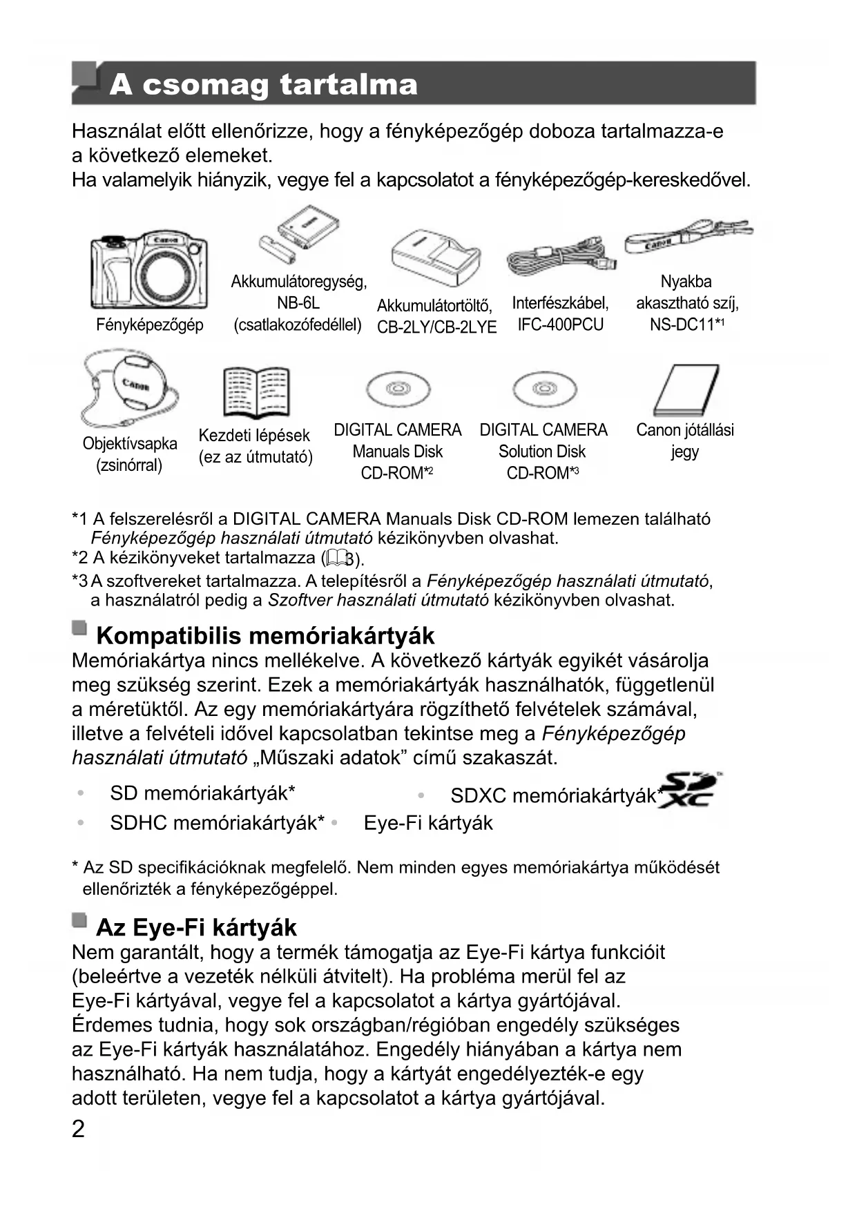 Canon jótállási jegy *1 A felszerelésről a DIGITAL CAMERA Manuals Disk CD-ROM lemezen található Fényképezőgép használati útmutató kézikönyvben olvashat. *2 A kézikönyveket tartalmazza (= 3). *3 A szoftvereket tartalmazza. A telepítésről a Fényképezőgép használati útmutató, a használatról pedig a Szoftver használati útmutató kézikönyvben olvashat. Kompatibilis memóriakártyák Memóriakártya nincs mellékelve. A következő kártyák egyikét vásárolja meg szükség szerint. Ezek a memóriakártyák használhatók, függetlenül a méretüktől. Az egy memóriakártyára rögzíthető felvételek számával, illetve a felvételi idővel kapcsolatban tekintse meg a Fényképezőgép használati útmutató „Műszaki adatok” című szakaszát.