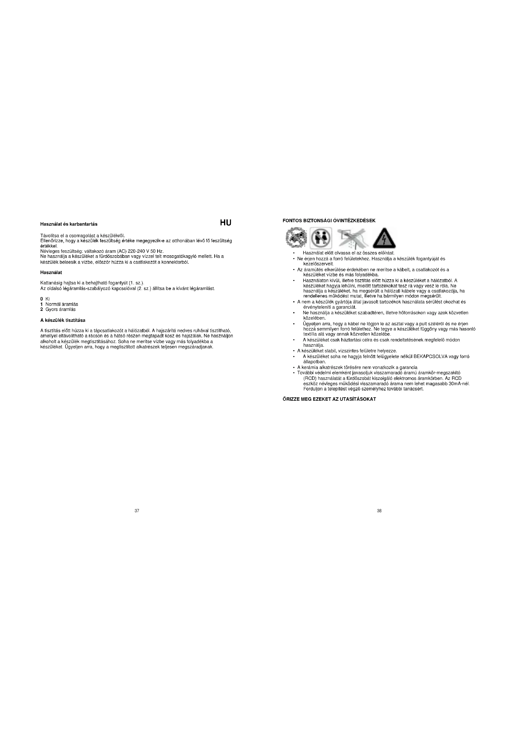 Távolítsa el a csomagolást a készülékről. Ellenőrizze, hogy a készülék feszültség értéke megegyezik-e az otthonában lévő fő feszültség értékkel. Névleges feszültség: váltakozó áram (AC) 220-240 V 50 Hz. Ne használja a készüléket a fürdőszobában vagy vízzel telt mosogatókagyló mellett. Ha a készülék beleesik a vízbe, először húzza ki a csatlakozót a konnektorból. Használat Kattanásig hajtsa ki a behajtható fogantyút (1. sz.). Az oldalsó légáramlás-szabályozó kapcsolóval (2. sz.) állítsa be a kívánt légáramlást. 0 Ki 1 Normál áramlás 2 Gyors áramlás A készülék tisztítása A tisztítás előtt húzza ki a tápcsatlakozót a hálózatból. A hajszárító nedves ruhával tisztítható, amellyel eltávolítható a rácson és a hátsó részen megtapadt kosz és hajszálak. Ne használjon alkoholt a készülék megtisztításához. Soha ne merítse vízbe vagy más folyadékba a készüléket. Ügyeljen arra, hogy a megtisztított alkatrészek teljesen megszáradjanak.