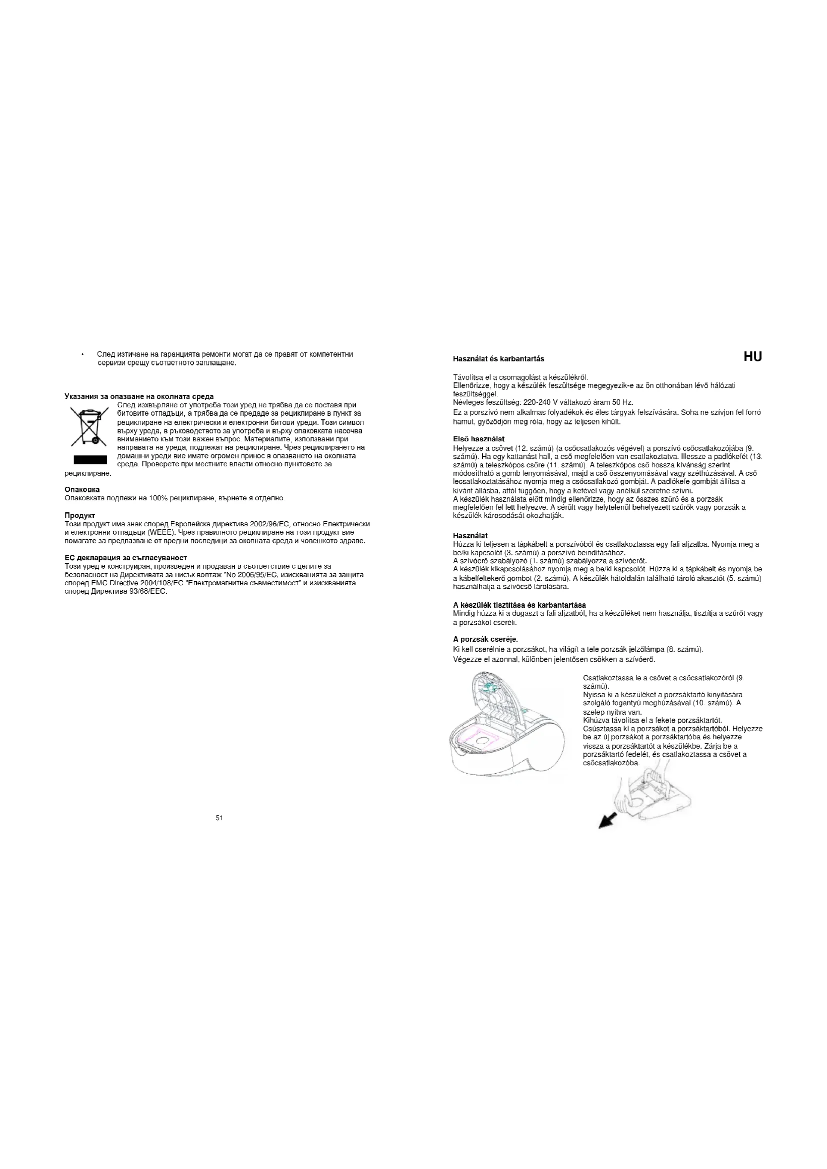 Távolítsa el a csomagolást a készülékről. Ellenőrizze, hogy a készülék feszültsége megegyezik-e az ön otthonában lévő hálózati feszültséggel. Névleges feszültség: 220-240 V váltakozó áram 50 Hz. Ez a porszívó nem alkalmas folyadékok és éles tárgyak felszívására. Soha ne szívjon fel forró hamut, győződjön meg róla, hogy az teljesen kihűlt. Első használat Helyezze a csövet (12. számú) (a csőcsatlakozós végével) a porszívó csőcsatlakozójába (9. számú). Ha egy kattanást hall, a cső megfelelően van csatlakoztatva. Illessze a padlókefét (13. számú) a teleszkópos csőre (11. számú). A teleszkópos cső hossza kívánság szerint módosítható a gomb lenyomásával, majd a cső összenyomásával vagy széthúzásával. A cső lecsatlakoztatásához nyomja meg a csőcsatlakozó gombját. A padlókefe gombját állítsa a kívánt állásba, attól függően, hogy a kefével vagy anélkül szeretne szívni. A készülék használata előtt mindig ellenőrizze, hogy az összes szűrő és a porzsák megfelelően fel lett helyezve. A sérült vagy helytelenül behelyezett szűrők vagy porzsák a készülék károsodását okozhatják. Használat Húzza ki teljesen a tápkábelt a porszívóból és csatlakoztassa egy fali aljzatba. Nyomja meg a be/ki kapcsolót (3. számú) a porszívó beindításához. A szívóerő-szabályozó (1. számú) szabályozza a szívóerőt. A készülék kikapcsolásához nyomja meg a be/ki kapcsolót. Húzza ki a tápkábelt és nyomja be a kábelfeltekerő gombot (2. számú). A készülék hátoldalán található tároló akasztót (5. számú) használhatja a szívócső tárolására. A készülék tisztítása és karbantartása Mindig húzza ki a dugaszt a fali aljzatból, ha a készüléket nem használja, tisztítja a szűrőt vagy a porzsákot cseréli. A porzsák cseréje. Ki kell cserélnie a porzsákot, ha világít a tele porzsák jelzőlámpa (8. számú). Végezze el azonnal, különben jelentősen csökken a szívóerő. Csatlakoztassa le a csövet a csőcsatlakozóról (9. számú). Nyissa ki a készüléket a porzsáktartó kinyitására szolgáló fogantyú meghúzásával (10. számú). A szelep nyitva van. Kihúzva távolítsa el a fekete porzsáktartót. Csúsztassa ki a porzsákot a porzsáktartóból. Helyezze be az új porzsákot a porzsáktartóba és helyezze vissza a porzsáktartót a készülékbe. Zárja be a porzsáktartó fedelét, és csatlakoztassa a csövet a csőcsatlakozóba.53 A szűrők tisztítása. A porszívó legjobb szívóerejének biztosításához rendszeresen ki kell tisztítania a szűrőket a készülék hátulján (kimeneti szűrő) és a porzsák mögött (bemeneti szűrő). A bemeneti szűrő tisztítása Csatlakoztassa le a csövet a csőcsatlakozóról (9. számú). Nyissa ki a készüléket a porzsáktartó kinyitására szolgáló fogantyú meghúzásával (1. számú). A szelep nyitva van. Kihúzva távolítsa el a fekete porzsáktartót. Távolítsa el a szűrőt a szűrőtartóból. Langyos vízzel tisztítsa ki a szűrőt, visszahelyezés előtt hagyja teljesen megszáradni. A szűrő nem rakható mosogatógépbe.