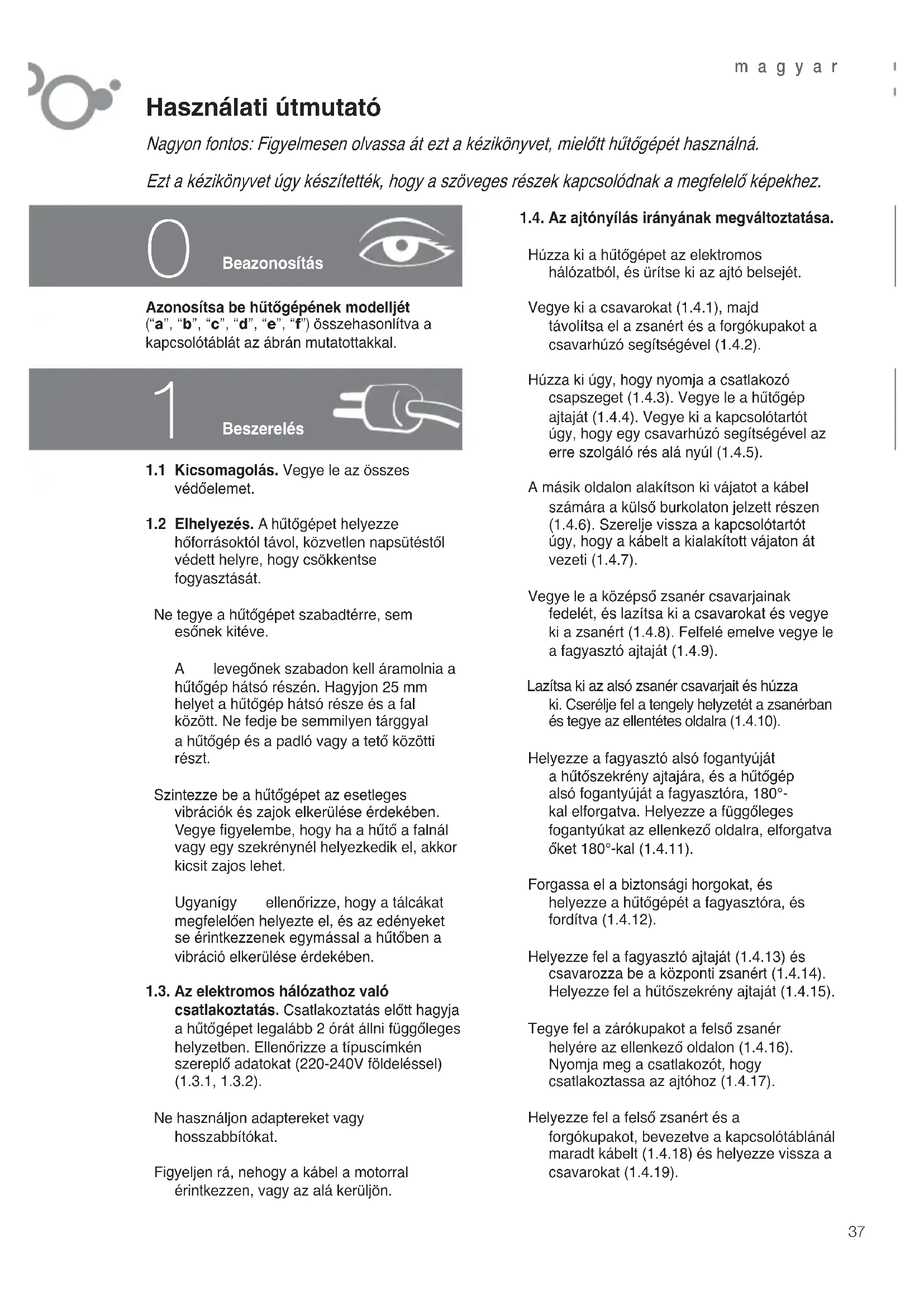 Használati útmutató Nagyon fontos: Figyelmesen olvassa át ezt a kézikönyvet, mielőtt hűtőgépét használná. Ezt a kézikönyvet úgy készítették, hogy a szöveges részek kapcsolódnak a megfelelő képekhez. Beszerelés Azonosítsa be hűtőgépének modelljét (“a”, “b”, “c”, “d”, “e”, “f”) összehasonlítva a kapcsolótáblát az ábrán mutatottakkal.1.1 Kicsomagolás. Vegye le az összes védőelemet.