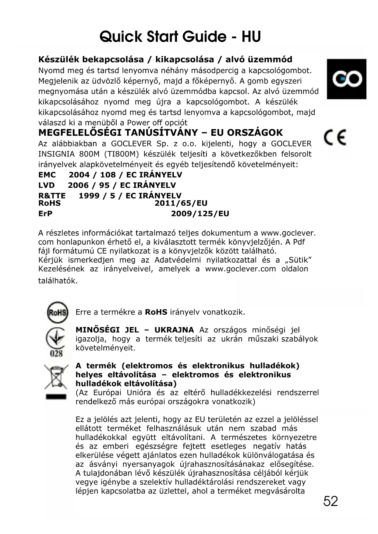 RoHS 2011/65/EU ErP 2009/125/EU A részletes információkat tartalmazó teljes dokumentum a www.goclever. com honlapunkon érhető el, a kiválasztott termék könyvjelzőjén. A Pdf fájl formátumú CE nyilatkozat is a könyvjelzők között található. Kérjük ismerkedjen meg az Adatvédelmi nyilatkozattal és a „Sütik” Kezelésének az irányelveivel, amelyek a www.goclever.com oldalon találhatók. Erre a termékre a RoHS irányelv vonatkozik. MINŐSÉGI JEL – UKRAJNA Az országos minőségi jel igazolja, hogy a termék teljesíti az ukrán műszaki szabályok követelményeit. A termék (elektromos és elektronikus hulladékok) helyes eltávolítása – elektromos és elektronikus hulladékok eltávolítása) (Az Európai Unióra és az eltérő hulladékkezelési rendszerrel rendelkező más európai országokra vonatkozik) Ez a jelölés azt jelenti, hogy az EU területén az ezzel a jelöléssel ellátott terméket felhasználásuk után nem szabad más hulladékokkal együtt eltávolítani. A természetes környezetre és az emberi egészségre fejtett esetleges negatív hatás elkerülése végett ajánlatos ezen hulladékok különválogatása és az ásványi nyersanyagok újrahasznosításánakaz elősegítése. A tulajdonában lévő készülék újrahasznosítása céljából kérjük vegye igénybe a szelektív hulladéktárolási rendszereket vagy lépjen kapcsolatba az üzlettel, ahol a terméket megvásárolta 52Lemerült elemek eltávolítása (Az Európai Unióra és az eltérő hulladékkezelési rendszerrel rendelkező más európai országokra vonatkozik) Az elemen vagy a csomagoláson található ilyen jelölés azt jelzi, hogy a termékkel együtt mellékelt elemet nem lehet háztartási hulladékként kezelni. Egyes típusú elemek esetében ez a jelölés a higany (Hg) vagy az ólom (Pb) vegyi jelével együtt jelenik meg,, ha az elem 0.0005% higanyt vagy 0.004% ólmot tartalmaz. Az ilyen típusú elem helyes eltávolításával Ön segít megelőzni a természetes környezetre vagy az emberi egészségre fejtett esetleges negatív hatást. Ajánlatos ezen hulladékok különválogatása és az ásványi nyersanyagok újrahasznosításának az elősegítése. Olyan készülékek esetében, amelyek biztonsági, kapacitási vagy adatvédelmi okokból kifolyólag folyamatos csatlakoztatást igényelnek a beépített elemmel, az elemeket kizárólag szakember cserélheti ki. Az elemeket kérjük megfelelő hulladékkezelési pontnak átnyújtani.