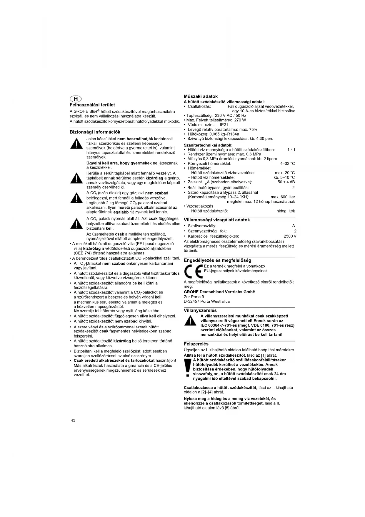 - Kalibrációs feszültséglökés: 2500 V Az elektromágneses összeférhetőség (zavarkibocsátás) vizsgálata a mérési feszültség és mérési áramerősség mellett történik. Engedélyezés és megfelelőség A megfelelőségi nyilatkozatok a következő címről rendelhetők meg: GROHE Deutschland Vertriebs GmbH Zur Porta 9 D-32457 Porta Westfalica Villanyszerelés A villanyszerelési munkákat csak szakképzett villanyszerelő végezheti el! Ennek során az IEC 60364-7-701-es (megf. VDE 0100, 701-es rész) szerinti előírásokat, valamint az összes nemzetközi és helyi előírást be kell tartani! Felszerelés Ügyeljen az I. kihajtható oldalon található beépítési méretekre. Állítsa fel a hűtött szódakészítőt, lásd az [1] ábrát. A hűtött szódakészítő szállításakor/felállításakor hűtőfolyadék kerülhet a vezetékekbe. Annak biztosítása érdekében, hogy hűtőfolyadék visszafolyjon, a hűtött szódakészítőt csak 24 óra nyugalmi idő elteltével szabad bekapcsolni. Csatlakoztassa a hűtött szódakészítőt, lásd az I. kihajtható oldalon a [2]–[4] ábrát. Nyissa meg a hideg és a meleg víz vezetékét, és ellenőrizze a csatlakozások tömítettségét, lásd a II. kihajtható oldalon lévő [5] ábrát. Ez a termék megfelel a vonatkozó EU-jogszabályok követelményeinek.44 Csatlakoztassa a hűtött szódakészítőt a szerelvényhez, lásd a [6] ábrát. Hozza létre a feszültségellátást a hálózati csatlakozón keresztül, lásd a [7] ábrát. Világít a kijelző, és százalékban mutatja a szűrő hátralévő kapacitását. Szerelje fel és csatlakoztassa a CO