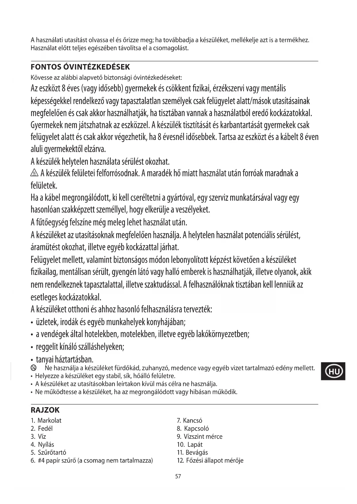 Kövesse az alábbi alapvető biztonsági óvintézkedéseket: Az eszközt 8 éves (vagy idősebb) gyermekek és csökkent fizikai, érzékszervi vagy mentális képességekkel rendelkező vagy tapasztalatlan személyek csak felügyelet alatt/mások utasításainak megfelelően és csak akkor használhatják, ha tisztában vannak a használatból eredő kockázatokkal. Gyermekek nem játszhatnak az eszközzel. A készülék tisztítását és karbantartását gyermekek csak felügyelet alatt és csak akkor végezhetik, ha 8 évesnél idősebbek. Tartsa az eszközt és a kábelt 8 éven aluli gyermekektől elzárva. A készülék helytelen használata sérülést okozhat. h A készülék felületei felforrósodnak. A maradék hő miatt használat után forróak maradnak a felületek. Ha a kábel megrongálódott, ki kell cseréltetni a gyártóval, egy szerviz munkatársával vagy egy hasonlóan szakképzett személlyel, hogy elkerülje a veszélyeket. A fűtőegység felszíne még meleg lehet használat után. A készüléket az utasításoknak megfelelően használja. A helytelen használat potenciális sérülést, áramütést okozhat, illetve egyéb kockázattal járhat. Felügyelet mellett, valamint biztonságos módon lebonyolított képzést követően a készüléket fizikailag, mentálisan sérült, gyengén látó vagy halló emberek is használhatják, illetve olyanok, akik nem rendelkeznek tapasztalattal, illetve szaktudással. A felhasználóknak tisztában kell lenniük az esetleges kockázatokkal. A készüléket otthoni és ahhoz hasonló felhasználásra tervezték: