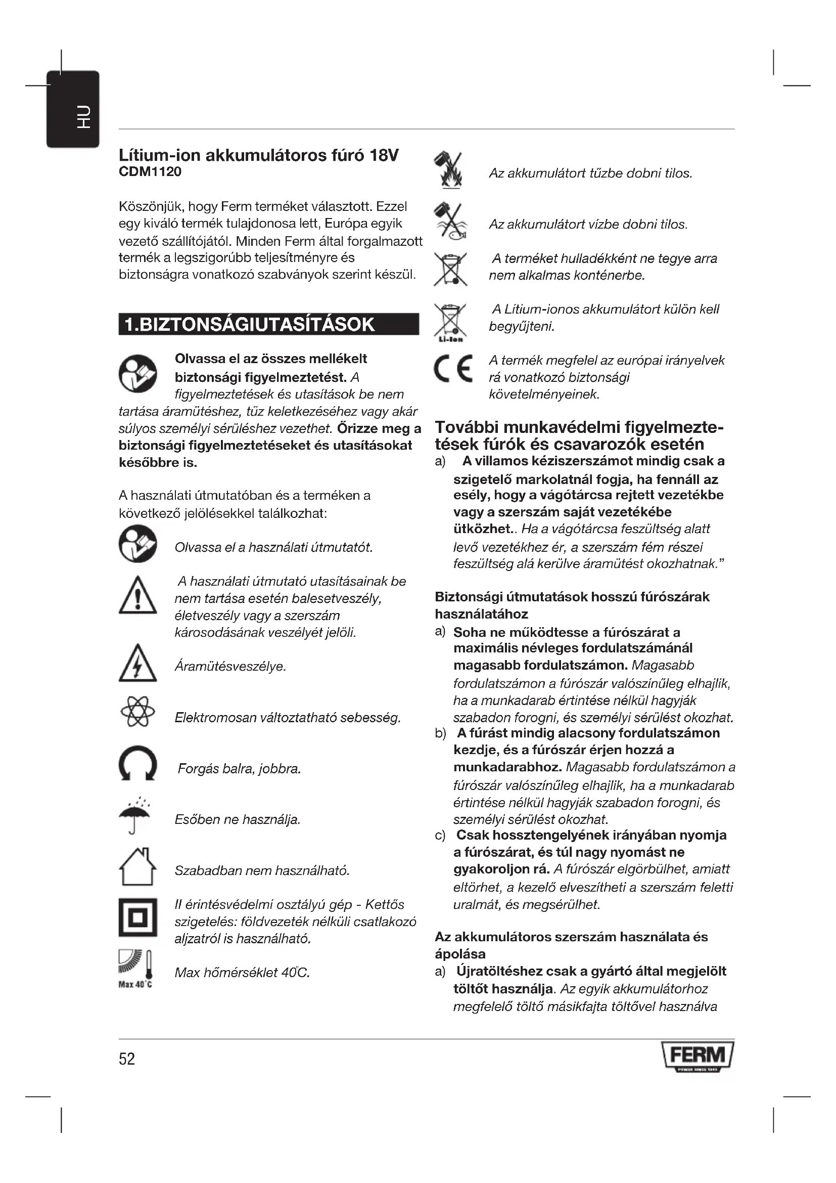 Lítium-ion akkumulátoros fúró 18V CDM1120 Köszönjük, hogy Ferm terméket választott. Ezzel egy kiváló termék tulajdonosa lett, Európa egyik vezetőszállítójától.MindenFermáltalforgalmazott termék a legszigorúbb teljesítményre és biztonságra vonatkozó szabványok szerint készül.
