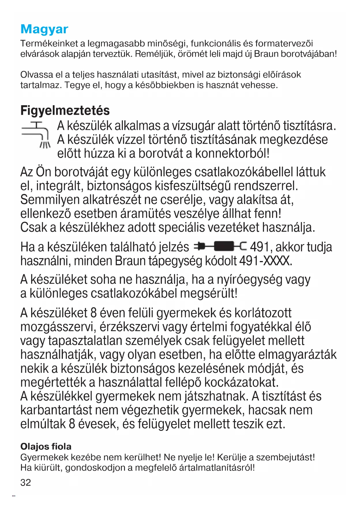 A készülék vízzel történő tisztításának megkezdése előtt húzza ki a borotvát a konnektorból! Az Ön borotváját egy különleges csatlakozókábellel láttuk el, integrált, biztonságos kisfeszültségű rendszerrel. Semmilyen alkatrészét ne cserélje, vagy alakítsa át, ellenkező esetben áramütés veszélye állhat fenn! Csak a készülékhez adott speciális vezetéket használja. Ha a készüléken található jelzés 491, akkor tudja használni, minden Braun tápegység kódolt 491-XXXX. A készüléket soha ne használja, ha a nyíróegység vagy a különleges csatlakozókábel megsérült! A készüléket 8 éven felüli gyermekek és korlátozott mozgásszervi, érzékszervi vagy értelmi fogyatékkal élő vagy tapasztalatlan személyek csak felügyelet mellett használhatják, vagy olyan esetben, ha előtte elmagyarázták nekik a készülék biztonságos kezelésének módját, és megértették a használattal fellépő kockázatokat. A készülékkel gyermekek nem játszhatnak. A tisztítást és karbantartást nem végezhetik gyermekek, hacsak nem elmúltak 8 évesek, és felügyelet mellett teszik ezt. Olajos fiola Gyermekek kezébe nem kerülhet! Ne nyelje le! Kerülje a szembejutást! Ha kiürült, gondoskodjon a megfelelő ártalmatlanításról! Magyar 91063080_BT_5090-5010_CEEMEA_S6-92.indd 3291063080_BT_5090-5010_CEEMEA_S6-92.indd 32 11.07.16 10:1311.07.16 10:13 CSS APPROVED Effective Date 5Aug2016 GMT - Printed 27Sep2016 Page 31 of 9133 Leírás 1a Precíziós fésű szakáll -és hajnyíráshoz 1b Hajnyíró fésű * 1c Fésűkioldó gombok 2 Széles trimmelő (32 mm) 3 Precíziós trimmelő (16 mm) * 4 Precíziós trimmelő kioldó gomb * 5 Üzemkijelző fény 6a Zárókapcsoló precíziós fésűhöz 6b Hosszúság-beállítás precíziós fésűhöz 6c Hosszúság-beállítás hajvágáshoz 7 Be/kikapcsoló gomb 8 Különleges csatlakozókábel (szerkezete különbözik) 8a Töltőállvány * 9 Tartótok *