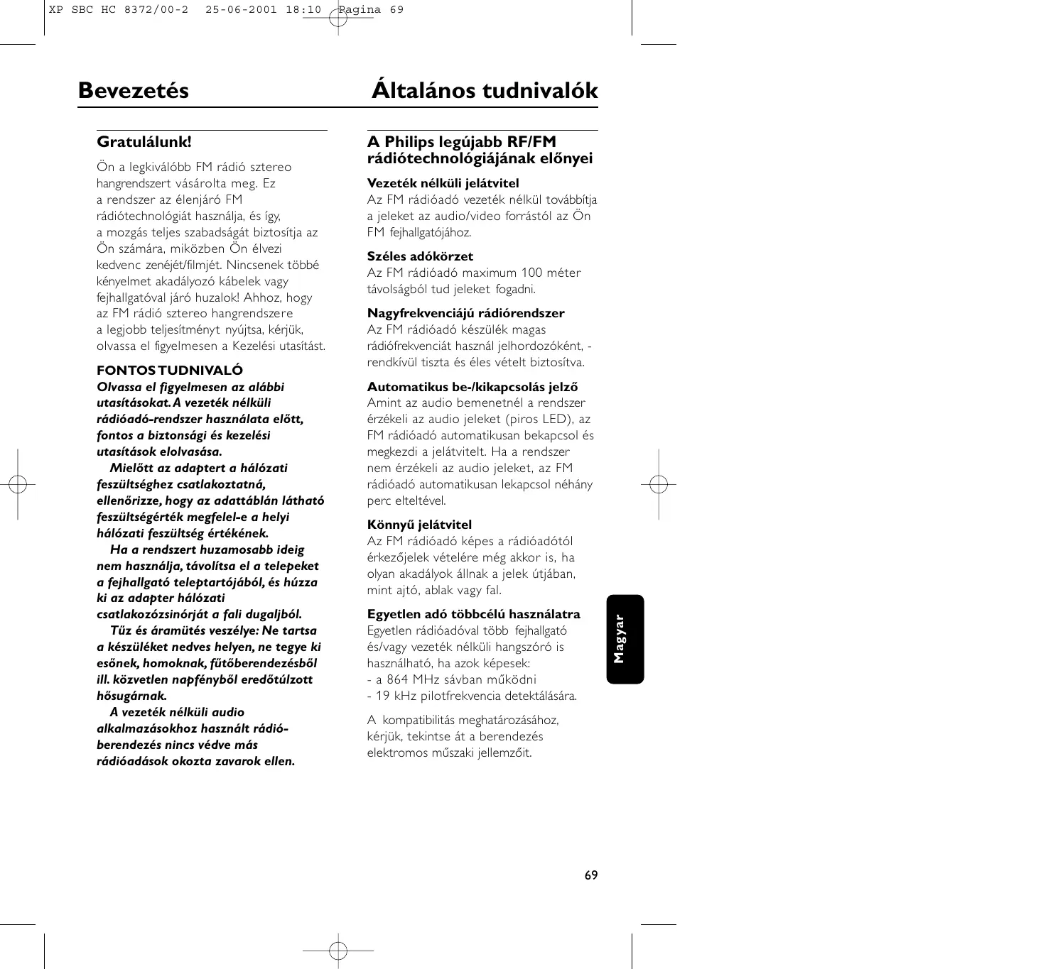 25-06-2001 18:10 Pagina 69 Bevezetés Általános tudnivalók Gratulálunk! A Philips legújabb RF/FM rádiótechnológiájának előnyei FONTOS TUDNIVALÓ Olvassa el figyelmesen az alábbi utasításokat.A vezeték nélküli rádióadó-rendszer használata előtt, fontos a biztonsági és kezelési utasítások elolvasása. Mielőtt az adaptert a hálózati feszültséghez csatlakoztatná, ellenőrizze, hogy az adattáblán látható feszültségérték megfelel-e a helyi hálózati feszültség értékének. Ha a rendszert huzamosabb ideig nem használja, távolítsa el a telepeket a fejhallgató teleptartójából, és húzza ki az adapter hálózati csatlakozózsinórját a fali dugaljból. Tűz és áramütés veszélye: Ne tartsa a készüléket nedves helyen, ne tegye ki esőnek, homoknak, fűtőberendezésből ill. közvetlen napfényből eredőtúlzott hősugárnak. A vezeték nélküli audio alkalmazásokhoz használt rádióberendezés nincs védve más rádióadások okozta zavarok ellen. Vezeték nélküli jelátvitel Az FM rádióadó vezeték nélkül továbbítja a jeleket az audio/video forrástól az Ön FM fejhallgatójához. Széles adókörzet Az FM rádióadó maximum 100 méter távolságból tud jeleket fogadni. Nagyfrekvenciájú rádiórendszer Az FM rádióadó készülék magas rádiófrekvenciát használ jelhordozóként, rendkívül tiszta és éles vételt biztosítva. Automatikus be-/kikapcsolás jelző Amint az audio bemenetnél a rendszer érzékeli az audio jeleket (piros LED), az FM rádióadó automatikusan bekapcsol és megkezdi a jelátvitelt. Ha a rendszer nem érzékeli az audio jeleket, az FM rádióadó automatikusan lekapcsol néhány perc elteltével. Könnyű jelátvitel Az FM rádióadó képes a rádióadótól érkezőjelek vételére még akkor is, ha olyan akadályok állnak a jelek útjában, mint ajtó, ablak vagy fal. Egyetlen adó többcélú használatra Egyetlen rádióadóval több fejhallgató és/vagy vezeték nélküli hangszóró is használható, ha azok képesek: - a 864 MHz sávban működni - 19 kHz pilotfrekvencia detektálására. Magyar Ön a legkiválóbb FM rádió sztereo hangrendszert vásárolta meg. Ez a rendszer az élenjáró FM rádiótechnológiát használja, és így, a mozgás teljes szabadságát biztosítja az Ön számára, miközben Ön élvezi kedvenc zenéjét/filmjét. Nincsenek többé kényelmet akadályozó kábelek vagy fejhallgatóval járó huzalok! Ahhoz, hogy az FM rádió sztereo hangrendszere a legjobb teljesítményt nyújtsa, kérjük, olvassa el figyelmesen a Kezelési utasítást. A kompatibilitás meghatározásához, kérjük, tekintse át a berendezés elektromos műszaki jellemzőit.