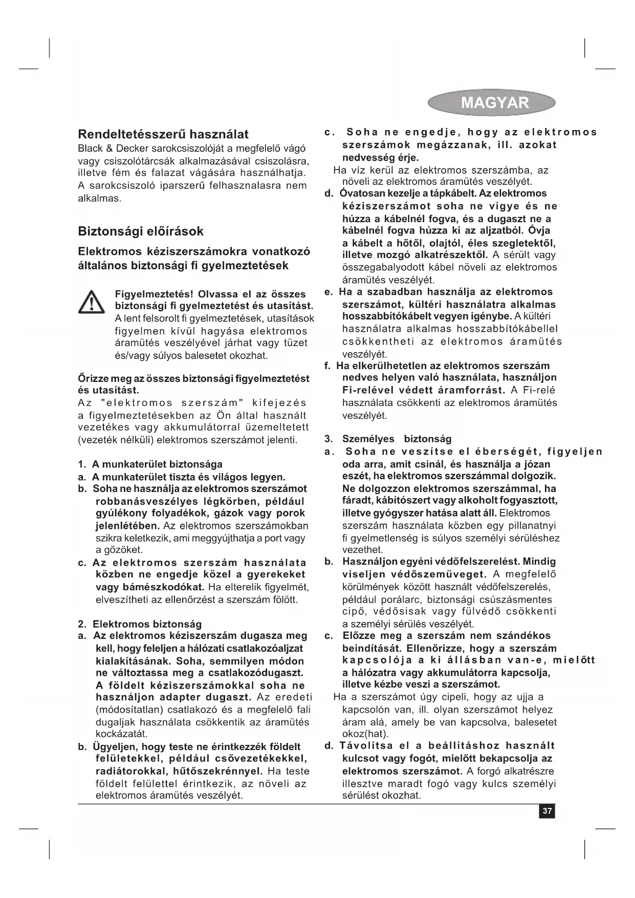 a jótállás – kijavítás időtartamával meghosszabbított – új határidejét. A termék meghibásodása esetén a fogyasztót az alábbi jogok illetik meg: Elsősorban - választása szerint - kijavítást vagy kicserélést követelhet. A csereigény akkor megalapozott, ha a termék a fogyasztónak okozott jelentős kényelmetlenség nélkül, megfelelő minőségben és ésszerű határidőn belül, értékcsökkenés nélkül nem javítható ki, vagy nem kerül kijavításra. Ha az előírt módon történő kijavításra, illetve kicserélésre vonatkozó kötelezettségének a forgalmazó nem tud eleget tenni, a fogyasztó – választása szerint – megfelelő árleszállítást igényelhet vagy elállhat a szerződéstől (a hibás áru visszaszolgáltatásával egyidejűleg kérheti a nyugtán vagy számlán feltüntetett bruttó vételár visszatérítését). Jelentéktelen hiba miatt elállásnak nincs helye! Kérjük, hogy a hiba felfedezését követő legrövidebb időn belül szíveskedjen azt a szervizben vagy a forgalmazónál bejelenteni. A kijavítást vagy kicserélést - a dolog tulajdonságaira és a fogyasztó által elvárható rendeltetésére fi gyelemmel - megfelelő határidőn belül, a fogyasztónak okozott jelentős kényelmetlenség nélkül kell elvégezni. A fogyasztó a kijavítás iránti igényét a jótállási jegyen feltüntetett javítószolgálatnál, illetve a forgalmazó (kereskedő) üzletében érvényesítheti. Gyártó: Forgalmazó: Black & Decker Europe, Stanley Black & Decker Hungary Kft 210 Bath Road, Slough, 1016. Budapest, Berkshire, SL13YD, Mészáros u. 58/B Egyesült Királyság46 POLSKI Przeznaczenie Opisywana szlifierka kątowa Black & Decker jest przeznaczona do szlifowania i cięcia metali i betonu przy użyciu odpowiedniego rodzaju tarcz. Opisywane urządzenie jest przeznaczone wyłącznie do użytku amatorskiego. Należy używać osłony. Zasady bezpiecznej pracy Ogólne wskazówki dotyczące bezpiecznego użytkowania elektronarzędzi Uwaga! Należy zapoznać się ze wszystkimi ostrzeżeniami dotyczącymi bezpiecznej pracy oraz z instrukcją obsługi. Nie stosowananie się do ostrzeżeń i zaleceń zawartych w tej instrukcji obsługi, może być przyczyną porażenia prądem elektrycznym, pożaru i/lub poważnego zranienia. Zachowaj wszystkie instrukcje i informacje dotyczące bezpiecznej pracy, aby móc korzystać z nich w przyszłości. Pojęcie “elektronarzędzie” używane w niniejszej instrukcji, oznacza narzędzie zasilane z sieci elektrycznej (przewodem zasilającym) lub akumulatorami (bezprzewodowe).