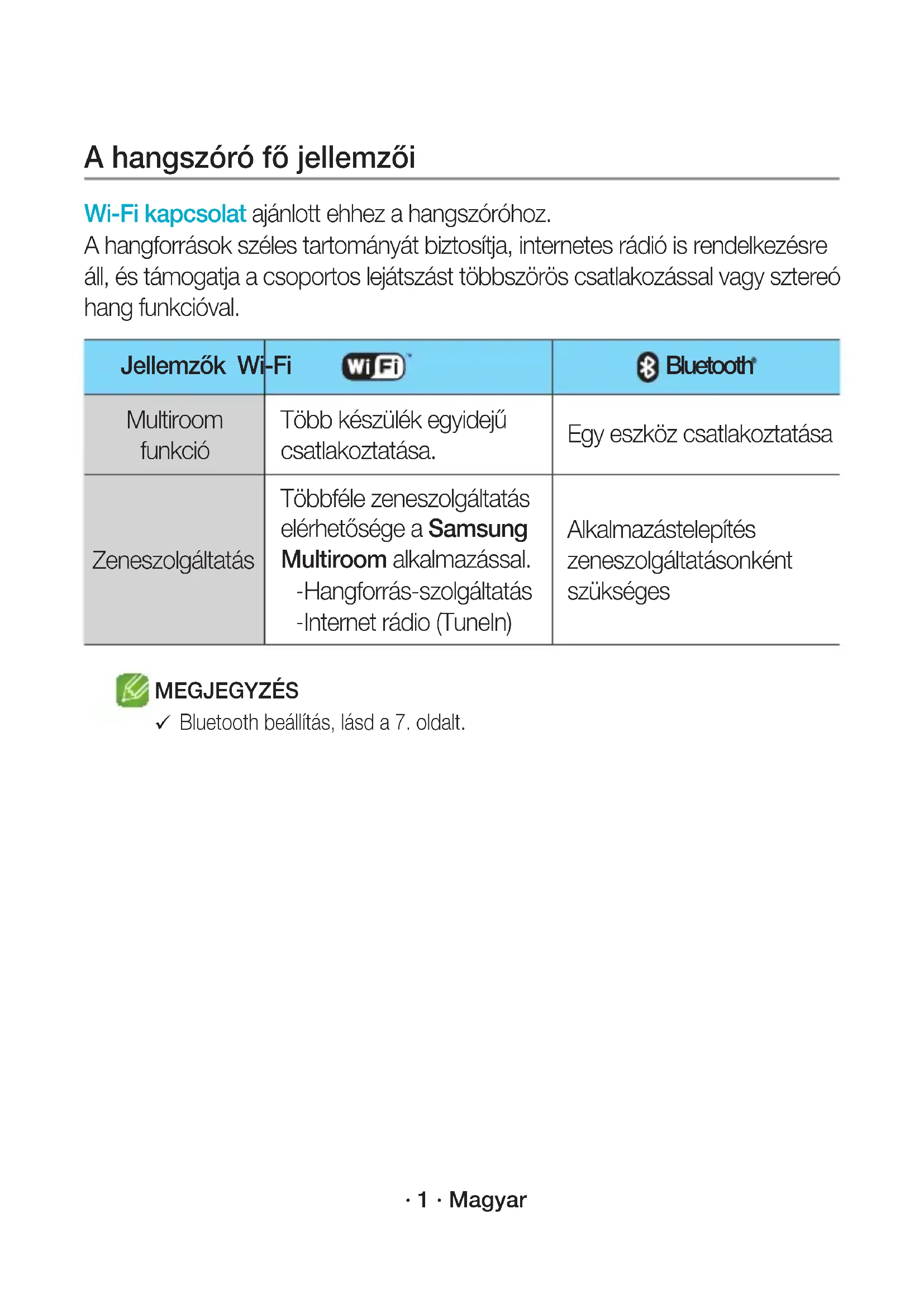 Εάν η σύνδεση δεν είναι εφικτή, ανατρέξτε στην ενότητα “Λίστα με τους ελέγχους που πρέπει να πραγματοποιήσετε πριν από τη σύνδεση” στις σελίδες 9 και 10. WAM3501-EN_15p-GRE-QSG_0901.indd 15 2016-09-01 4:53:00· 1 · Magyar A hangszóró fő jellemzői Wi-Fi kapcsolat ajánlott ehhez a hangszóróhoz. A hangforrások széles tartományát biztosítja, internetes rádió is rendelkezésre áll, és támogatja a csoportos lejátszást többszörös csatlakozással vagy sztereó hang funkcióval. Jellemzők Wi-Fi Bluetooth Multiroom funkció Több készülék egyidejű csatlakoztatása. Egy eszköz csatlakoztatása Zeneszolgáltatás Többféle zeneszolgáltatás elérhetősége a Samsung Multiroom alkalmazással. - Hangforrás-szolgáltatás - Internet rádio (TuneIn) Alkalmazástelepítés zeneszolgáltatásonként szükséges MEGJEGYZÉS