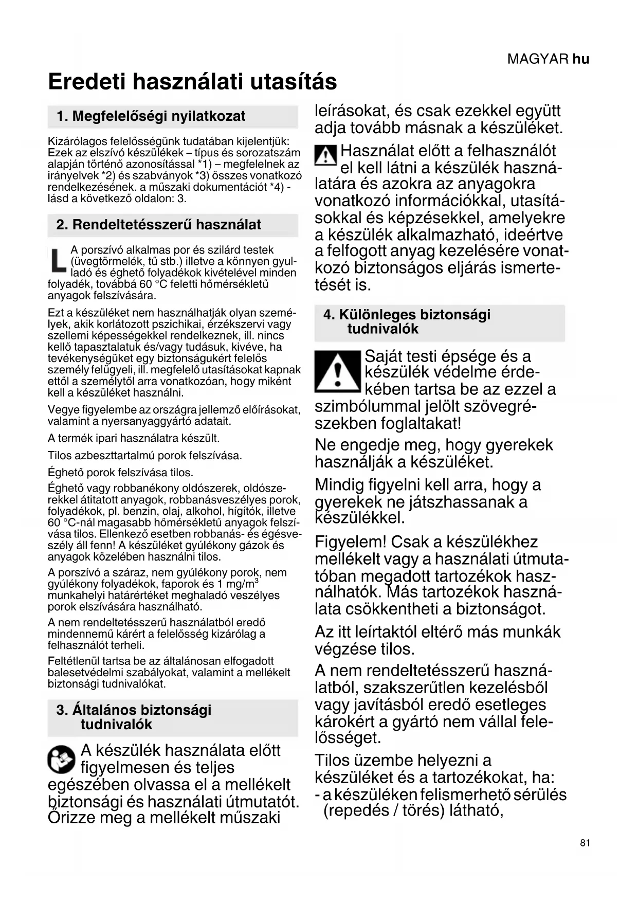 Eredeti használati utasítás Kizárólagos felelősségünk tudatában kijelentjük: Ezek az elszívó készülékek – típus és sorozatszám alapján történő azonosítással *1) – megfelelnek az irányelvek *2) és szabványok *3) összes vonatkozó rendelkezésének. a műszaki dokumentációt *4) - lásd a következő oldalon: 3. A porszívó alkalmas por és szilárd testek (üvegtörmelék, tű stb.) illetve a könnyen gyul- ladó és éghető folyadékok kivételével minden folyadék, továbbá 60 °C feletti hőmérsékletű anyagok felszívására. Ezt a készüléket nem használhatják olyan szemé- lyek, akik korlátozott pszichikai, érzékszervi vagy szellemi képességekkel rendelkeznek, ill. nincs kellő tapasztalatuk és/vagy tudásuk, kivéve, ha tevékenységüket egy biztonságukért felelős személy felügyeli, ill. megfelelő utasításokat kapnak ettől a személytől arra vonatkozóan, hogy miként kell a készüléket használni. Vegye figyelembe az országra jellemző előírásokat, valamint a nyersanyaggyártó adatait. A termék ipari használatra készült. Tilos azbeszttartalmú porok felszívása. Éghető porok felszívása tilos. Éghető vagy robbanékony oldószerek, oldósze- rekkel átitatott anyagok, robbanásveszélyes porok, folyadékok, pl. benzin, olaj, alkohol, hígítók, illetve 60 °C-nál magasabb hőmérsékletű anyagok felszí- vása tilos. Ellenkező esetben robbanás- és égésve- szély áll fenn! A készüléket gyúlékony gázok és anyagok közelében használni tilos. A porszívó a száraz, nem gyúlékony porok, nem gyúlékony folyadékok, faporok és 1 mg/m³ munkahelyi határértéket meghaladó veszélyes porok elszívására használható. A nem rendeltetésszerű használatból eredő mindennemű kárért a felelősség kizárólag a felhasználót terheli. Feltétlenül tartsa be az általánosan elfogadott balesetvédelmi szabályokat, valamint a mellékelt biztonsági tudnivalókat. A készülék használata előtt figyelmesen és teljes egészében olvassa el a mellékelt biztonsági és használati útmutatót. Őrizze meg a mellékelt műszaki leírásokat, és csak ezekkel együtt adja tovább másnak a készüléket. Használat előtt a felhasználót el kell látni a készülék haszná- latára és azokra az anyagokra vonatkozó információkkal, utasítá- sokkal és képzésekkel, amelyekre a készülék alkalmazható, ideértve a felfogott anyag kezelésére vonat- kozó biztonságos eljárás ismerte- tését is. Saját testi épsége és a készülék védelme érde- kében tartsa be az ezzel a szimbólummal jelölt szövegré- szekben foglaltakat! Ne engedje meg, hogy gyerekek használják a készüléket. Mindig figyelni kell arra, hogy a gyerekek ne játszhassanak a készülékkel. Figyelem! Csak a készülékhez mellékelt vagy a használati útmuta- tóban megadott tartozékok hasz- nálhatók. Más tartozékok haszná- lata csökkentheti a biztonságot. Az itt leírtaktól eltérő más munkák végzése tilos. A nem rendeltetésszerű haszná- latból, szakszerűtlen kezelésből vagy javításból eredő esetleges károkért a gyártó nem vállal fele- lősséget. Tilos üzembe helyezni a készüléket és a tartozékokat, ha: - a készüléken felismerhető sérülés (repedés / törés) látható,