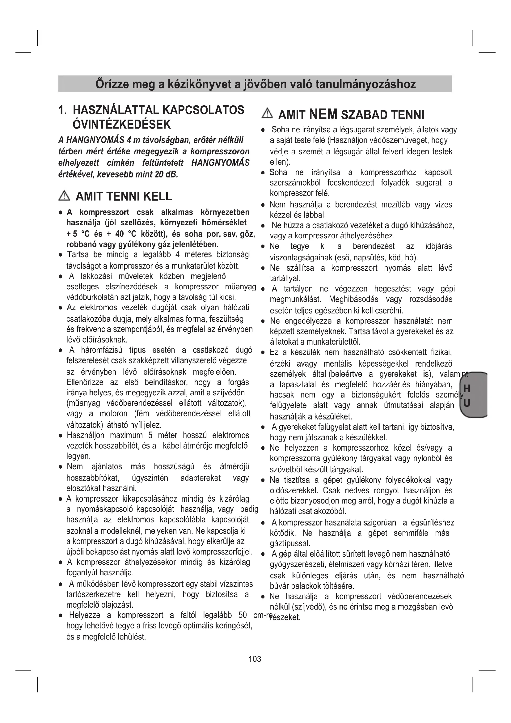 Ne szállítsa a kompresszort nyomás alatt lévő tartállyal. ● A tartályon ne végezzen hegesztést vagy gépi megmunkálást. Meghibásodás vagy rozsdásodás esetén teljes egészében ki kell cserélni. ● Ne engedélyezze a kompresszor használatát nem képzett személyeknek. Tartsa távol a gyerekeket és az állatokatamunkaterülettől. ● Ez a készülék nem használható csökkentett fizikai, érzéki avagy mentális képességekkel rendelkező személyek által(beleértve a gyerekeket is), valamint a tapasztalat és megfelelő hozzáértés hiányában, hacsak nem egy a biztonságukért felelős személy felügyelete alatt vagy annak útmutatásai alapján használjákakészüléket. ● Agyerekeketfelügyeletalattkelltartani,ígybiztosítva, hogynemjátszanakakészülékkel. ● Ne helyezzen a kompresszorhoz közel és/vagy a kompresszorra gyúlékony tárgyakat vagy nylonból és szövetbőlkészülttárgyakat. ● Ne tisztítsa a gépet gyúlékony folyadékokkal vagy oldószerekkel. Csak nedves rongyot használjon és előttebizonyosodjonmegarról,hogyadugótkihúztaa hálózati csatlakozóból. ● Akompresszorhasználataszigorúan alégsűrítéshez kötődik. Ne használja a gépet semmiféle más gáztípussal. ● Agépáltalelőállítottsűrítettlevegőnemhasználható gyógyszerészeti,élelmiszerivagykórházitéren,illetve csak különleges eljárás után, és nem használható búvár palackok töltésére. ● Ne használja a kompresszort védőberendezések nélkül(szíjvédő),ésneérintsemegamozgásbanlevő részeket.H