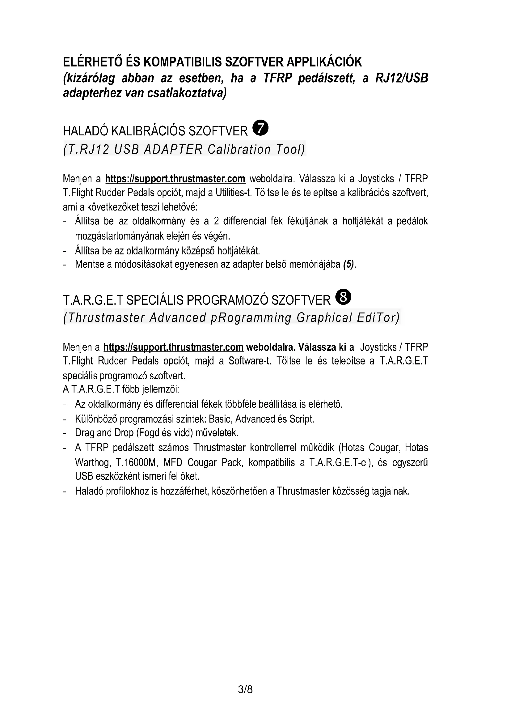 (T.RJ12 USB ADAPTER Calibration Tool) Menjen a https://support.thrustmaster.com weboldalra. Válassza ki a Joysticks / TFRP T.Flight Rudder Pedals opciót, majd a Utilities-t. Töltse le és telepítse a kalibrációs szoftvert, ami a következőket teszi lehetővé: - Állítsa be az oldalkormány és a 2 differenciál fék fékútjának a holtjátékát a pedálok mozgástartományának elején és végén. - Állítsa be az oldalkormány középső holtjátékát. - Mentse a módosításokat egyenesen az adapter belső memóriájába (5). T.A.R.G.E.T SPECIÁLIS PROGRAMOZÓ SZOFTVER (Thrustmaster Advanced pRogramming Graphical EdiTor) Menjen a https://support.thrustmaster.com weboldalra. Válassza ki a Joysticks / TFRP T.Flight Rudder Pedals opciót, majd a Software-t. Töltse le és telepítse a T.A.R.G.E.T speciális programozó szoftvert. A T.A.R.G.E.T főbb jellemzői: - Az oldalkormány és differenciál fékek többféle beállítása is elérhető. - Különböző programozási szintek: Basic, Advanced és Script. - Drag and Drop (Fogd és vidd) műveletek. - A TFRP pedálszett számos Thrustmaster kontrollerrel működik (Hotas Cougar, Hotas Warthog, T.16000M, MFD Cougar Pack, kompatibilis a T.A.R.G.E.T-el), és egyszerű USB eszközként ismeri fel őket. - Haladó profilokhoz is hozzáférhet, köszönhetően a Thrustmaster közösség tagjainak.4/8