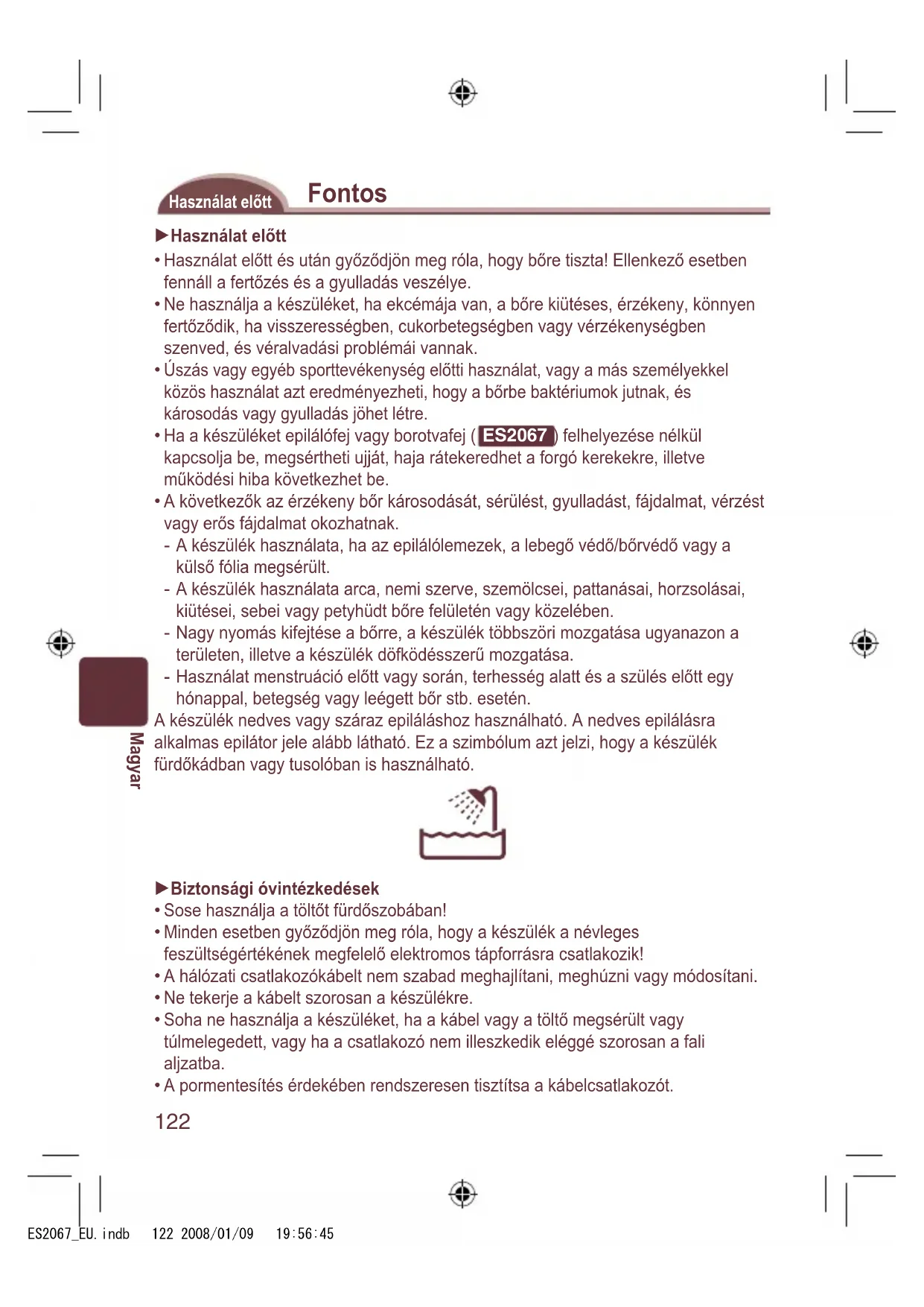 Suport Accesorii: Încărcător (RE7-46), perie de curăţare şi pungă (Vă rugăm să nu folosiţi alte accesorii decât cele furnizate.) ES2067_EU.indb 121 2008/01/09 19:56:45122 Magyar Fontos Használat előtt Használat előtt Használat előtt és után győződjön meg róla, hogy bőre tiszta! Ellenkező esetben fennáll a fertőzés és a gyulladás veszélye. Ne használja a készüléket, ha ekcémája van, a bőre kiütéses, érzékeny, könnyen fertőződik, ha visszerességben, cukorbetegségben vagy vérzékenységben szenved, és véralvadási problémái vannak. Úszás vagy egyéb sporttevékenység előtti használat, vagy a más személyekkel közös használat azt eredményezheti, hogy a bőrbe baktériumok jutnak, és károsodás vagy gyulladás jöhet létre. Ha a készüléket epilálófej vagy borotvafej ( ES2067 ) felhelyezése nélkül kapcsolja be, megsértheti ujját, haja rátekeredhet a forgó kerekekre, illetve működési hiba következhet be. A következők az érzékeny bőr károsodását, sérülést, gyulladást, fájdalmat, vérzést vagy erős fájdalmat okozhatnak. A készülék használata, ha az epilálólemezek, a lebegő védő/bőrvédő vagy a külső fólia megsérült. A készülék használata arca, nemi szerve, szemölcsei, pattanásai, horzsolásai, kiütései, sebei vagy petyhüdt bőre felületén vagy közelében. Nagy nyomás kifejtése a bőrre, a készülék többszöri mozgatása ugyanazon a területen, illetve a készülék döfködésszerű mozgatása. Használat menstruáció előtt vagy során, terhesség alatt és a szülés előtt egy hónappal, betegség vagy leégett bőr stb. esetén. A készülék nedves vagy száraz epiláláshoz használható. A nedves epilálásra alkalmas epilátor jele alább látható. Ez a szimbólum azt jelzi, hogy a készülék fürdőkádban vagy tusolóban is használható. Biztonsági óvintézkedések Sose használja a töltőt fürdőszobában! Minden esetben győződjön meg róla, hogy a készülék a névleges feszültségértékének megfelelő elektromos tápforrásra csatlakozik! A hálózati csatlakozókábelt nem szabad meghajlítani, meghúzni vagy módosítani. Ne tekerje a kábelt szorosan a készülékre. Soha ne használja a készüléket, ha a kábel vagy a töltő megsérült vagy túlmelegedett, vagy ha a csatlakozó nem illeszkedik eléggé szorosan a fali aljzatba. A pormentesítés érdekében rendszeresen tisztítsa a kábelcsatlakozót.