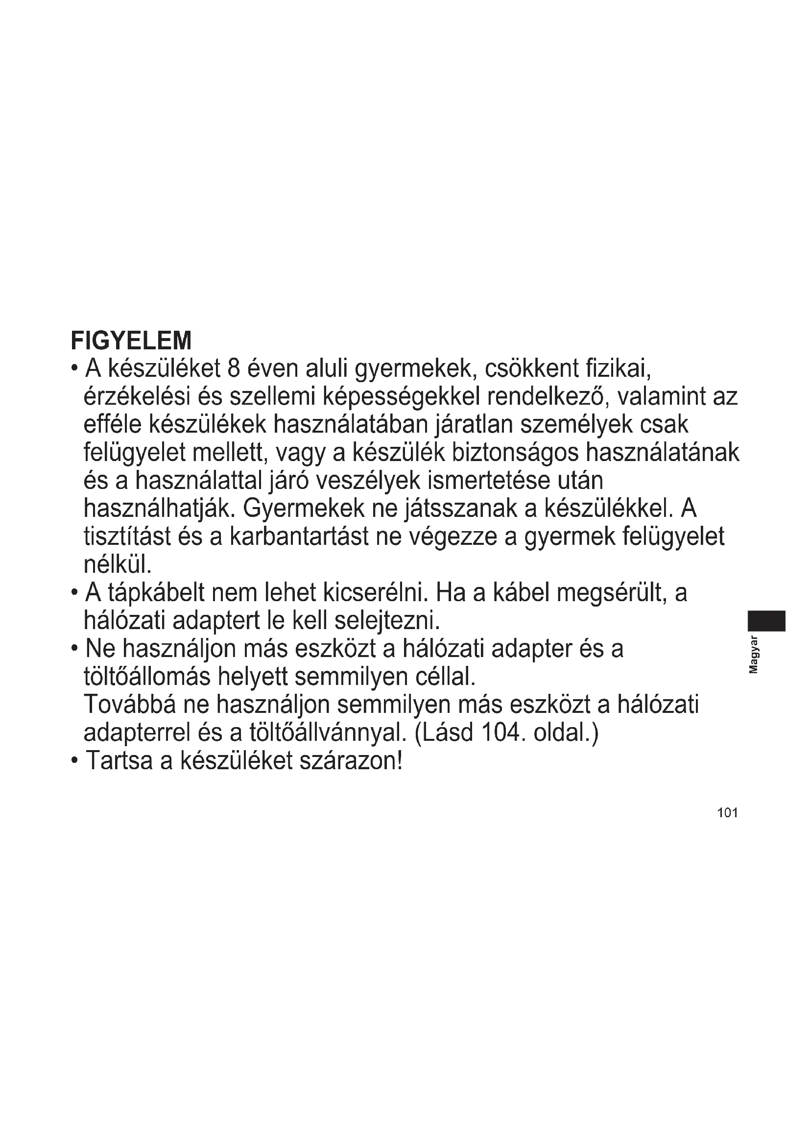 - A készüléket 8 éven aluli gyermekek, csökkent zikai, érzékelési és szellemi képességekkel rendelkező, valamint az efféle készülékek használatában járatlan személyek csak felügyelet mellett, vagy a készülék biztonságos használatának és a használattal járó veszélyek ismertetése után használhatják. Gyermekek ne játsszanak a készülékkel. A tisztítást és a karbantartást ne végezze a gyermek felügyelet nélkül.