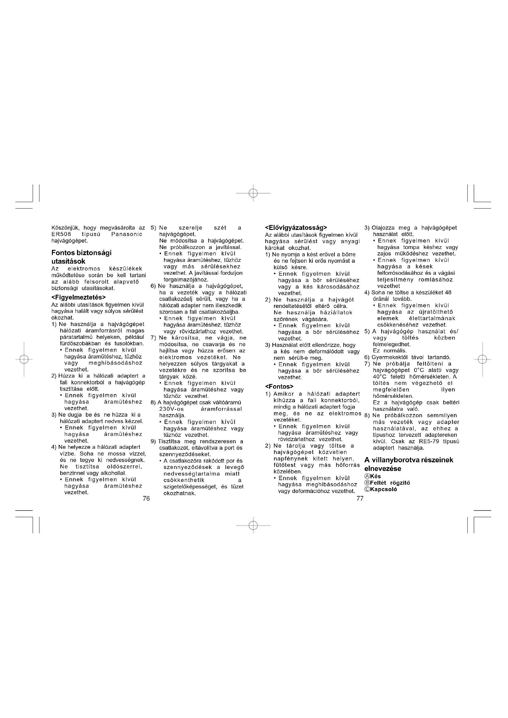 Köszönjük, hogy megvásárolta az ER508 típusú Panasonic hajvágógépet. Fontos biztonsági utasítások Az elektromos készülékek működtetése során be kell tartani az alább felsorolt alapvető biztonsági utasításokat. <Figyelmeztetés> Az alábbi utasítások figyelmen kívül hagyása halált vagy súlyos sérülést okozhat.