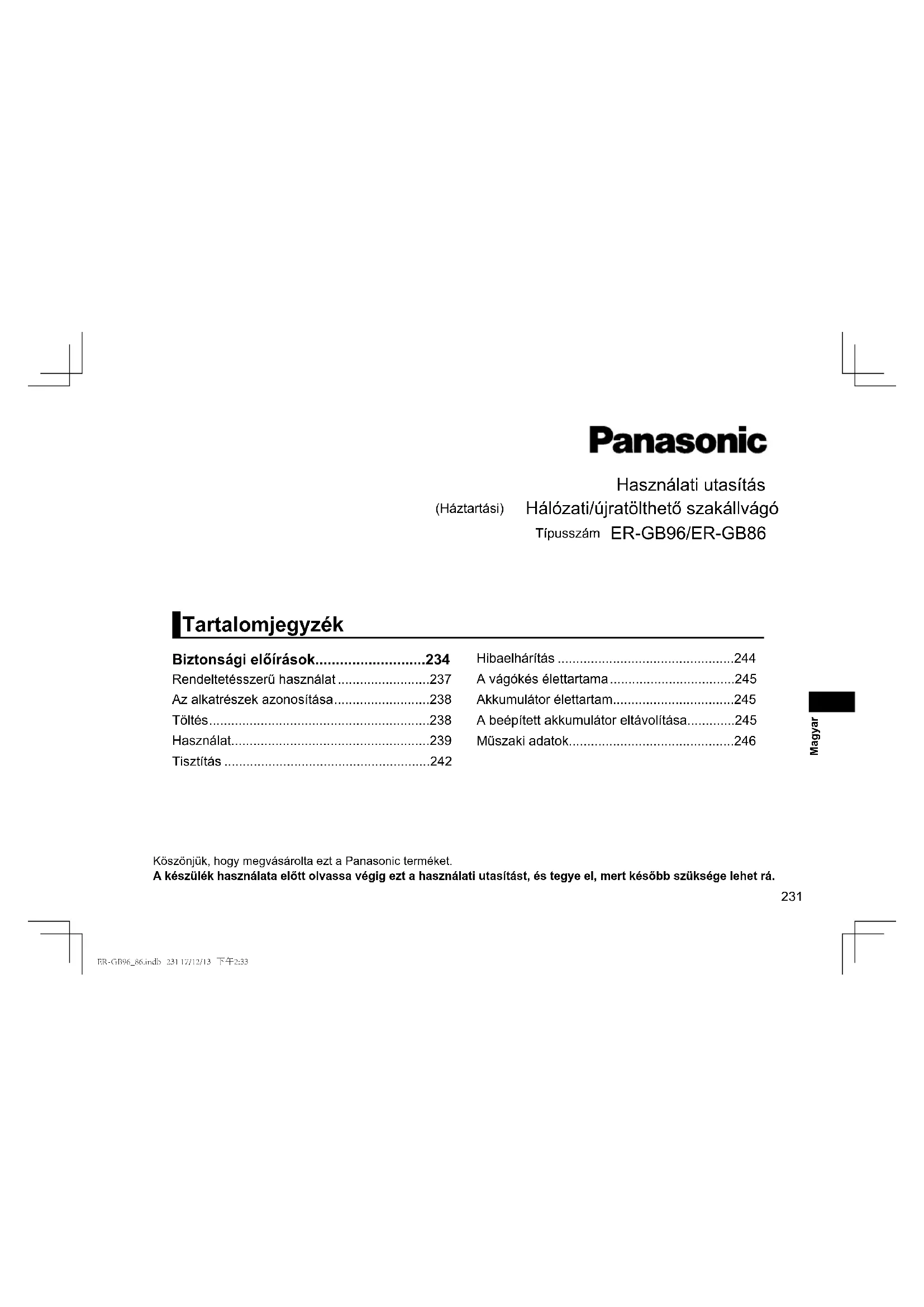 - Panasonic WES003P kenőolaj használatát ajánljuk. ER-GB96_86.indb 243 17/12/13 下午2:33244 Magyar