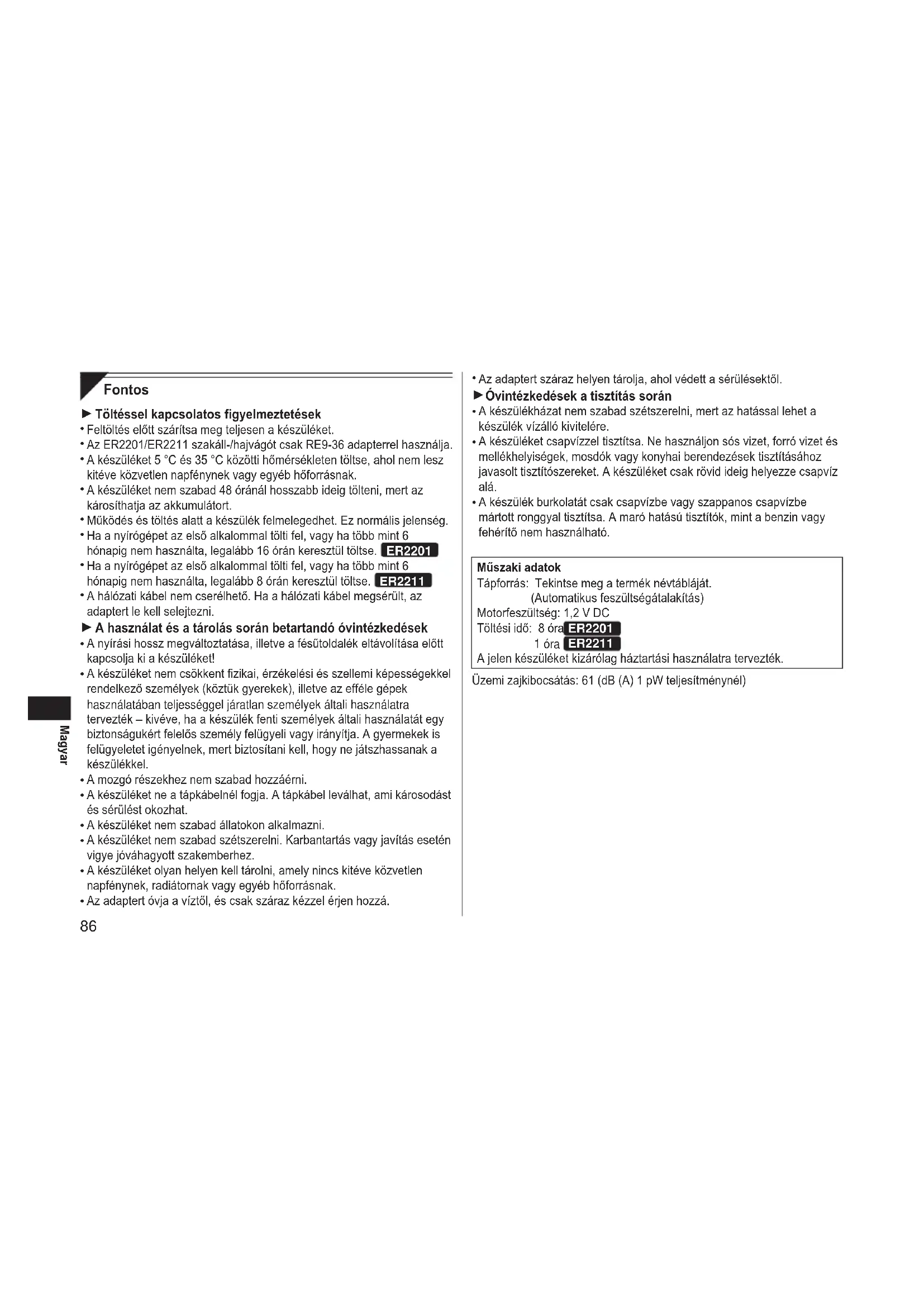 Az adaptert száraz helyen tárolja, ahol védett a sérülésektől. Óvintézkedések a tisztítás során A készülékházat nem szabad szétszerelni, mert az hatással lehet a készülék vízálló kivitelére. A készüléket csapvízzel tisztítsa. Ne használjon sós vizet, forró vizet és mellékhelyiségek, mosdók vagy konyhai berendezések tisztításához javasolt tisztítószereket. A készüléket csak rövid ideig helyezze csapvíz alá. A készülék burkolatát csak csapvízbe vagy szappanos csapvízbe mártott ronggyal tisztítsa. A maró hatású tisztítók, mint a benzin vagy fehérítő nem használható. Műszaki adatok Tápforrás: Tekintse meg a termék névtábláját. (Automatikus feszültségátalakítás) Motorfeszültség: 1,2 V DC Töltési idő: 8 óra ER2201 1 óra ER2211 A jelen készüléket kizárólag háztartási használatra tervezték. Üzemi zajkibocsátás: 61 (dB (A) 1 pW teljesítménynél)