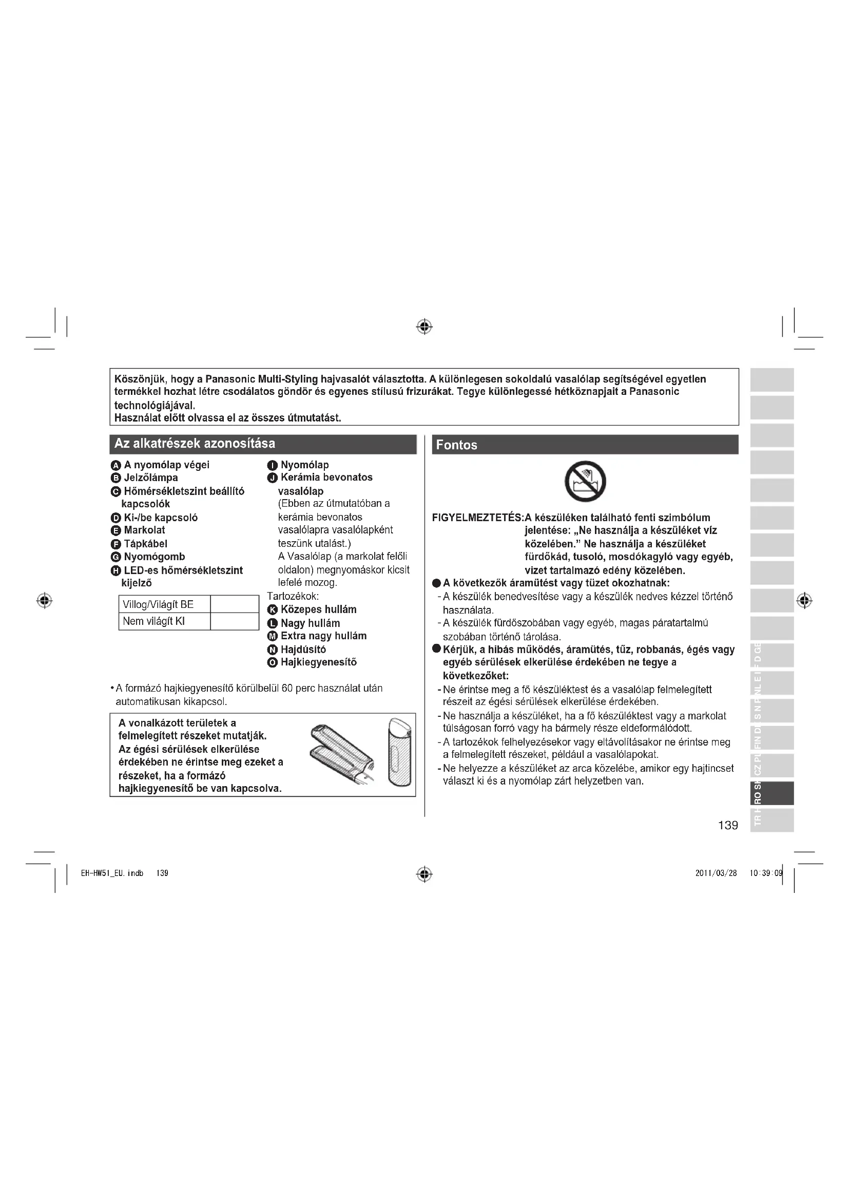 EH-HW51_EU.indb 138 2011/03/28 10:39:09139 TR H RO SK CZ PL FIN DK S N P NL E I F D GB Köszönjük, hogy a Panasonic Multi-Styling hajvasalót választotta. A különlegesen sokoldalú vasalólap segítségével egyetlen termékkel hozhat létre csodálatos göndör és egyenes stílusú frizurákat. Tegye különlegessé hétköznapjait a Panasonic technológiájával. Használat előtt olvassa el az összes útmutatást. Az alkatrészek azonosítása