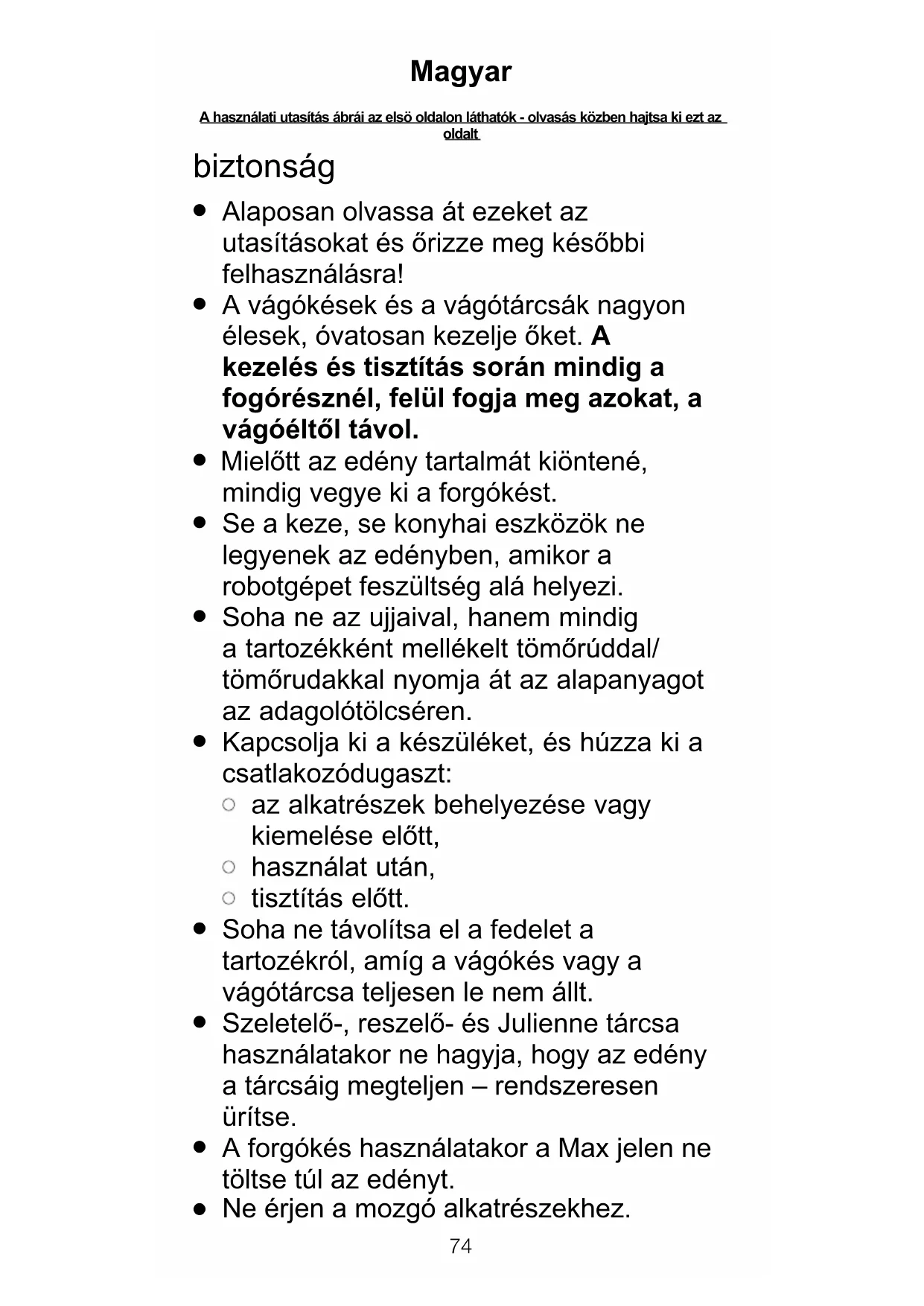 A többi alkatrészt mossa el meleg mosogatószeres vízzel, majd alaposan szárítsa meg. Vigyázzon, mert a kések és a vágótárcsák élesek. Másik megoldásként mosogatógépben is tisztíthatók (csak a felső rekeszen).