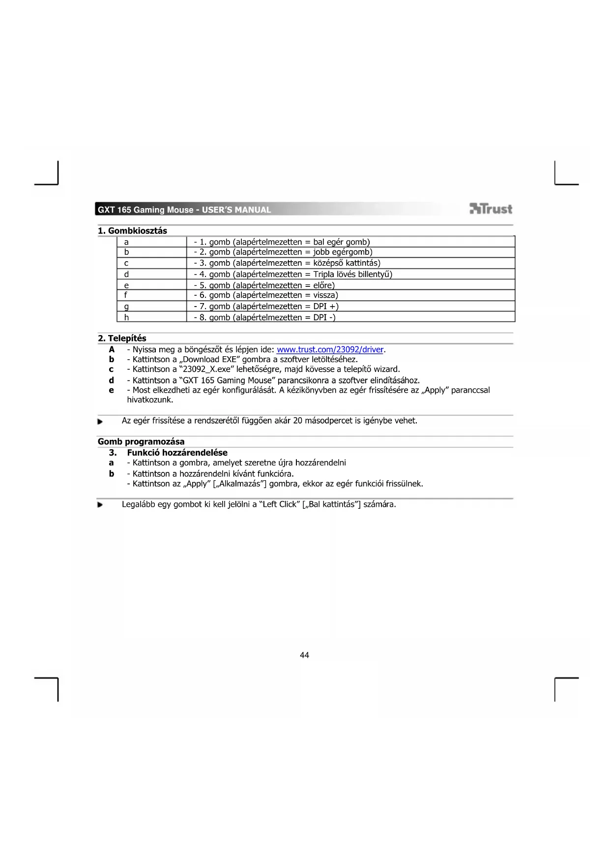 - Nyissa meg a böngészőt és lépjen ide: www.trust.com/23092/driver. - Kattintson a „Download EXE” gombra a szoftver letöltéséhez. - Kattintson a “23092_X.exe” lehetőségre, majd kövesse a telepítő wizard. - Kattintson a “GXT 165 Gaming Mouse” parancsikonra a szoftver elindításához. - Most elkezdheti az egér konfigurálását. A kézikönyvben az egér frissítésére az „Apply” paranccsal hivatkozunk. Az egér frissítése a rendszerétől függően akár 20 másodpercet is igénybe vehet. Gomb programozása