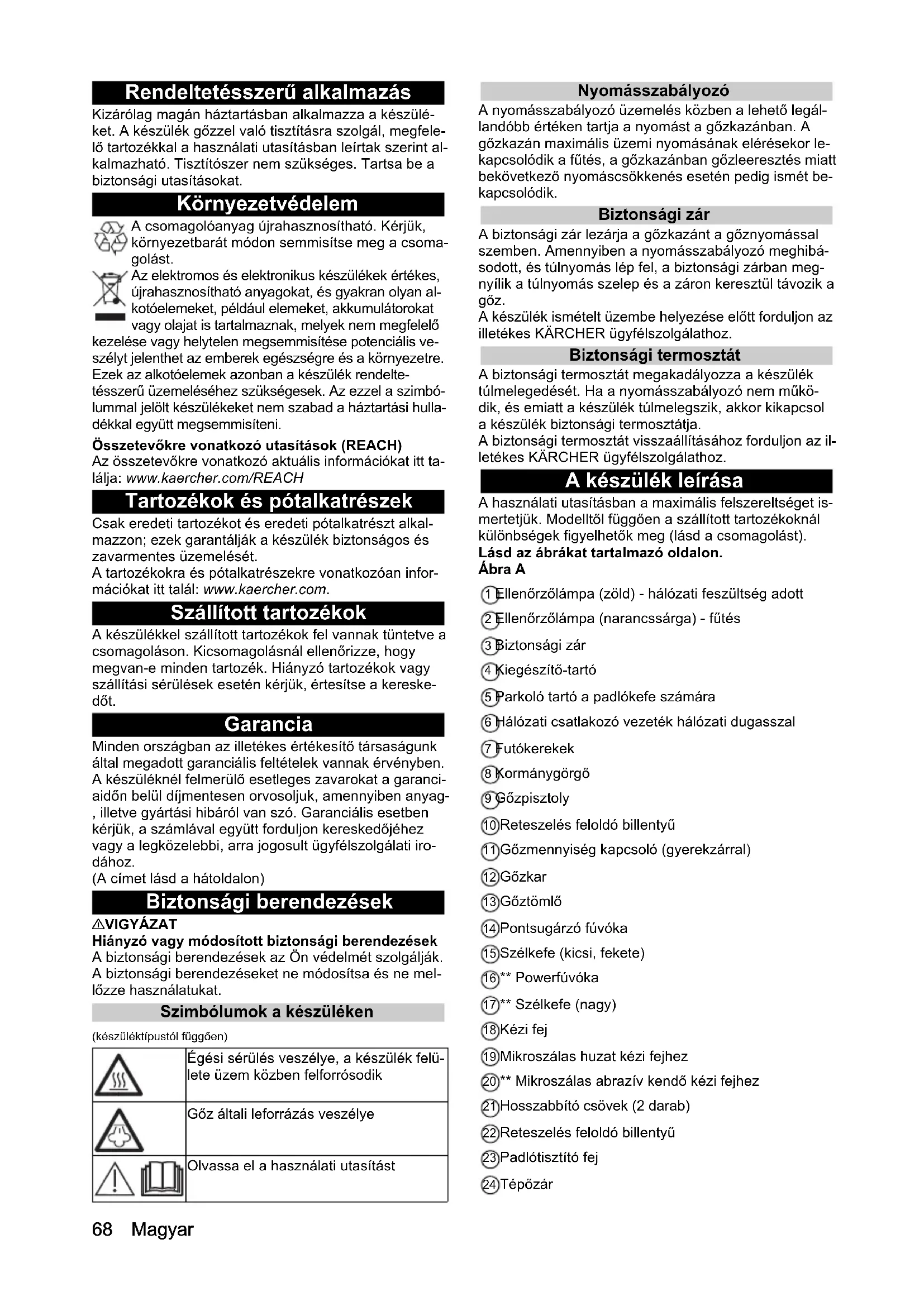 - Műszaki adatok Magyar Rendeltetésszerű alkalmazás Kizárólag magán háztartásban alkalmazza a készülé- ket. A készülék gőzzel való tisztításra szolgál, megfele- lő tartozékkal a használati utasításban leírtak szerint al- kalmazható. Tisztítószer nem szükséges. Tartsa be a biztonsági utasításokat. Környezetvédelem A csomagolóanyag újrahasznosítható. Kérjük, környezetbarát módon semmisítse meg a csoma- golást. Az elektromos és elektronikus készülékek értékes, újrahasznosítható anyagokat, és gyakran olyan al- kotóelemeket, például elemeket, akkumulátorokat vagy olajat is tartalmaznak, melyek nem megfelelő kezelése vagy helytelen megsemmisítése potenciális ve- szélyt jelenthet az emberek egészségre és a környezetre. Ezek az alkotóelemek azonban a készülék rendelte- tésszerű üzemeléséhez szükségesek. Az ezzel a szimbó- lummal jelölt készülékeket nem szabad a háztartási hulla- dékkal együtt megsemmisíteni. Összetevőkre vonatkozó utasítások (REACH) Az összetevőkre vonatkozó aktuális információkat itt ta- lálja: www.kaercher.com/REACH Tartozékok és pótalkatrészek Csak eredeti tartozékot és eredeti pótalkatrészt alkal- mazzon; ezek garantálják a készülék biztonságos és zavarmentes üzemelését. A tartozékokra és pótalkatrészekre vonatkozóan infor- mációkat itt talál: www.kaercher.com. Szállított tartozékok A készülékkel szállított tartozékok fel vannak tüntetve a csomagoláson. Kicsomagolásnál ellenőrizze, hogy megvan-e minden tartozék. Hiányzó tartozékok vagy szállítási sérülések esetén kérjük, értesítse a kereske- dőt. Garancia Minden országban az illetékes értékesítő társaságunk által megadott garanciális feltételek vannak érvényben. A készüléknél felmerülő esetleges zavarokat a garanci- aidőn belül díjmentesen orvosoljuk, amennyiben anyag- , illetve gyártási hibáról van szó. Garanciális esetben kérjük, a számlával együtt forduljon kereskedőjéhez vagy a legközelebbi, arra jogosult ügyfélszolgálati iro- dához. (A címet lásd a hátoldalon) Biztonsági berendezések 몇 VIGYÁZAT Hiányzó vagy módosított biztonsági berendezések A biztonsági berendezések az Ön védelmét szolgálják. A biztonsági berendezéseket ne módosítsa és ne mel- lőzze használatukat. Szimbólumok a készüléken (készüléktípustól függően) Nyomásszabályozó A nyomásszabályozó üzemelés közben a lehető legál- landóbb értéken tartja a nyomást a gőzkazánban. A gőzkazán maximális üzemi nyomásának elérésekor le- kapcsolódik a fűtés, a gőzkazánban gőzleeresztés miatt bekövetkező nyomáscsökkenés esetén pedig ismét be- kapcsolódik. Biztonsági zár A biztonsági zár lezárja a gőzkazánt a gőznyomással szemben. Amennyiben a nyomásszabályozó meghibá- sodott, és túlnyomás lép fel, a biztonsági zárban meg- nyílik a túlnyomás szelep és a záron keresztül távozik a gőz. A készülék ismételt üzembe helyezése előtt forduljon az illetékes KÄRCHER ügyfélszolgálathoz. Biztonsági termosztát A biztonsági termosztát megakadályozza a készülék túlmelegedését. Ha a nyomásszabályozó nem műkö- dik, és emiatt a készülék túlmelegszik, akkor kikapcsol a készülék biztonsági termosztátja. A biztonsági termosztát visszaállításához forduljon az il- letékes KÄRCHER ügyfélszolgálathoz. A készülék leírása A használati utasításban a maximális felszereltséget is- mertetjük. Modelltől függően a szállított tartozékoknál különbségek figyelhetők meg (lásd a csomagolást). Lásd az ábrákat tartalmazó oldalon. Ábra A 1 Ellenőrzőlámpa (zöld) - hálózati feszültség adott 2 Ellenőrzőlámpa (narancssárga) - fűtés 3 Biztonsági zár 4 Kiegészítő-tartó 5 Parkoló tartó a padlókefe számára 6 Hálózati csatlakozó vezeték hálózati dugasszal 7 Futókerekek 8 Kormánygörgő 9 Gőzpisztoly 10 Reteszelés feloldó billentyű 11 Gőzmennyiség kapcsoló (gyerekzárral) 12 Gőzkar 13 Gőztömlő 14 Pontsugárzó fúvóka 15 Szélkefe (kicsi, fekete) 16 ** Powerfúvóka 17 ** Szélkefe (nagy) 18 Kézi fej 19 Mikroszálas huzat kézi fejhez 20 ** Mikroszálas abrazív kendő kézi fejhez 21 Hosszabbító csövek (2 darab) 22 Reteszelés feloldó billentyű 23 Padlótisztító fej 24 Tépőzár Égési sérülés veszélye, a készülék felü- lete üzem közben felforrósodik Gőz általi leforrázás veszélye Olvassa el a használati utasítástMagyar 69 25 Mikroszálas padlókendő (1 darab) 26 ** Mikroszálas padlókendő (2 darab) ** opcionális Szerelés A tartozékok felszerelése p. 7168