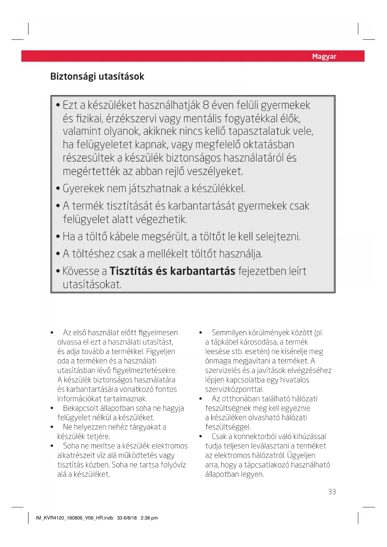 Gyerekek nem jatszhatnak a keszülékker. - A termek tisztítasát és karbantartását gyermekekCsak felügyelet alatt végezhetik.