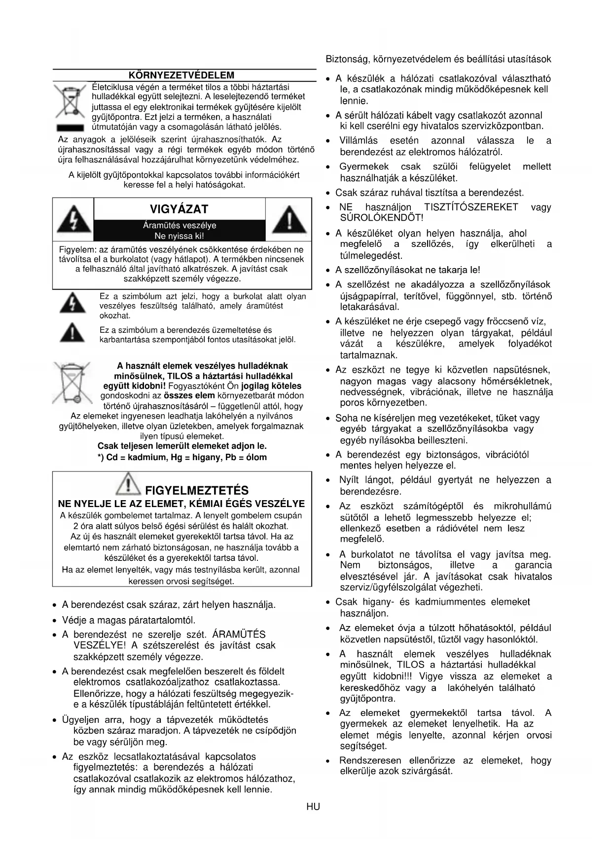 A berendezést ne szerelje szét. ARAMÜTÉS VESZÉLYE! A szétserelést és javíst csak szakképzett személy végezne. - A berendezestCsak megfeleloen beszerelt es foldelt elektromos csatlakozolzathoz csatlakoztassa. Ellenorizze, hogy a halozati feszultseg megegyezike a keszulek tipustablajan feltuntetett ertekkel.